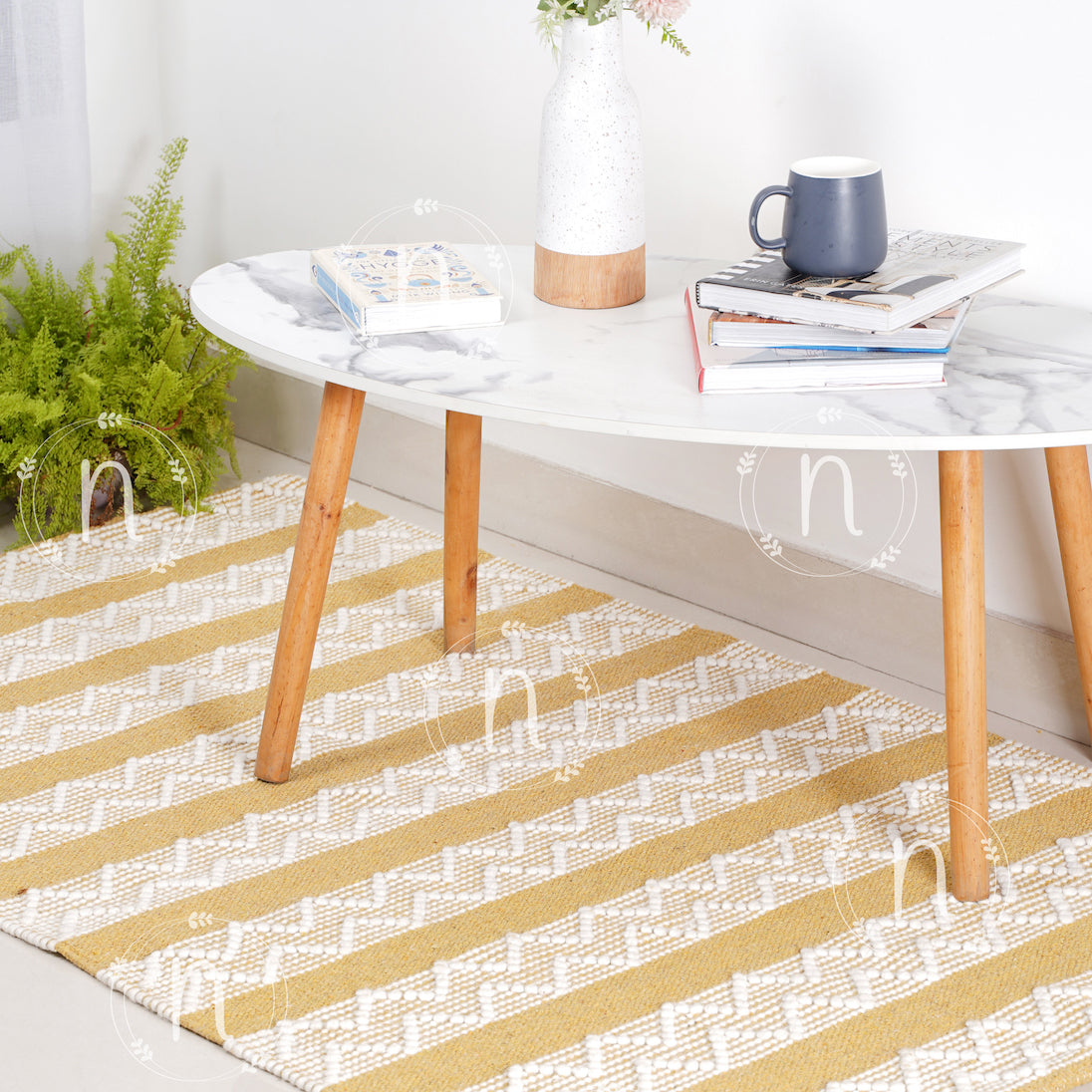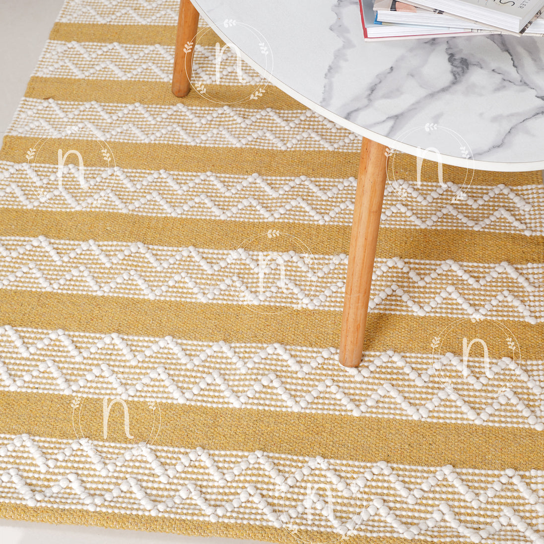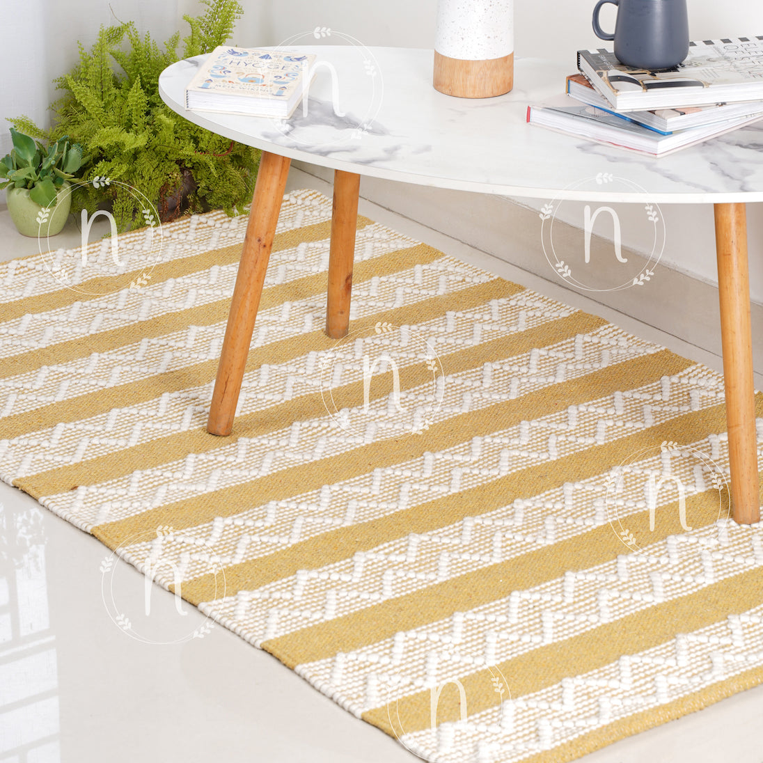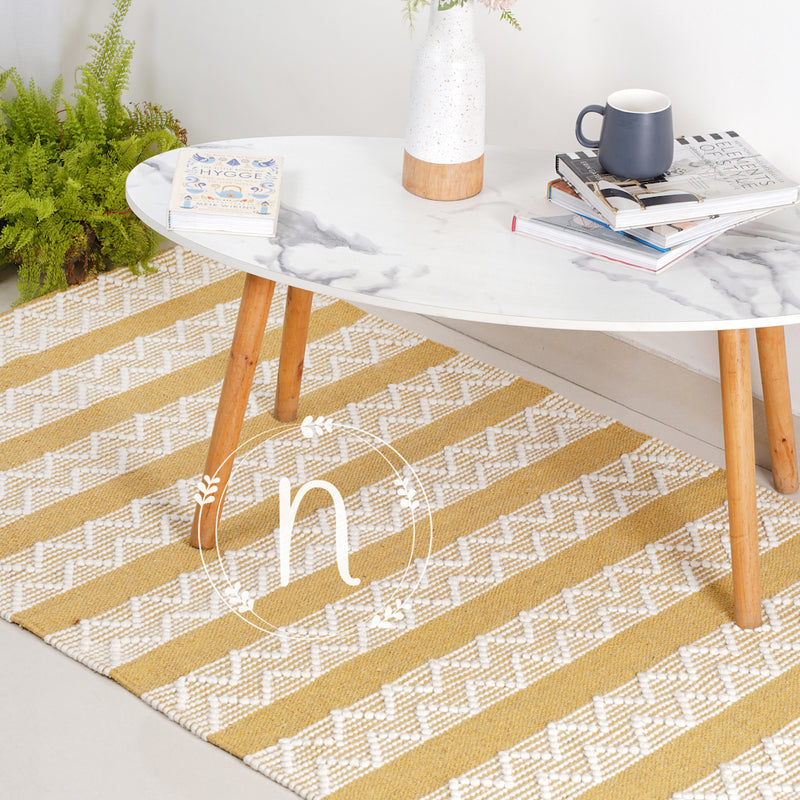 Cotton rug with striped and zigzag patterns to add a splash of colour to the room. The dhurrie carpet is an attractive shade of yellow and white, and handmade with soft fibres, and is sure to bring a modish boho vibe to the room. It serves great as an area rug.