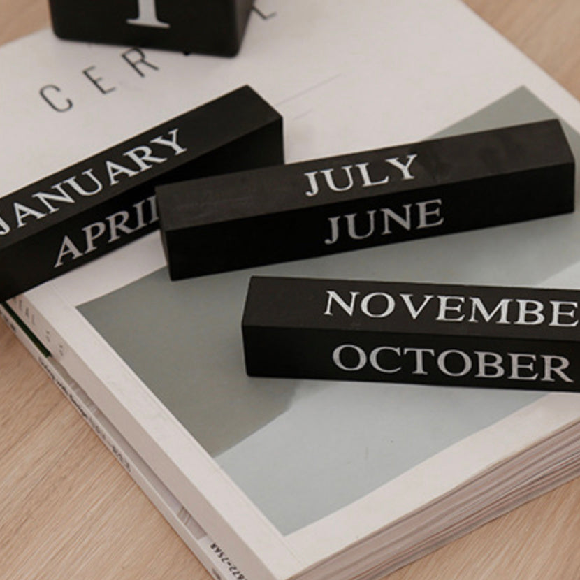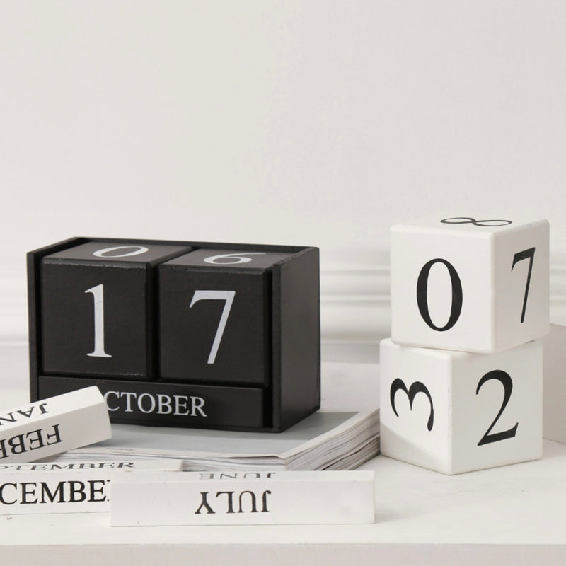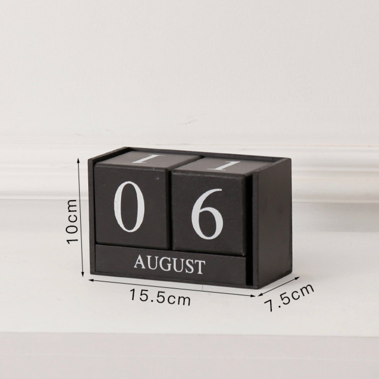 The wooden table calendar comes with two wooden numbered cubes which can be adjusted to show the current date as shown in the product picture. There are three rectangle cubes which can be adjusted to show the current month.