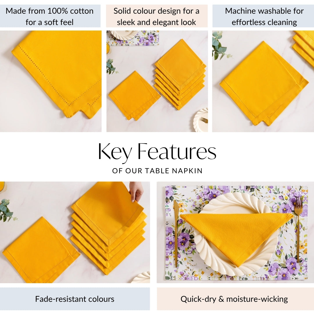 Design: Experience the simple beauty of this set of six sunny yellow napkins, perfect for adding a touch of brilliance to your table! Each one is perfectly square, giving a neat look. Along all sides, you'll find a delicate line of tiny stitched holes, a subtle detail that adds a touch of simple elegance and fine craftsmanship to the solid colourful. It's a clean and modern design that looks effortlessly chic, making your table feel instantly inviting and stylish.