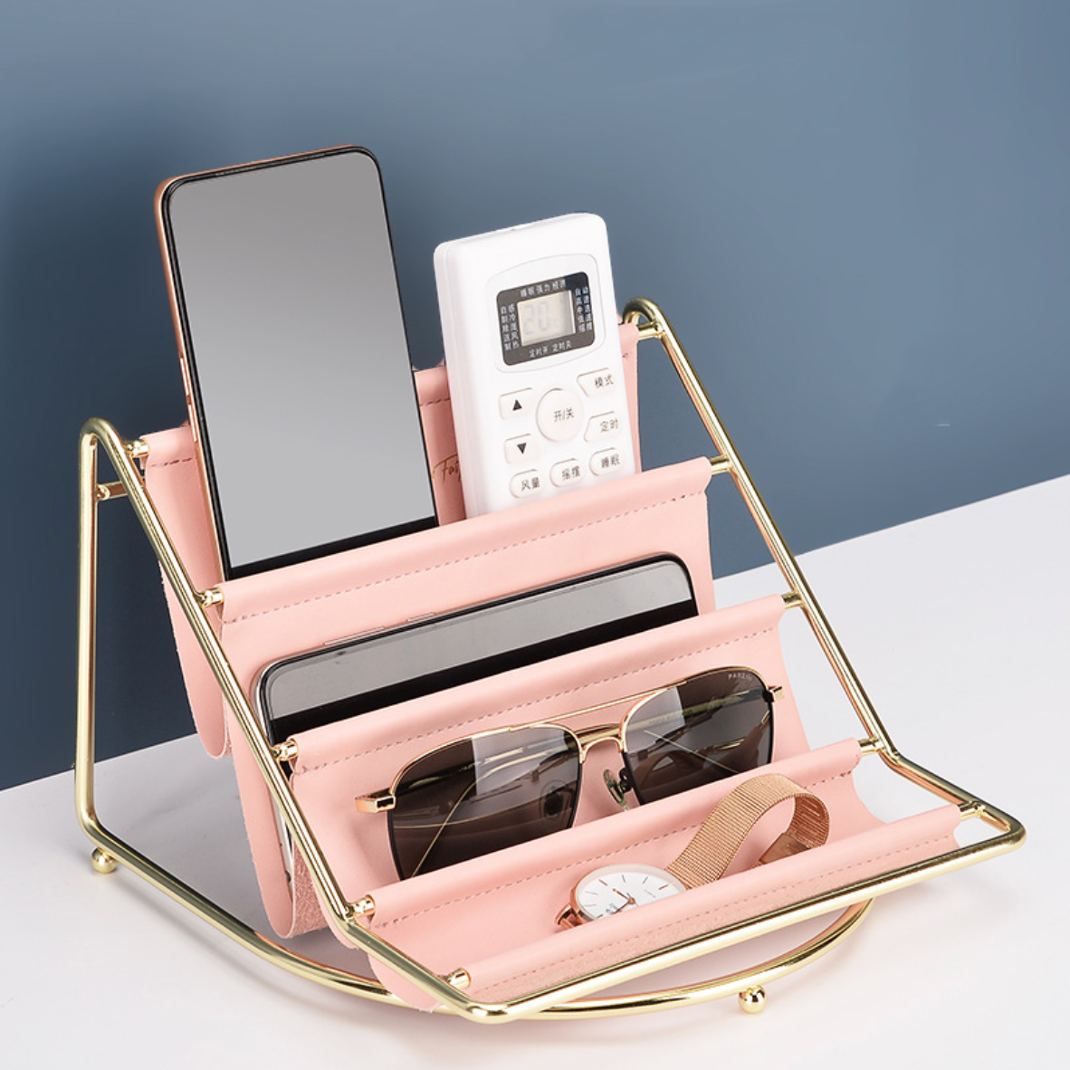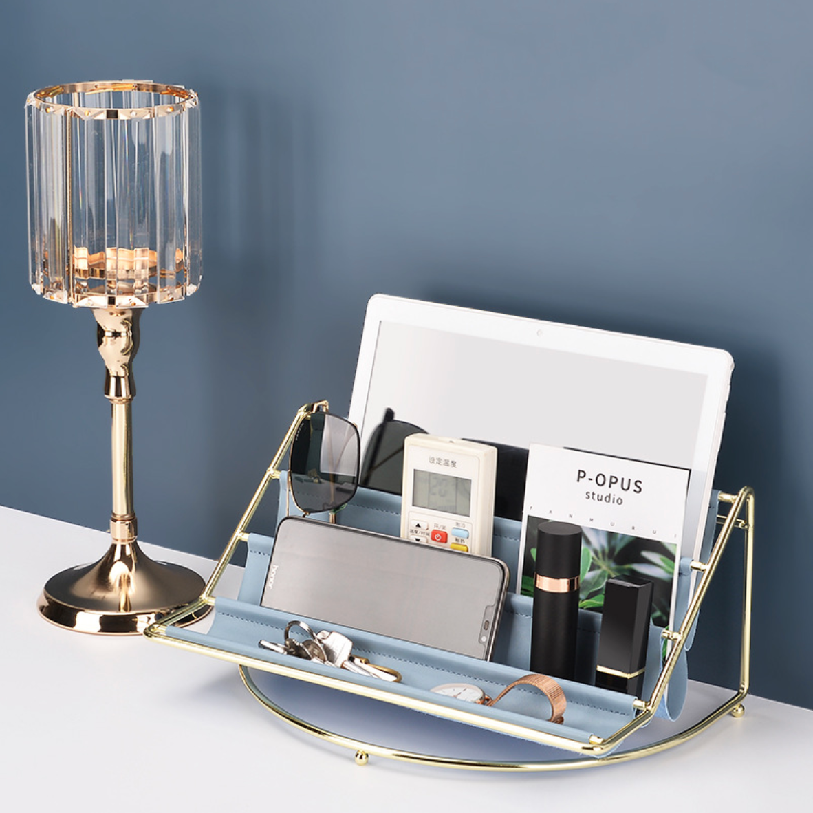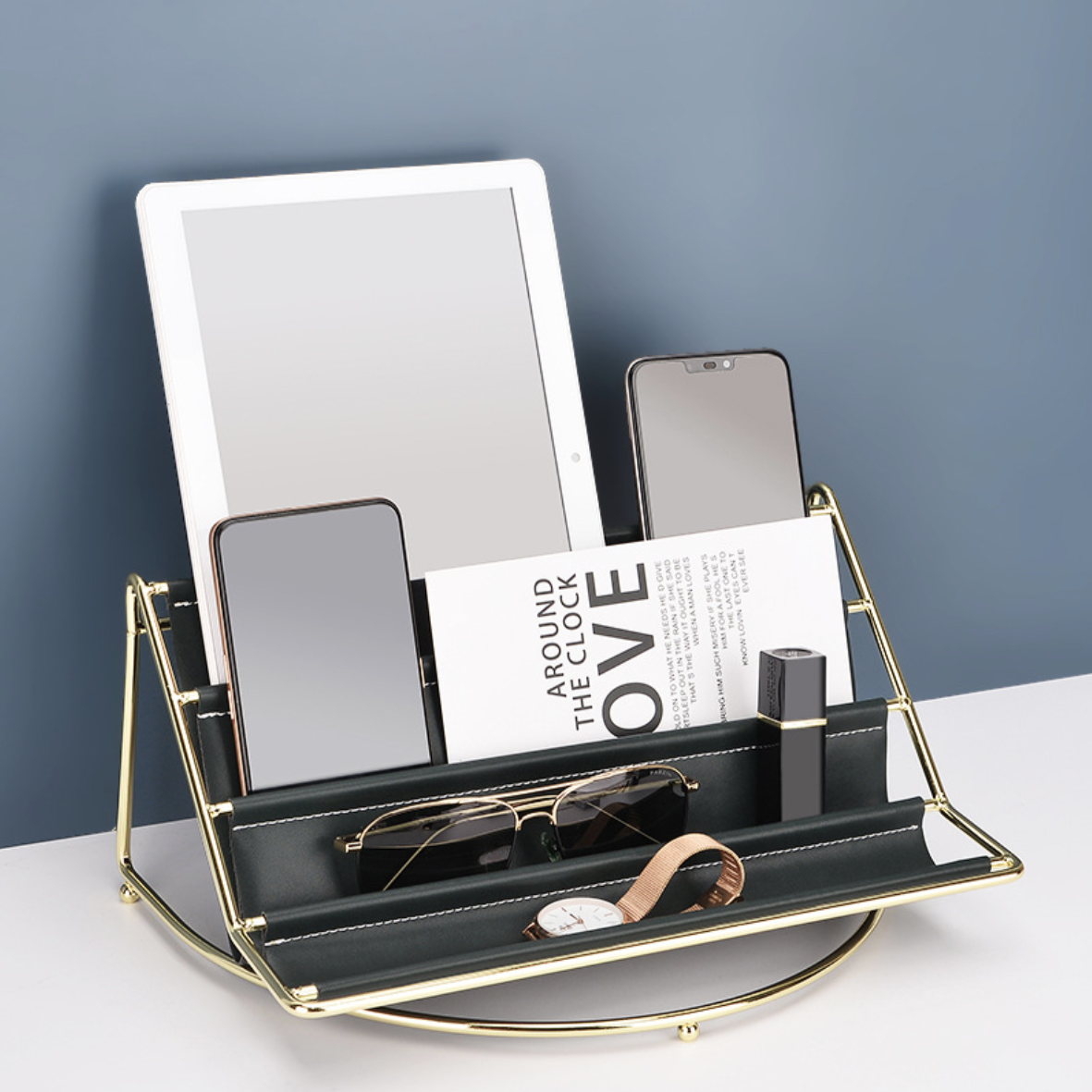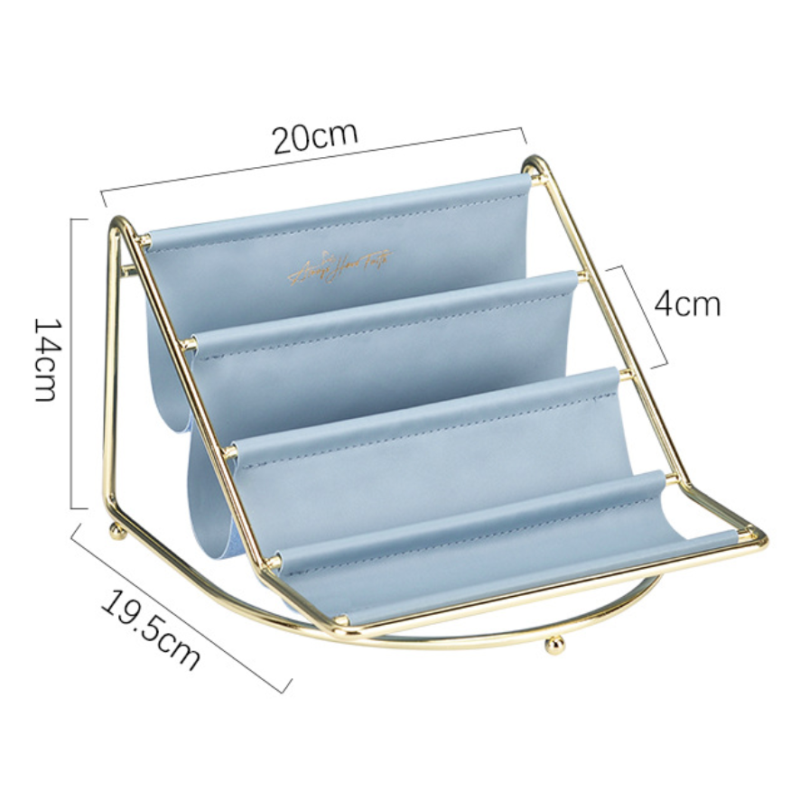 A luxury table organiser with three compartments made of a metal stand and a leather holder that breaks the rule of concept based designing. The tray is simply designed yet, it is novel and can be placed on any table top. It is suited for homes as well as for office setups for organising the table with everyday accessories or magazines. The combination of leather and metal is a sheer luxury.