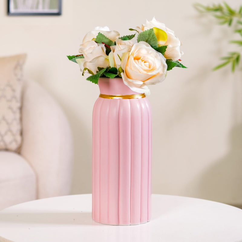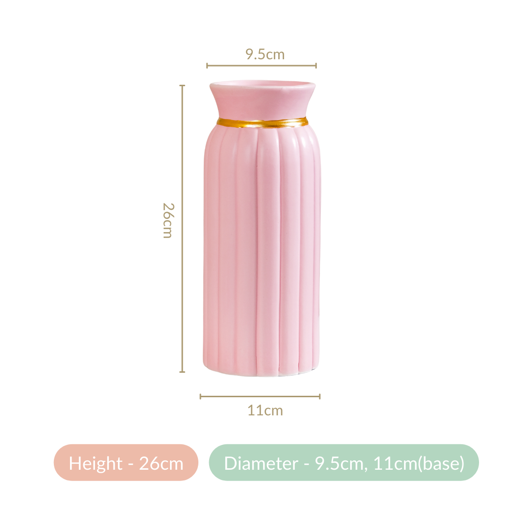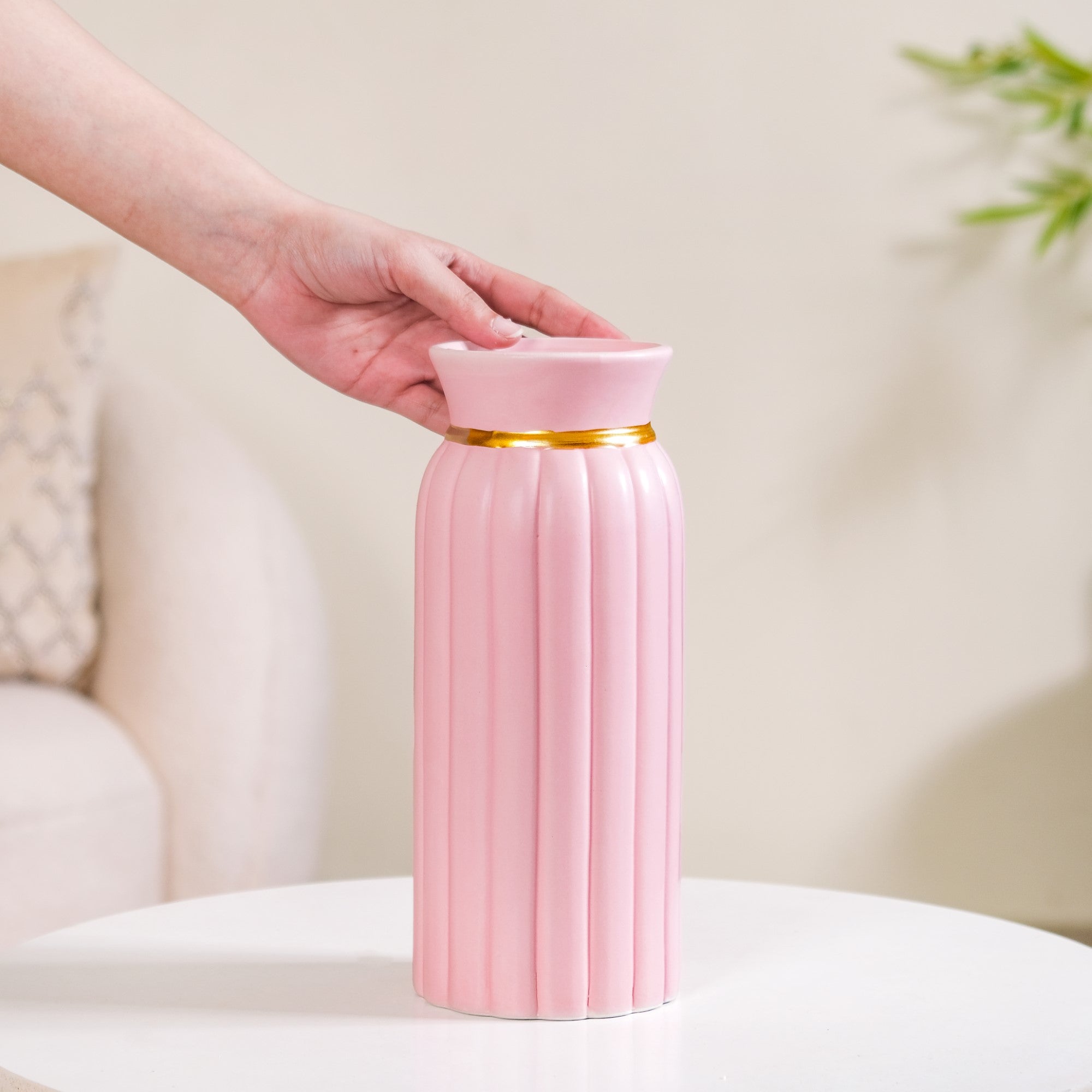 Transform your living space with our exquisite tall ceramic flower vase, delicately shaded in subtle pink. Meticulously fashioned from premium ceramic, it boasts intricate ribbed textures on the exterior and a timeless golden accent around the neck, embodying enduring beauty. Ideal for showcasing artificial or dried blooms, it injects a burst of color and sophistication into your surroundings.