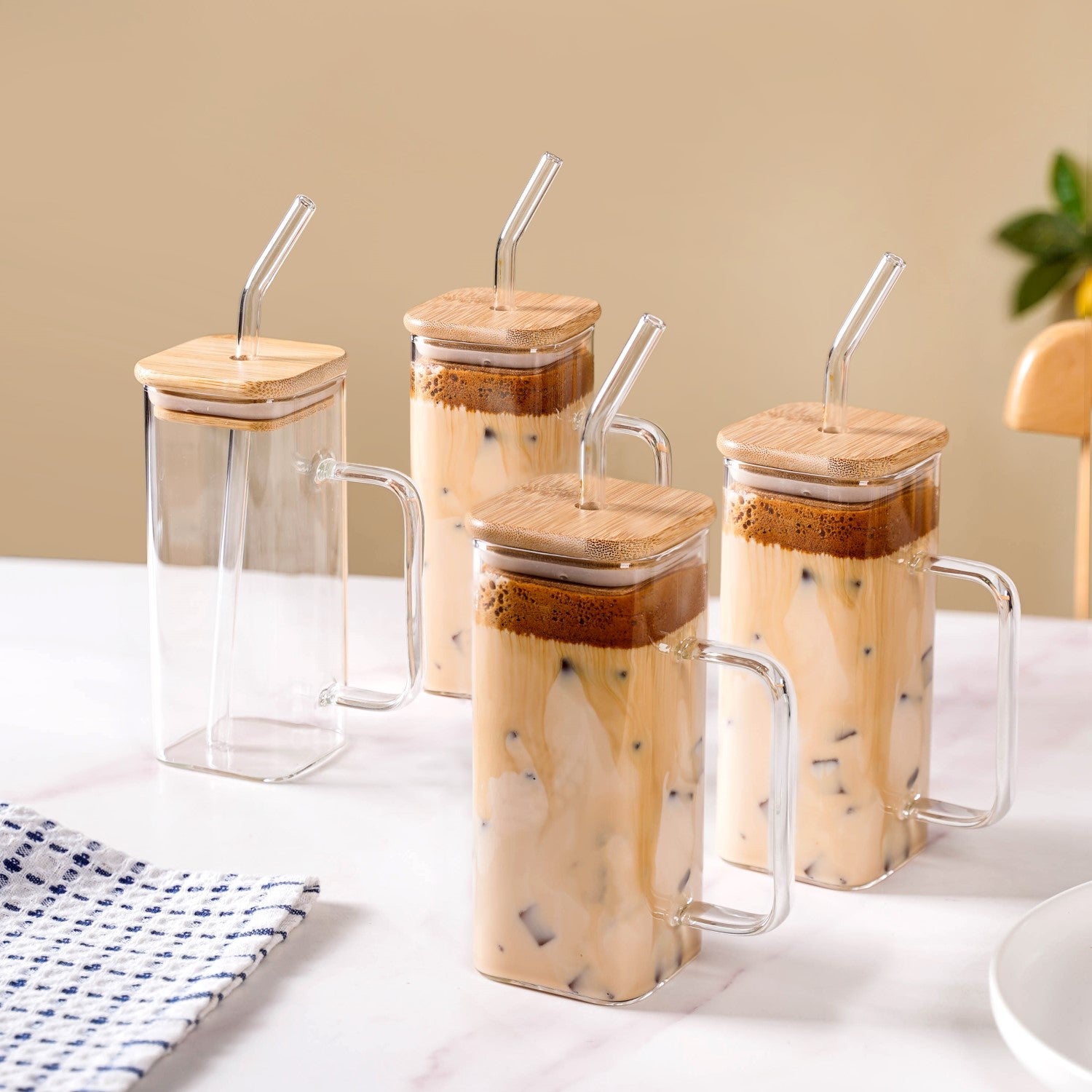 Design: These sipper jars, crafted from high-quality borosilicate glass, are tall and rectangular with subtly curved corners for a refined, contemporary look. Featuring smooth, ergonomic handles, they offer an easy grip for comfortable sipping. The vacuum-sealed bamboo lids ensure freshness, while the set also includes glass straws for a sustainable sipping experience.