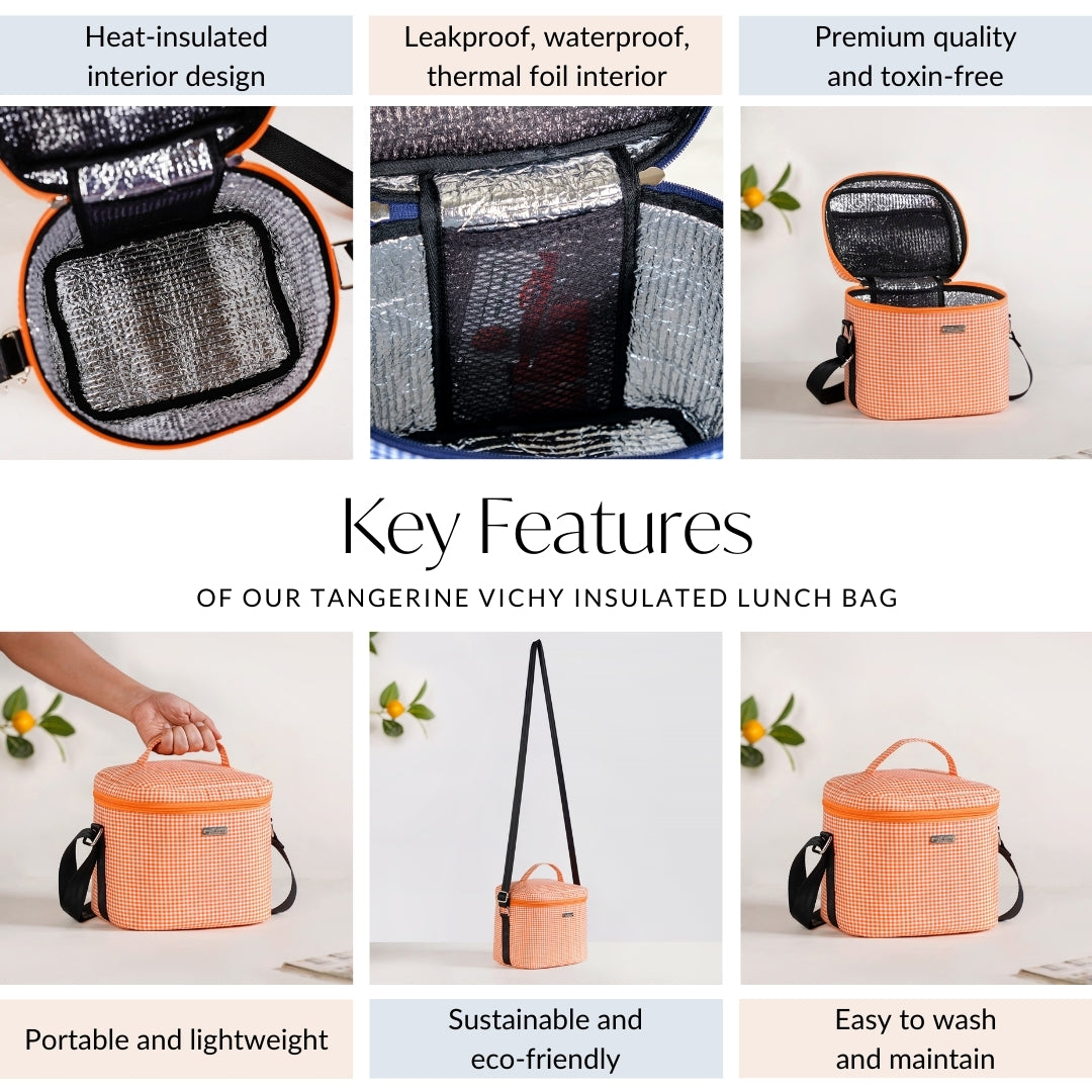 Design: Featuring a vibrant tangerine vichy pattern, this lunch bag has a soft, cushiony exterior that not only looks great but also offers durability. The smooth dual-zipper closure ensures easy access, while the stitched top handle and adjustable shoulder strap provide versatile carrying options. Inside, the insulated lunch bag is lined with a high-quality thermal layer that maintains the temperature of your food, keeping it hot or cold for hours. With two convenient net pockets, there’s ample space to store a cutlery set, napkins, or small snacks, making mealtime hassle-free and organised.