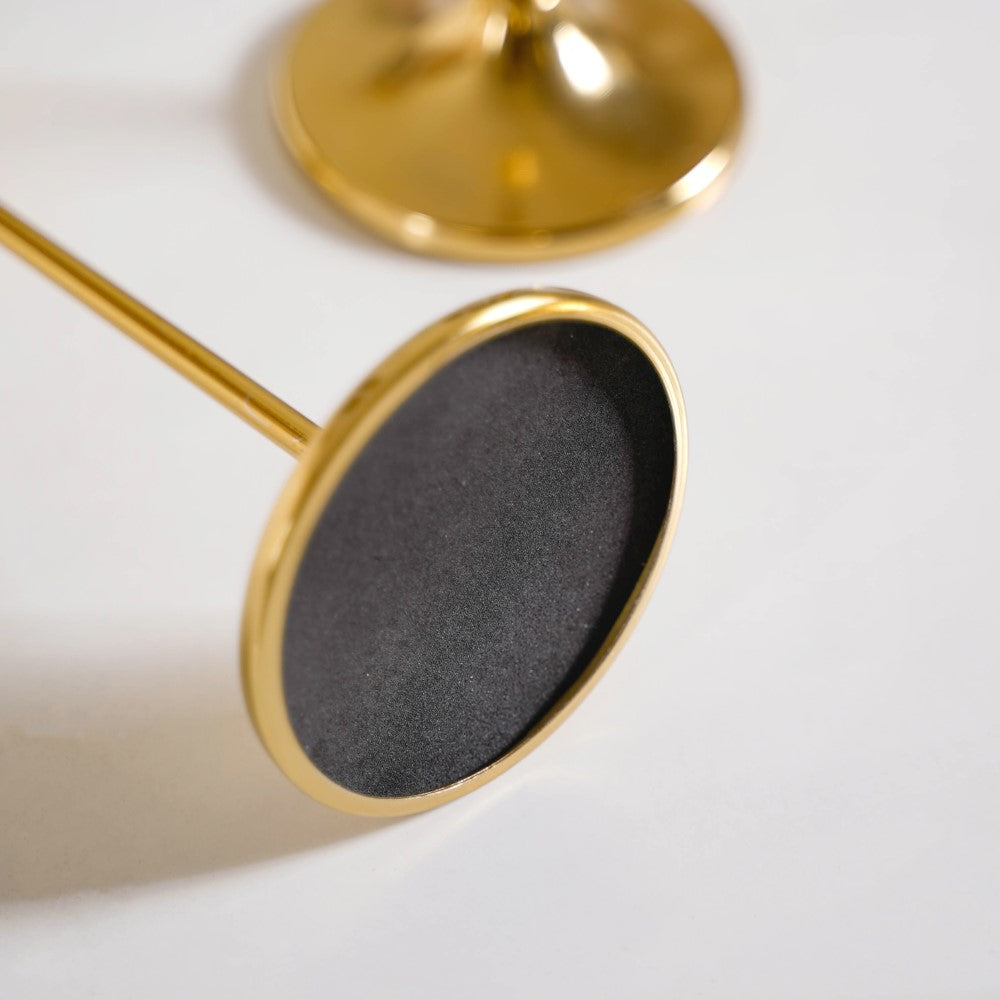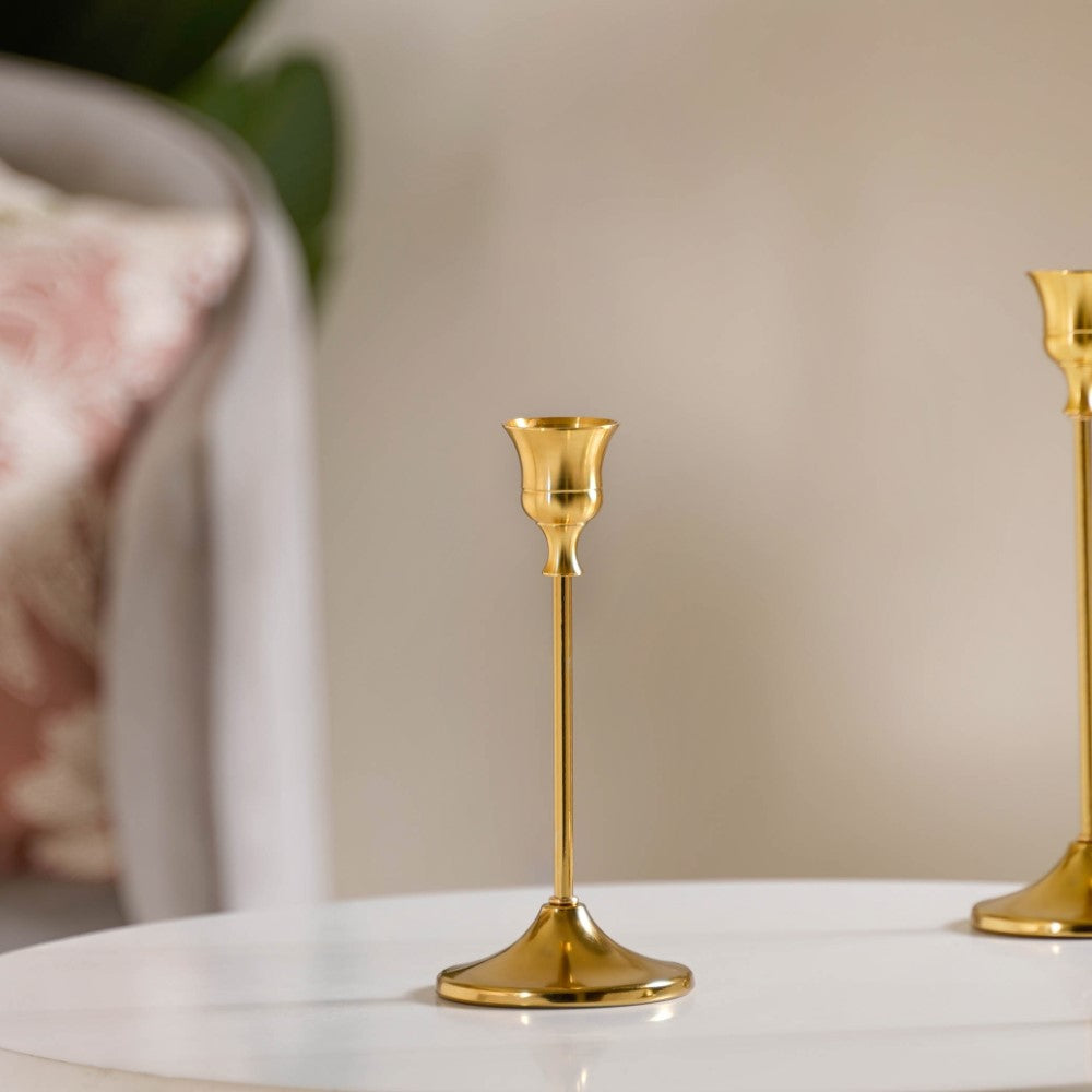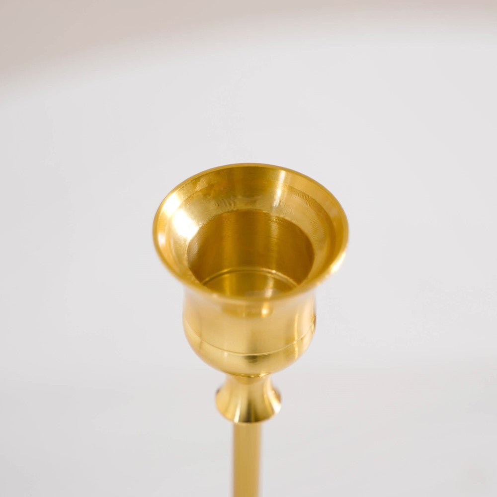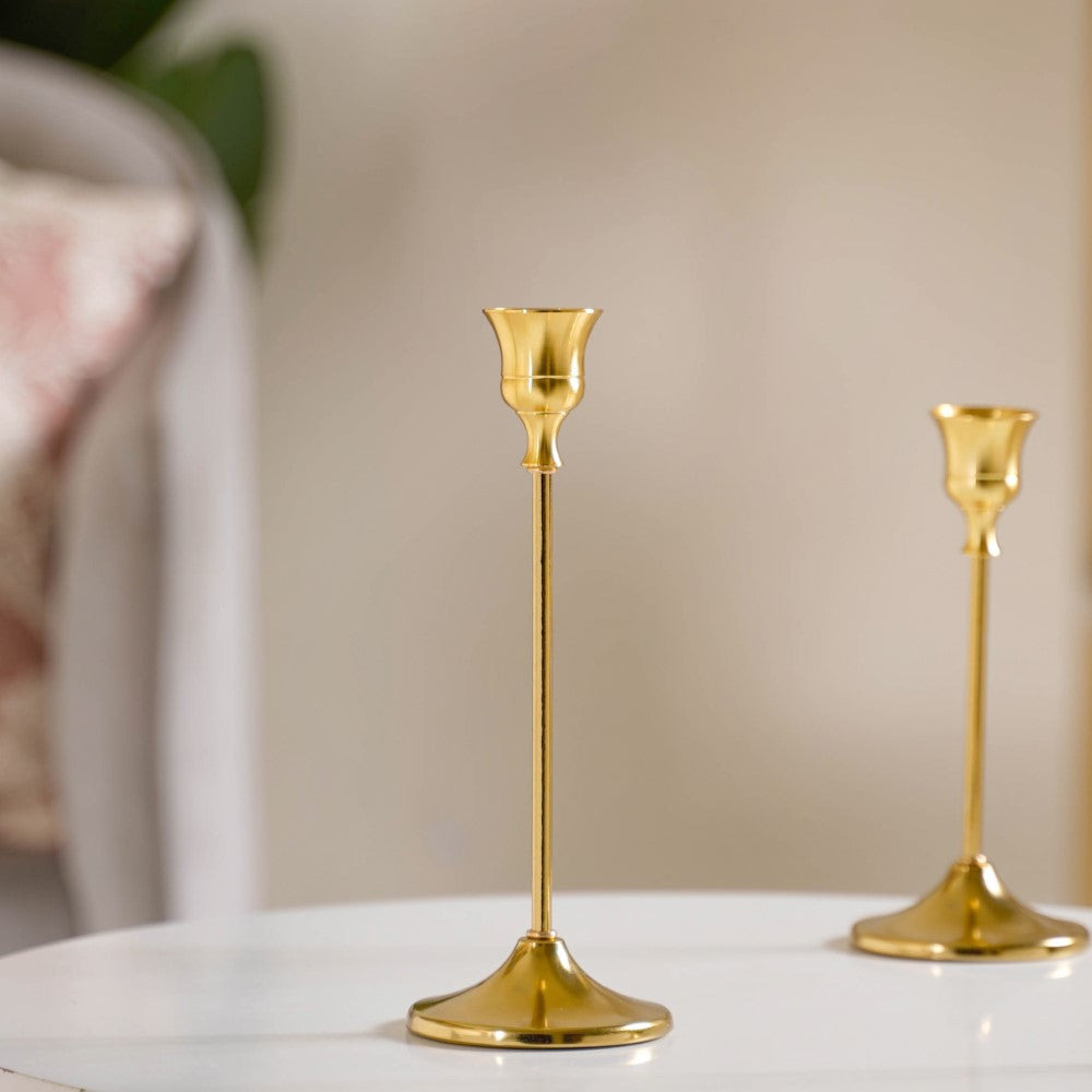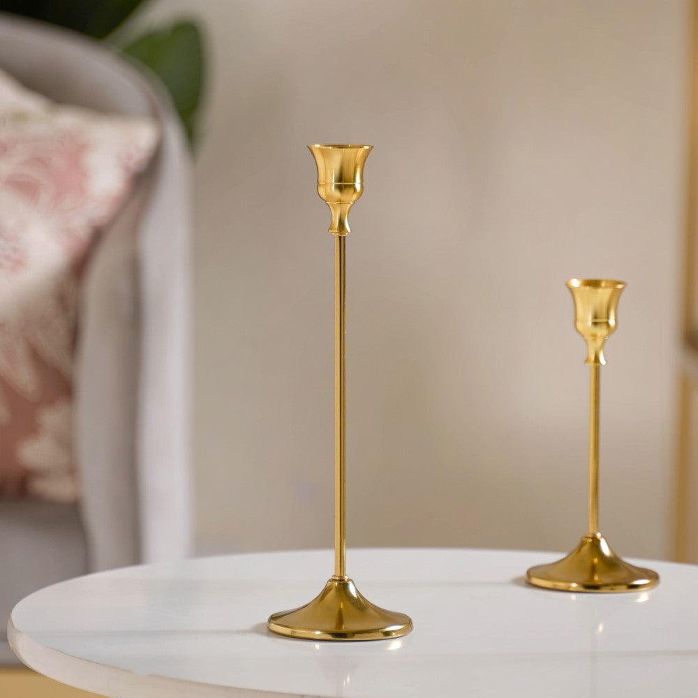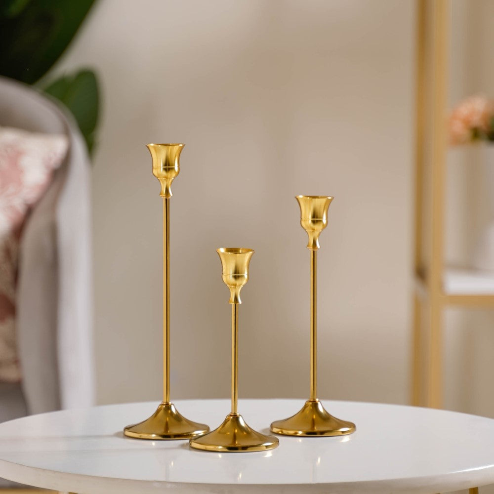 Experience the harmonious fusion of practicality and stunning aesthetics with our exquisite set of metal candle holders. Designed to seamlessly complement any contemporary and minimalistic room setting, these candle stands emanate a sense of timeless elegance. The set comprises three taper candle holders, each boasting a unique size, adorned with a captivating golden sheen. Meticulously crafted from premium-grade metal, these holders ensure both durability and sophistication. Rest assured, their robust round bases guarantee unwavering stability, preventing any mishaps that may occur on surfaces. As the candles illuminate the surroundings, the gleaming metal exteriors serve as mirrors, producing a mesmerizing interplay of light and shadow, creating an enchanting atmosphere perfect for fostering romance.