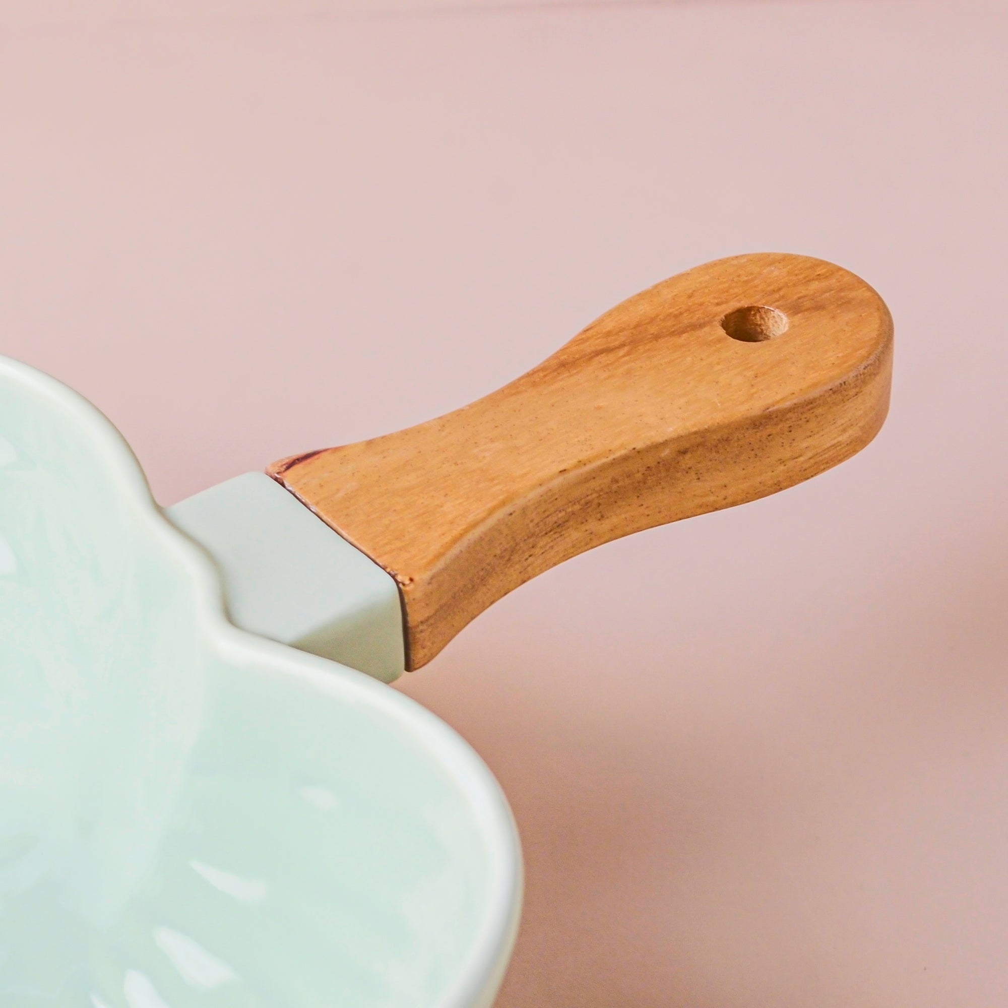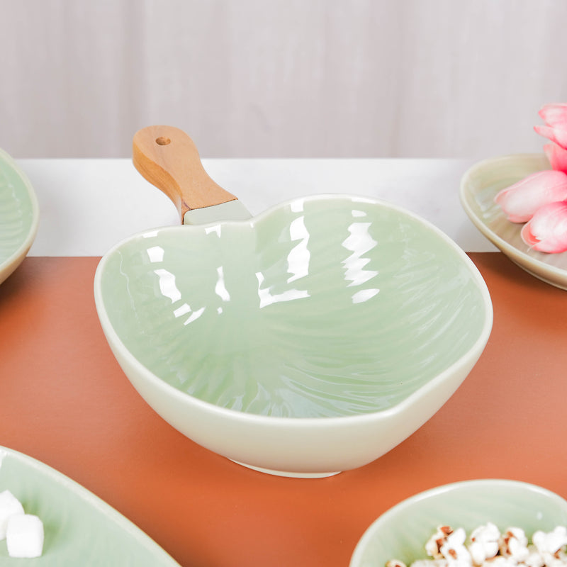 Taro leaves are the hubs of all good nutrients and proteins that a body needs, and the Taro bowl with handle is ideated and created keeping in mind that very aim- for you to enjoy a healthy meal with your family and friends. The Taro leaf-patterned bowl with handle is here to serve nutritious and scrumptious food directly from the kitchen onto the dining table. With a robust wooden handle, the leaf-like structural serving bowl is easy to carry and pass around the dinner table. The bowl with handle has a sizeable area for holding food, especially liquids to minimize spills, and has a vein-like texture that is evident on the surface of a Taro leaf, thereby elevating its style. The simple yet enticing green hue of the bowl is the chief goal scorer of the dining game. Soup, lentils, and curry meals can all be served in the green serving bowl. The bowl may also be used to serve noodles or snacks.