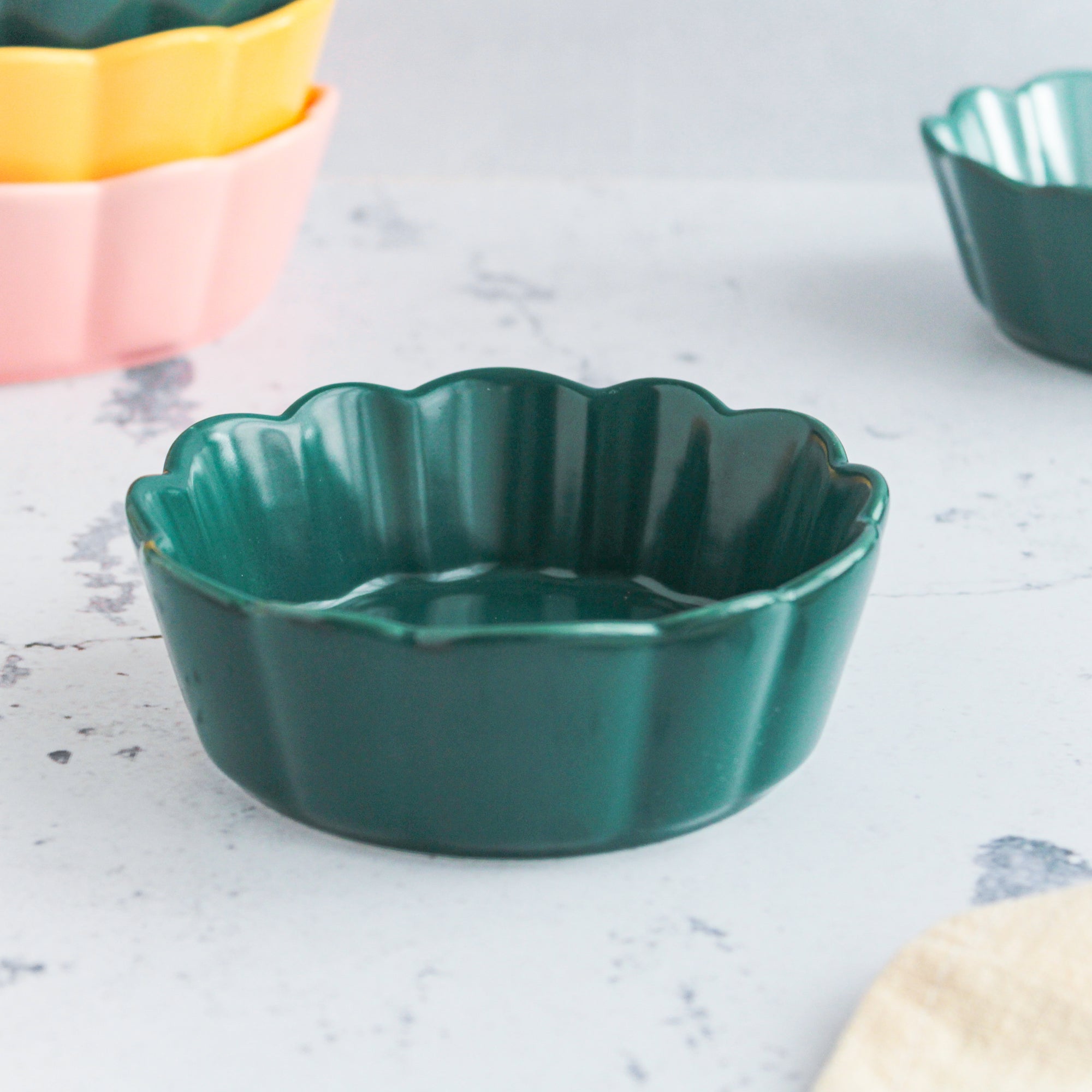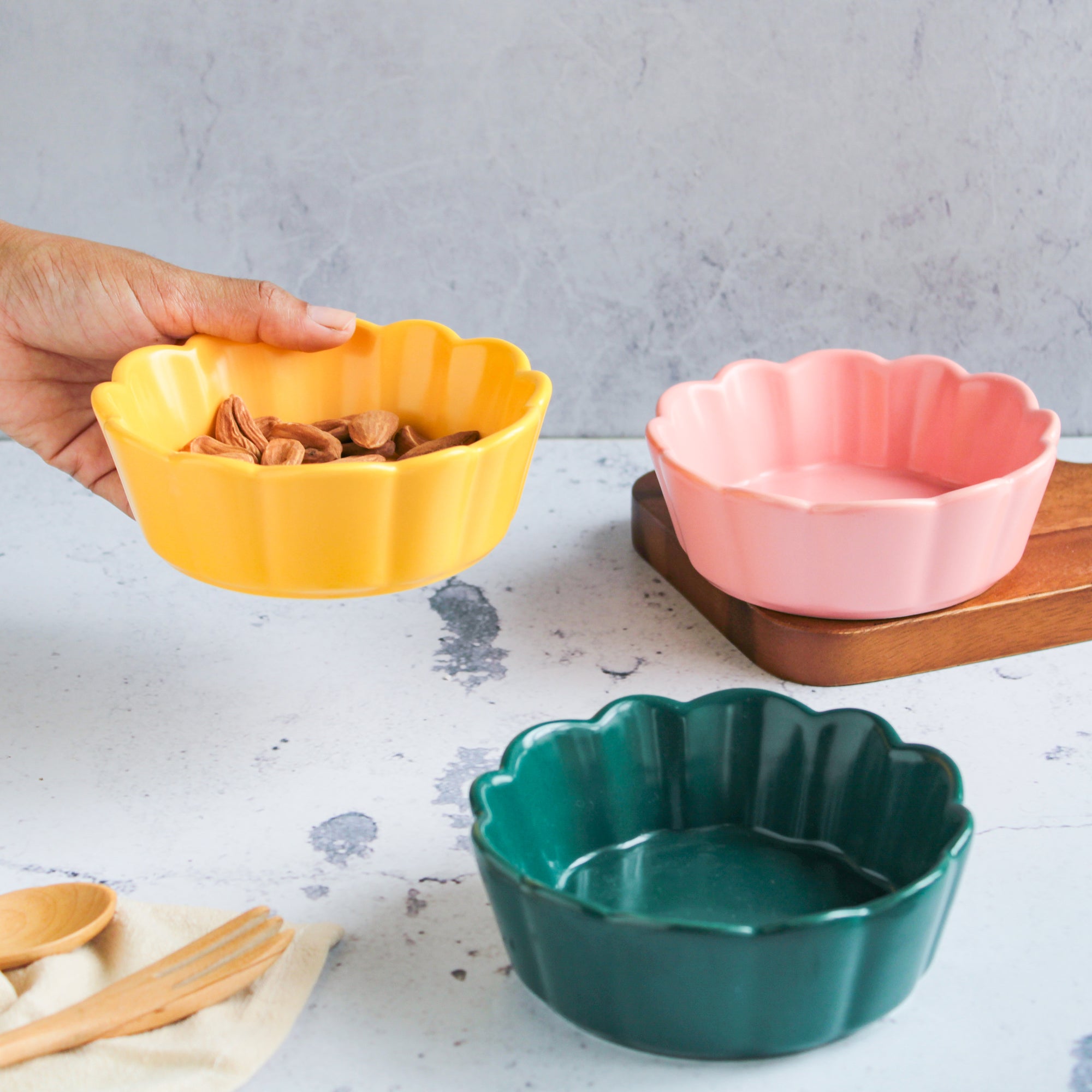 Tart pan or tart plate that comes in three colours. The unique floral design of the bowls make for a refreshing addition to any kitchen set and can be used to plate up a quick breakfast, or used as fruit bowls. Use the pie dish to bake tarts or pies as the dishes are oven, microwave and dishwasher friendly. The tart baking plates also make for great salad or dessert serving plates that can also be gifted to the dear ones.