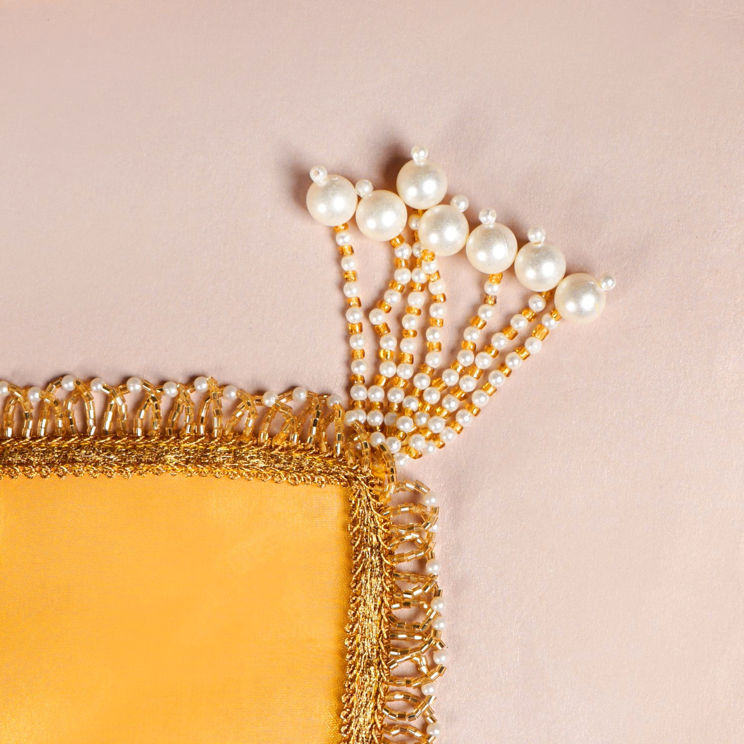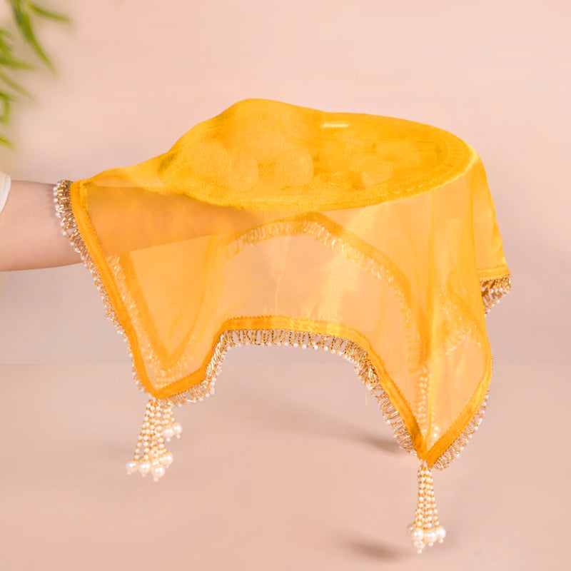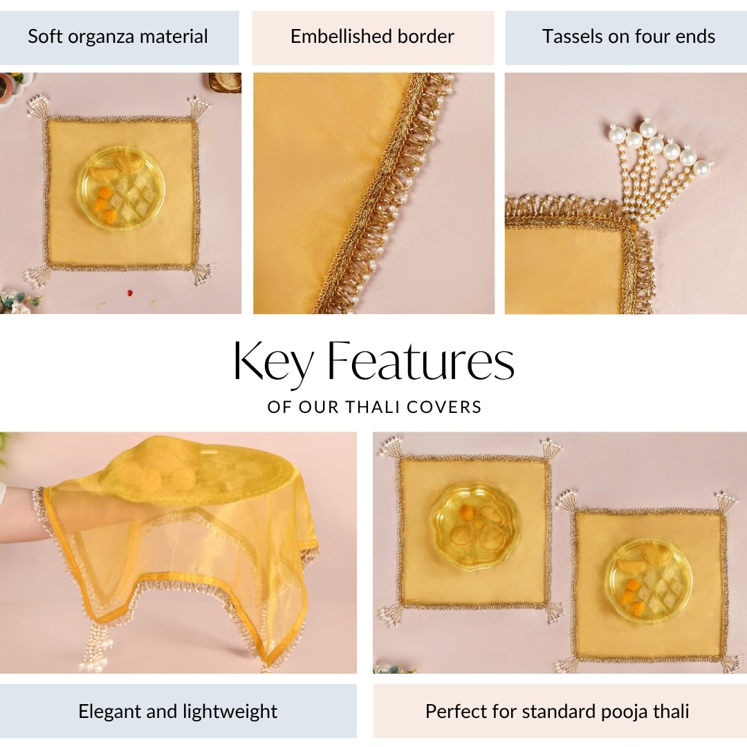 Benefits: The soft fabric protects the thali from dust while letting the contents stay visible. The square shape covers all standard shagun thali sizes effortlessly. Its foldable nature makes it easy to store between occasions. Faux pearls prevent the cover from flying off. The embroidered design adds charm and consistency to festive and spiritual settings alike.