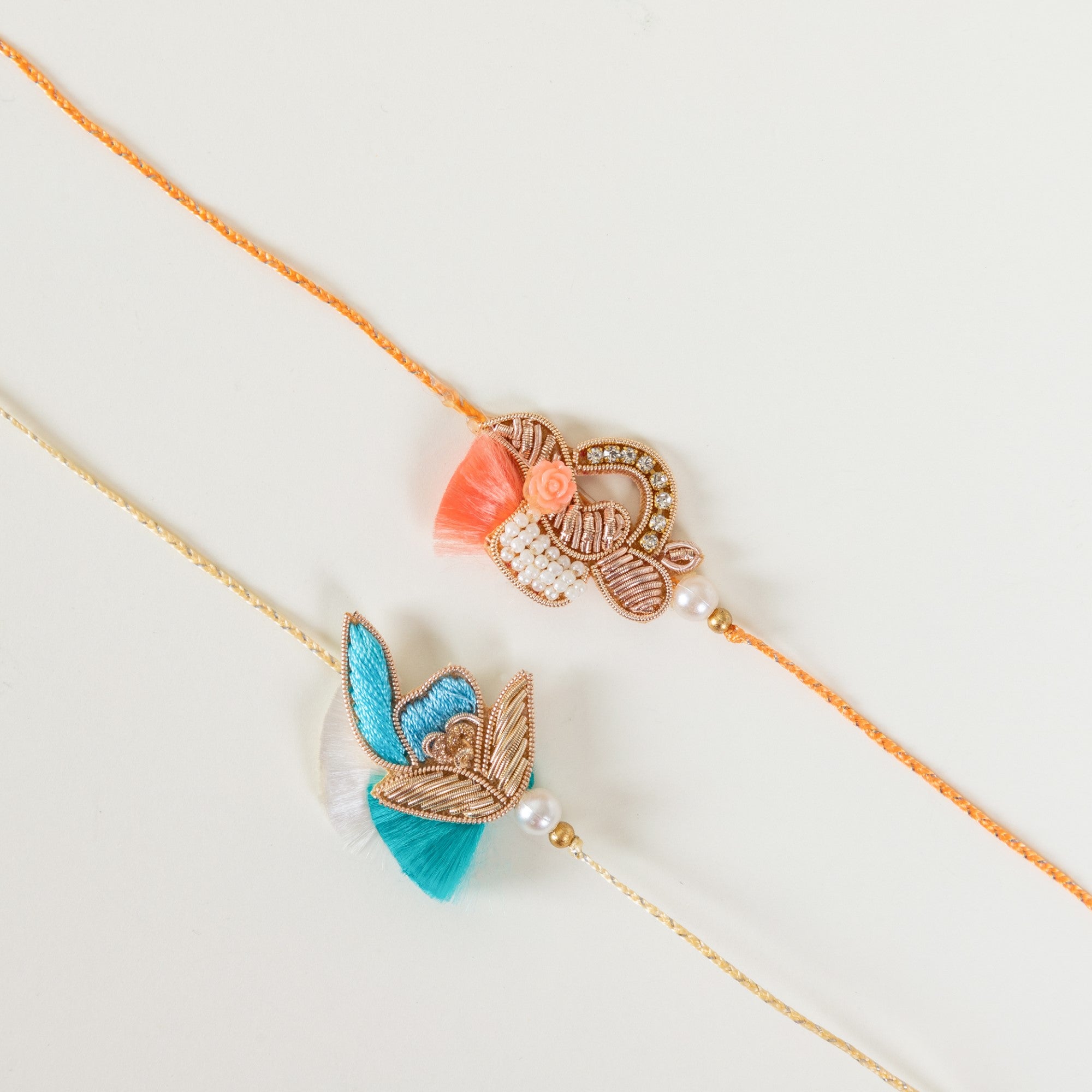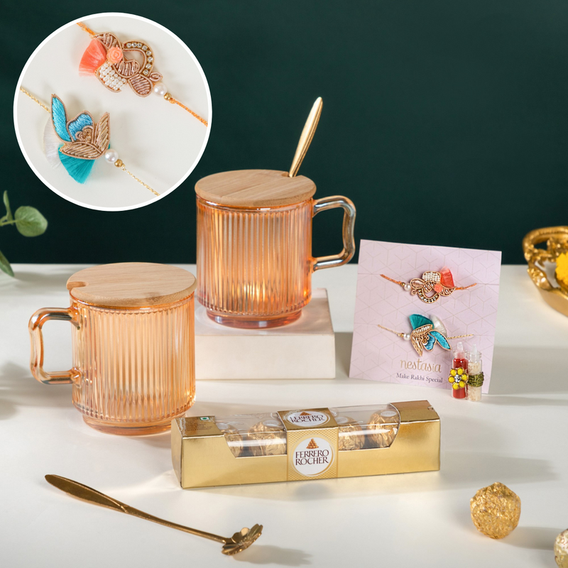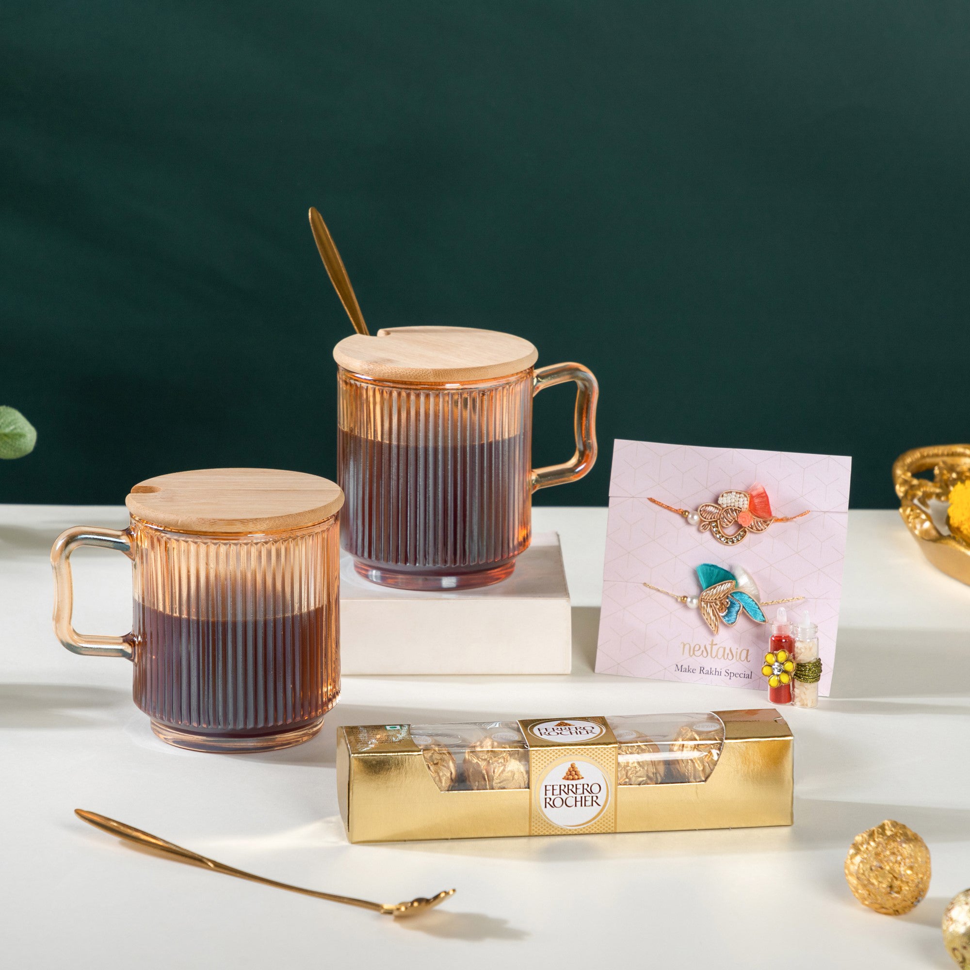 Celebrate the joyous occasion of Raksha Bandhan with our delightful Rakhi gift hamper. This thoughtfully curated Rakhi hamper is perfect for expressing your love and affection for your sibling. It includes a set of 2 elegant glass mugs with lids and spoons, ideal for sipping coffee or tea together. The Rakhi hamper also features a Roli and rice bottle set, essential for performing traditional rituals. Enhance the festive spirit with the set of 2 beautiful rakhis in peach and blue hues, symbolizing the bond between siblings. To indulge in sweet moments, we've added a pack of irresistible Ferrero Rocher chocolates. This Rakhi gift hamper is a wonderful way to celebrate the cherished moments of Raksha Bandhan.