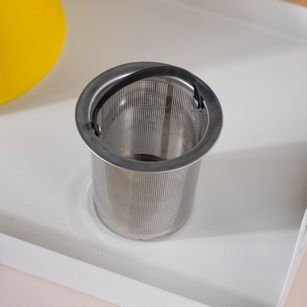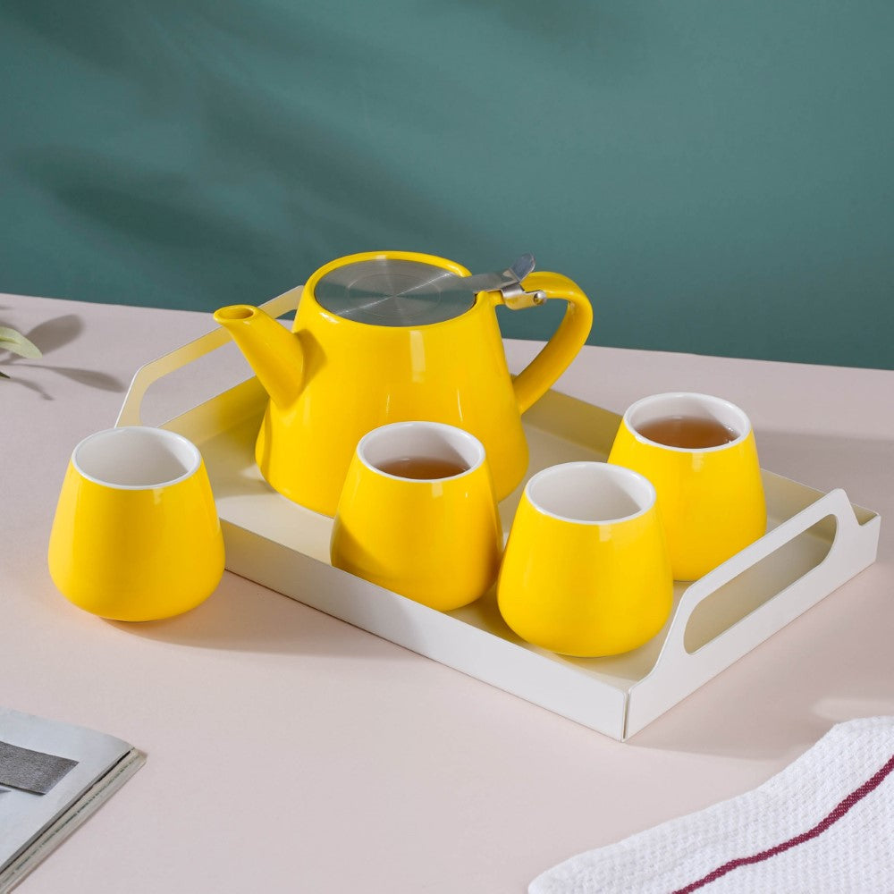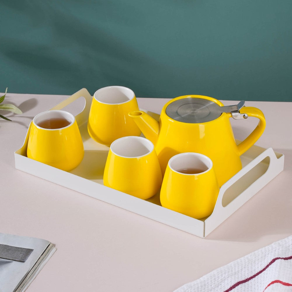 The tea serving set comes in a bright yellow colour. The tea set includes a tea pot, four tumblers, and rectangle serving tray. While the trays can be used for serving tea or coffee, they can also double up as snack platters which can elevate the drinking experience. The drinkware set can be used to serve hot as well as cold beverages. The kettle cannot be placed in the microwave oven or dishwasher.