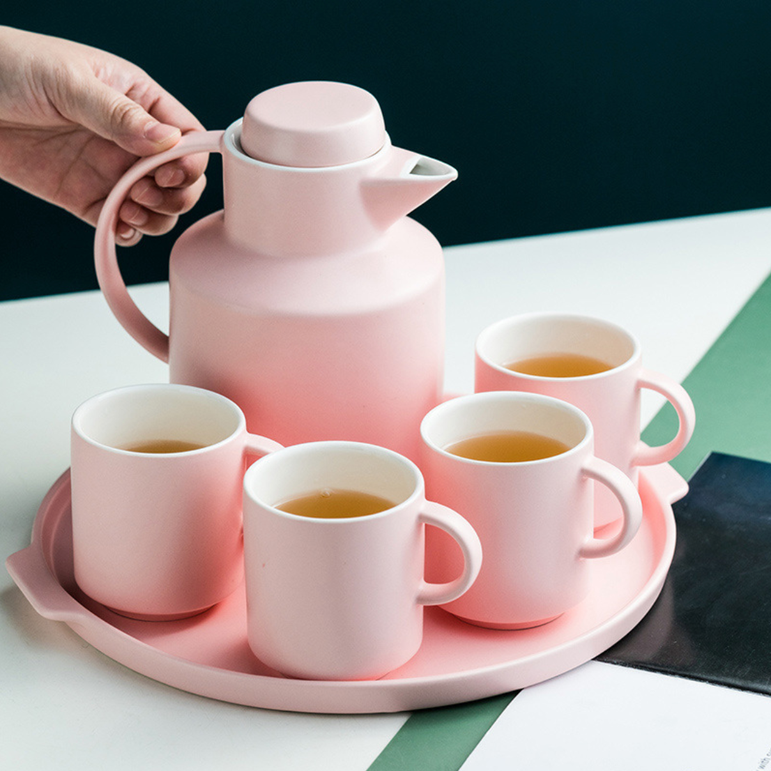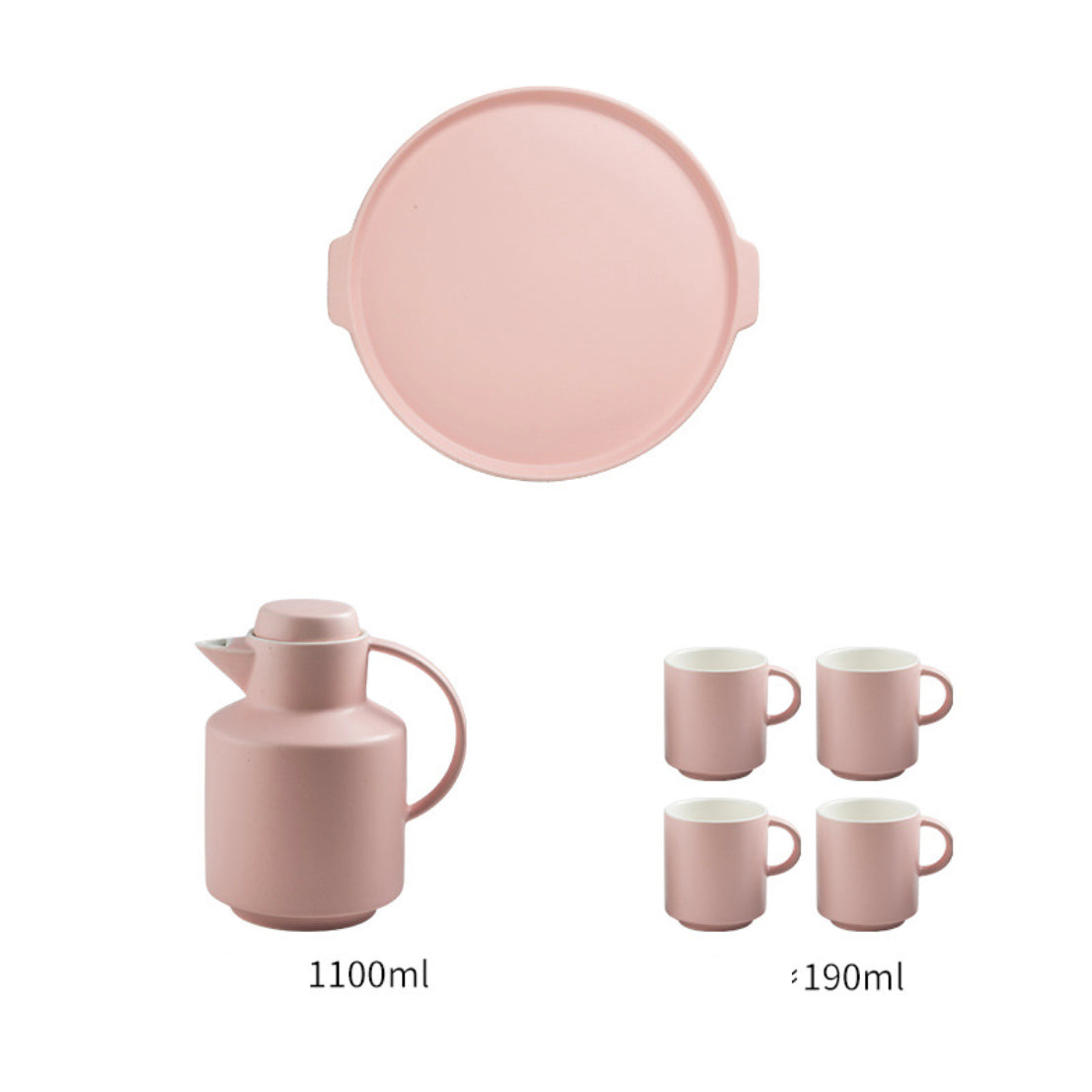 Pink tea set with a vintage shaped tea pot, four mugs along with a serving tray. The tea serving set can be used to serve hot as well as cold beverages like tea, coffee, juice, and soda. The tray doubles up as a snack platter when not being used as a serving tray.