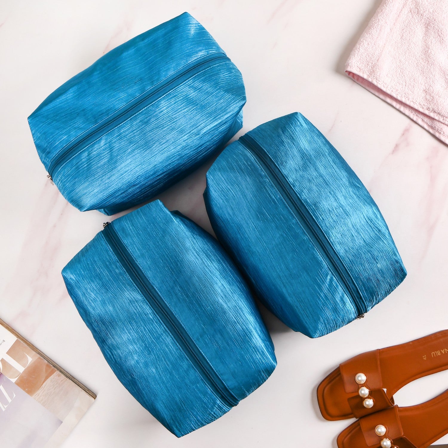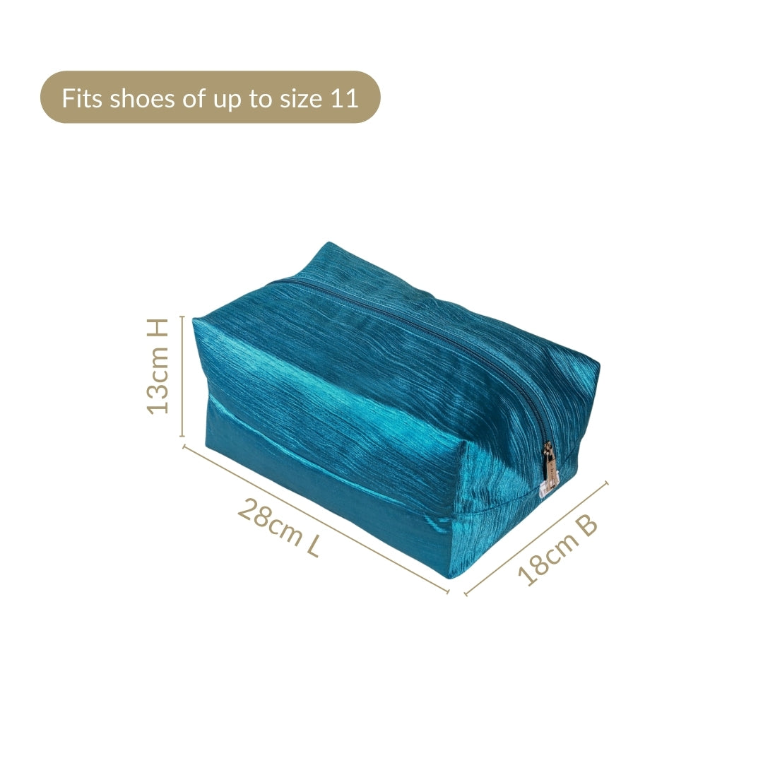 Design: Crafted in a soothing teal shade, these travel shoe pouches feature an elegant ice-crushed exterior texture that adds a touch of sophistication. The smooth zipper enclosure ensures secure storage, while the collapsible design allows for easy packing when not in use. Ideal for packing sneakers, sandals, loafers, or even heels while preventing dirt from spreading to other items in your luggage!