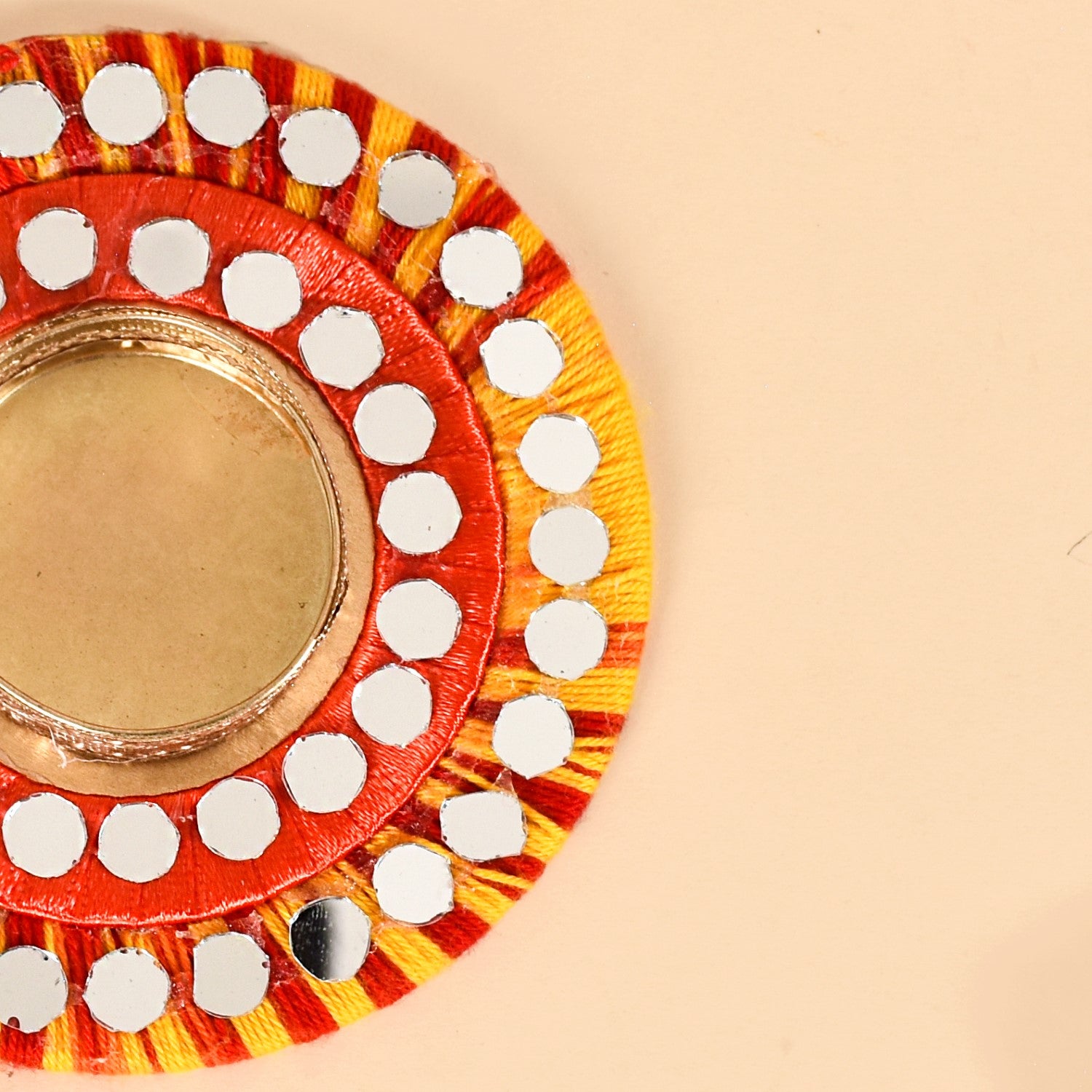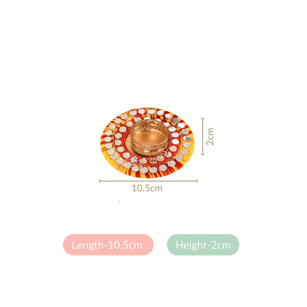 Design: The tealight candle holders showcase a circular foundation covered in yellow and red threadwork. The sheet metal casing with intricate cutwork further complements the pieces, exemplifying expert craftsmanship. Topped with fine mirrorwork that amplifies the light and considerably enhances the radiance, these delightful tealight holders are a total vibe.