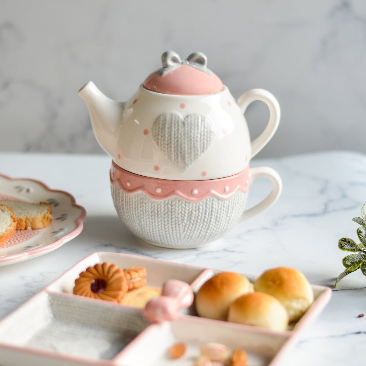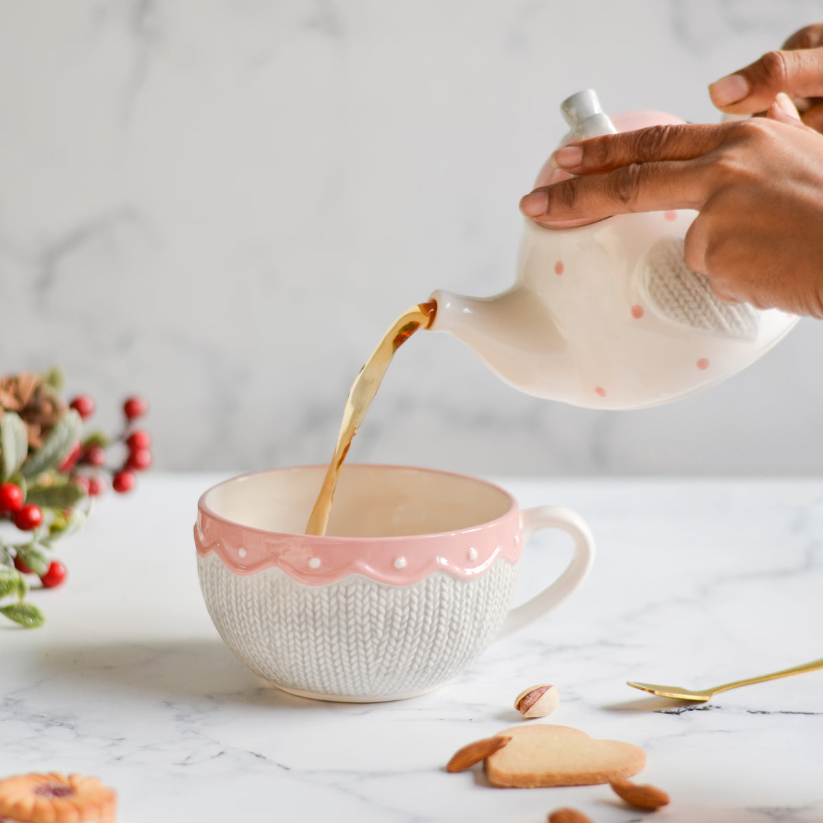 Teapot cup set in pastel colours white, pink and grey and textured surface. The teapot set can be used for a serving of tea, coffee or even milk. The cappuccino cups can be used as coffee cups or breakfast cups for having cereal with milk. The teapot can be stacked on the cappuccino cup that makes the tea set a must have addition to the collection.