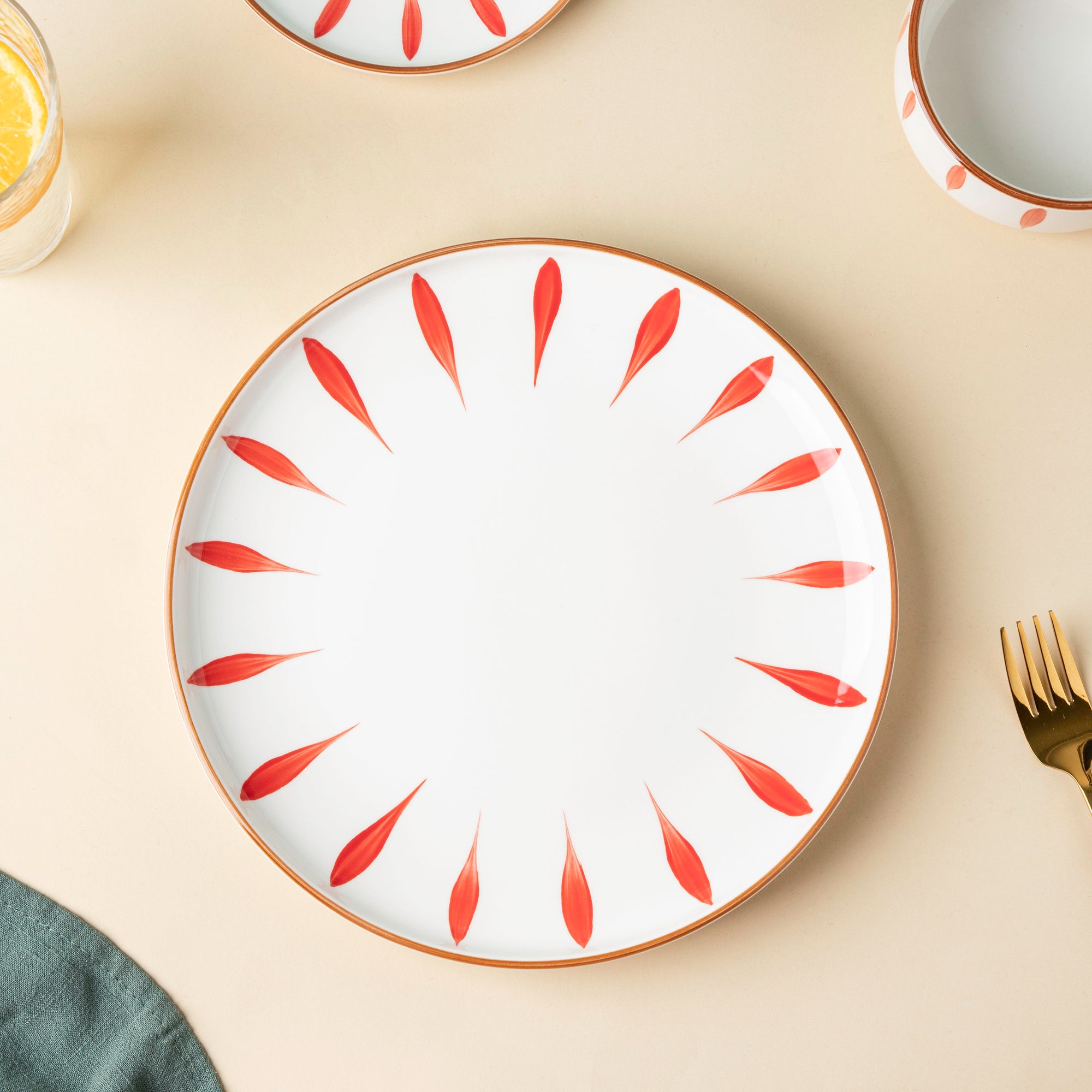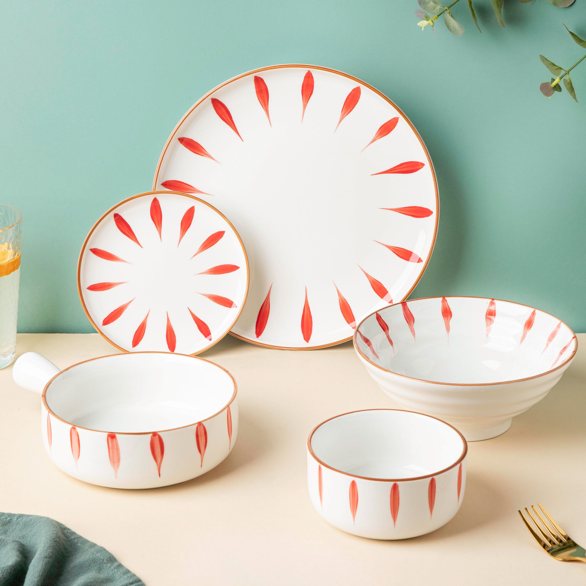 The popular Paisley teardrop is a reflection of an ornate and luxurious progressive bohemian taste. The powerful red-filled teardrop is set to invigorate the souls with the heightened flavor and fragrance of the food served on it. The ceramic set might get red-lettered as it would be difficult to take one's eyes off the 6 dinner plates, 6 snack plates, 6 dessert plates, 2 small serving bowls, and 1 bowl with handle, all rendering the passionate paisley- a favorite of Beatles and John Lennon.