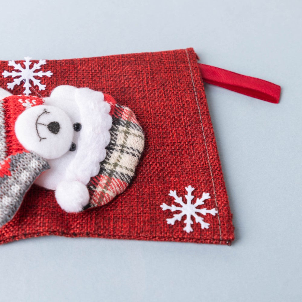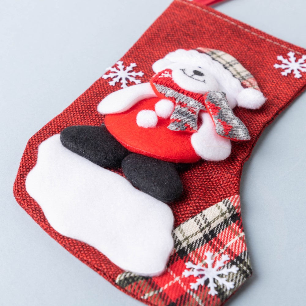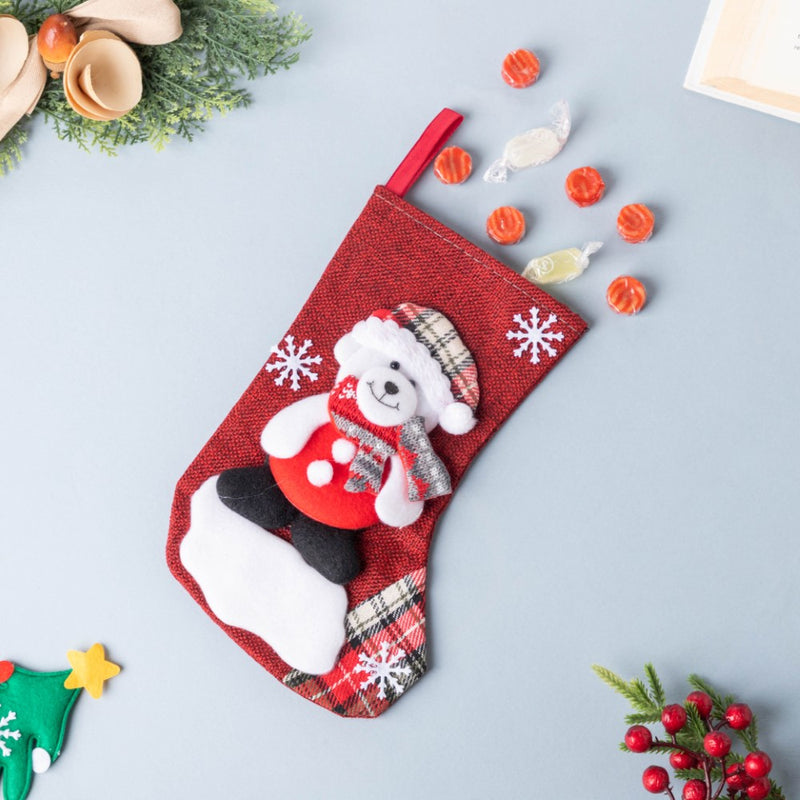 The Christmas stocking can be used on Christmas eve; hang a Christmas stocking from the fireplace and fill it with gifts. The soft Christmas stocking is ideal for decorating and bringing a holiday feel into the house. The lightweight festive sock may also be loaded with chocolates and goodies and hung from a window, grill, or doorway. The holiday bear embroidered on it with snowflakes all around adds to the festive aesthetic. Nestip: The stocking sock can be filled with small gifts for Christmas. Size: 23cm L x 15cm B Color: Red, white, black, and white Material: Polyester, jute Products included: 1 Christmas sock Style: JSS51S70