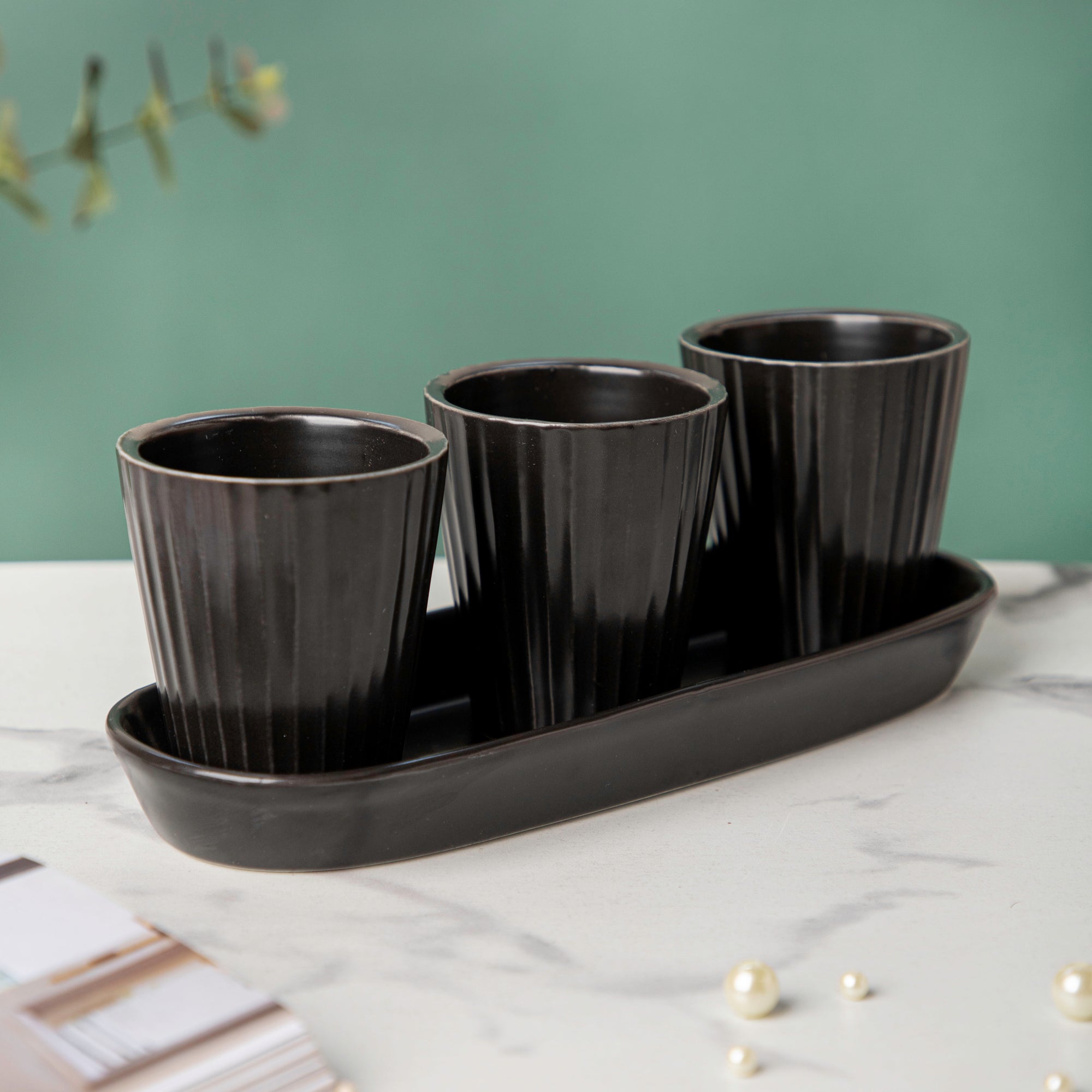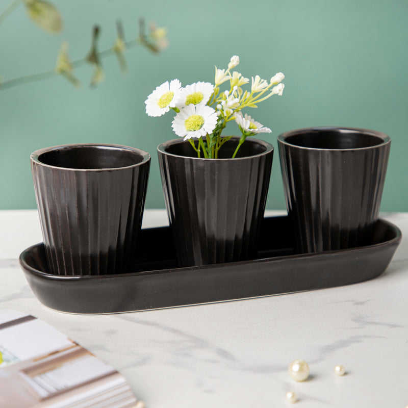 The ceramic planter set provides a wonderful home for mini greens like aloe vera and succulents while adding oomph to the interior design. The set includes three pots with ribbed textures as well as a large rectangular tray on which the planters may be placed. The set's sleek black colour contrasts with colourful blooms and enhances the vibrancy of the lush greens. Nestip: Use the planters as snack buckets for serving fries, wafers etc. Size: Planter - 8cm D x 9cm H Plate - 27cm L x 9.5cm B x 3cm H Color: Black Material: Ceramic Products included: 1 set of 3 planters and 1 long plate Style: FFP85