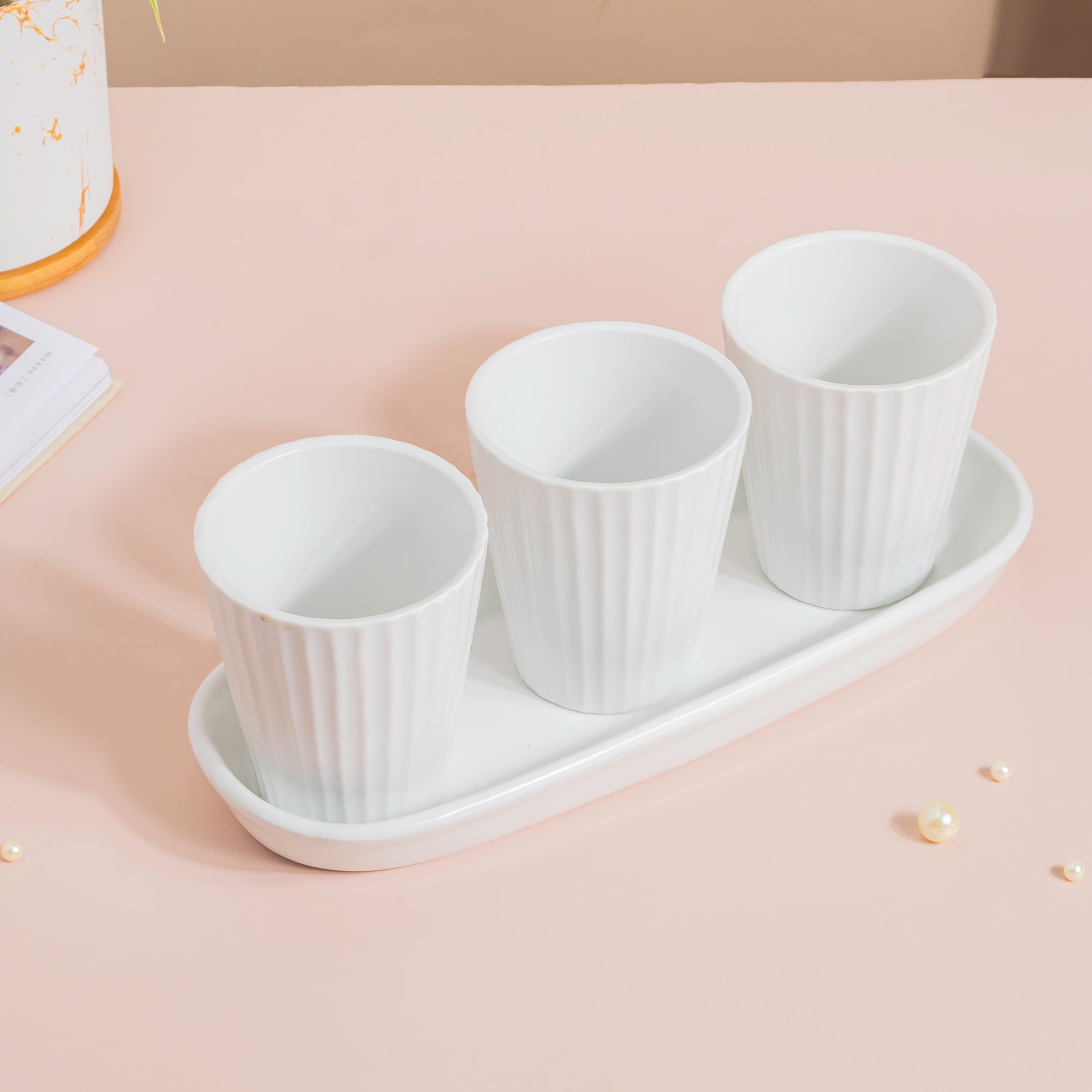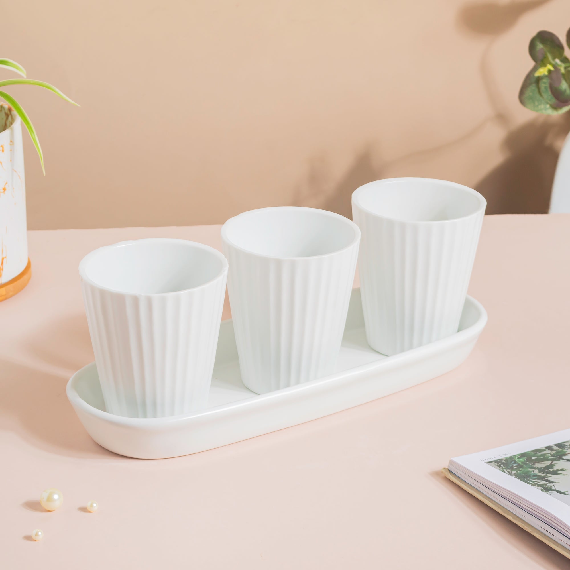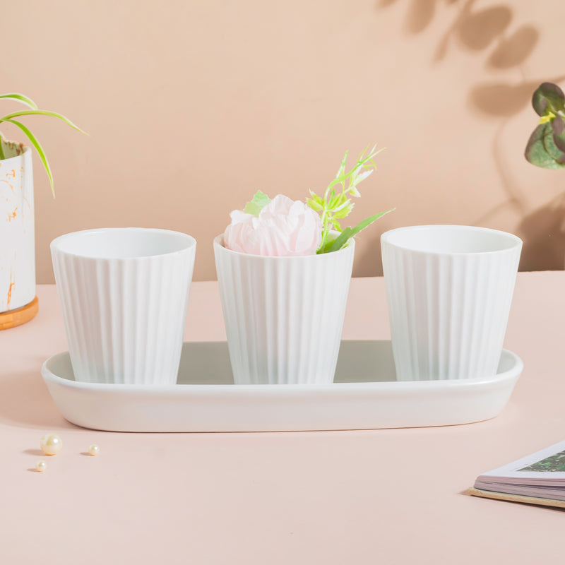 The planter set has been designed with elegance to house tiny plants such as succulents and cactus, and is inspired by a minimalist and modernistic decor. The set includes three ribbed texture planters that are placed on a long rectangular tray. The tray keeps excess water from the pots from flowing onto the table surface and keeps the setup well organised.