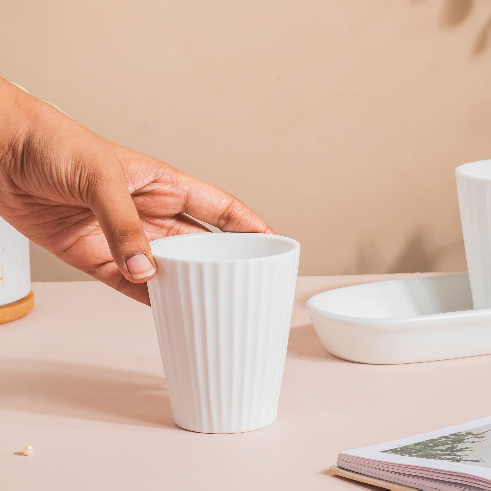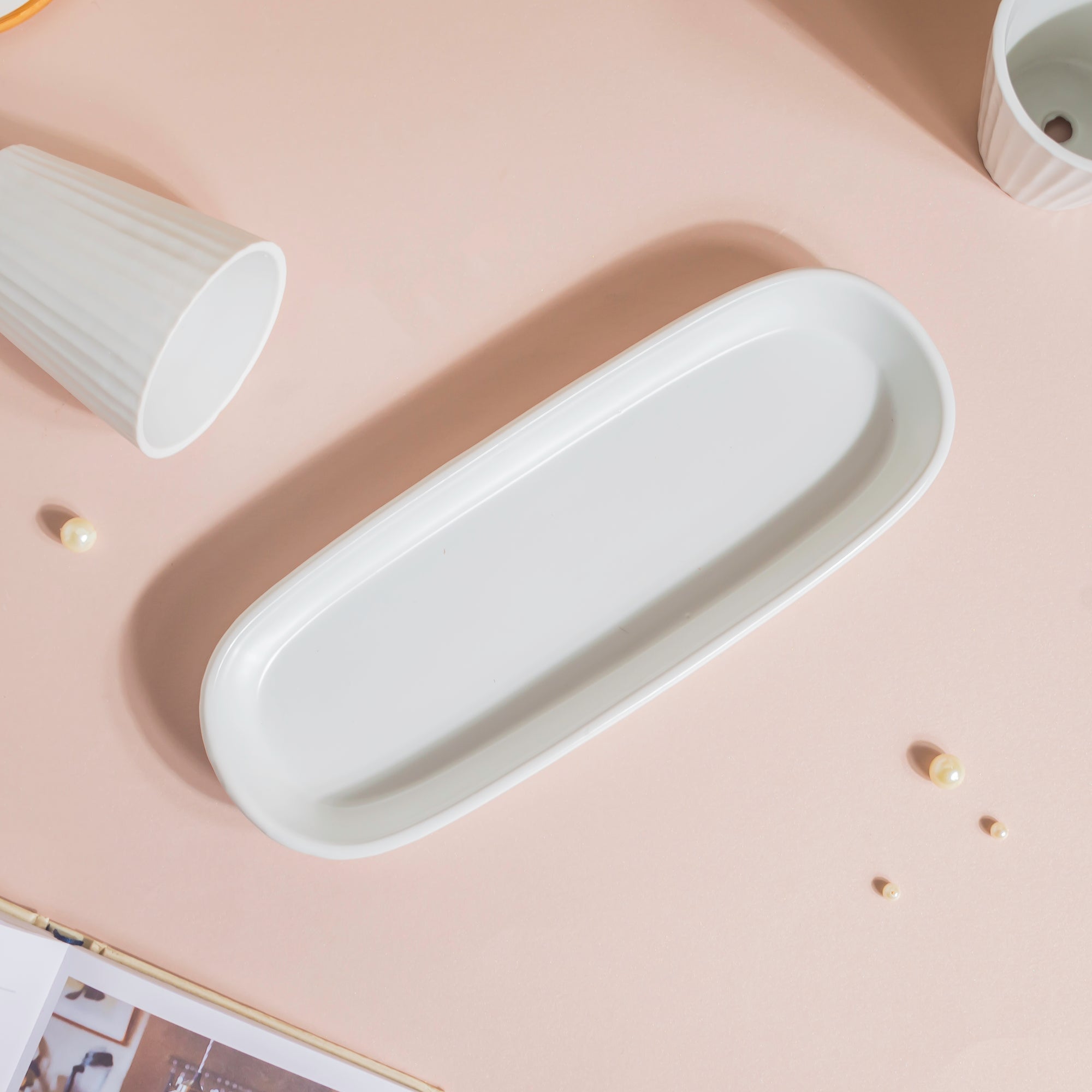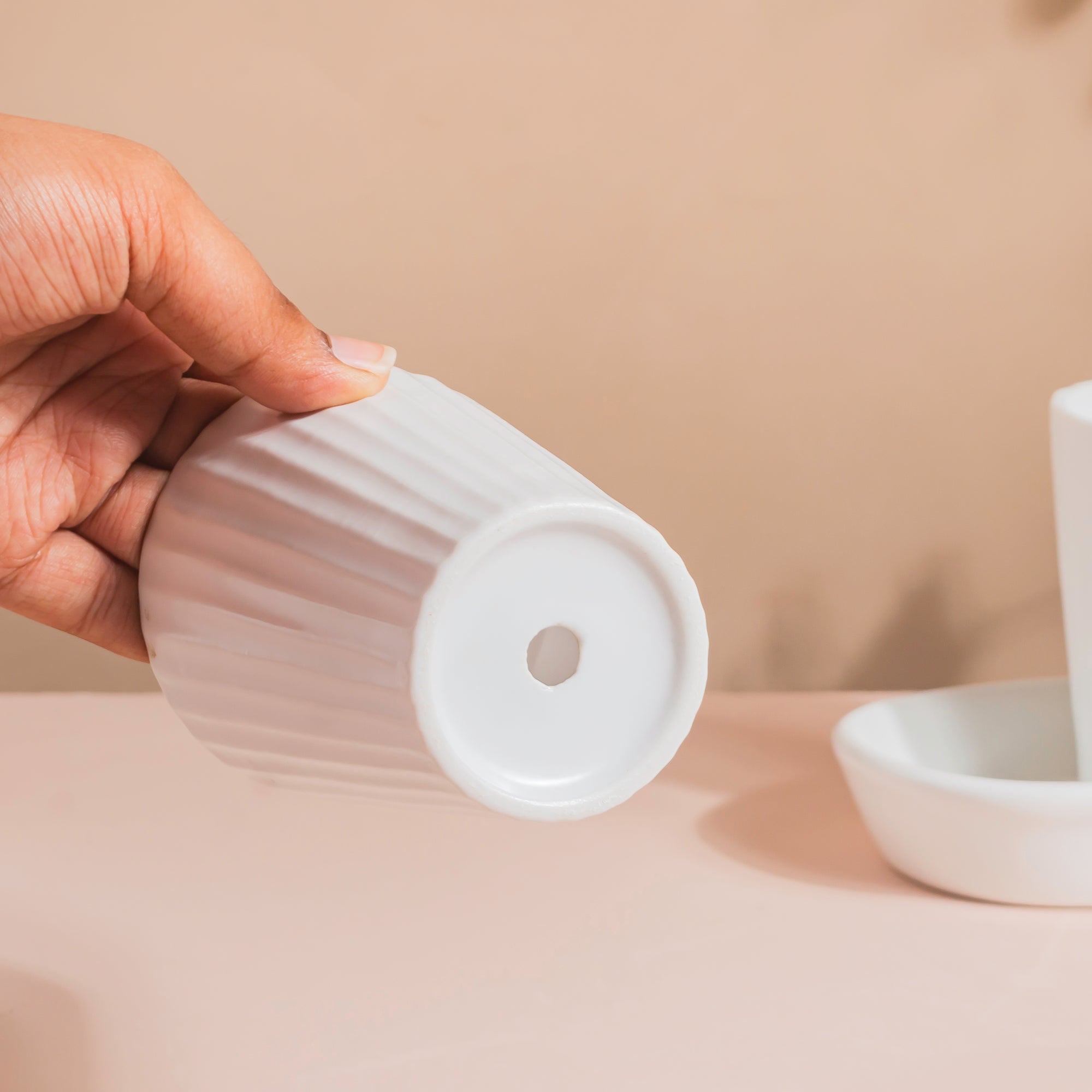 The planter set has been designed with elegance to house tiny plants such as succulents and cactus, and is inspired by a minimalist and modernistic decor. The set includes three ribbed texture planters that are placed on a long rectangular tray. The tray keeps excess water from the pots from flowing onto the table surface and keeps the setup well organised.
