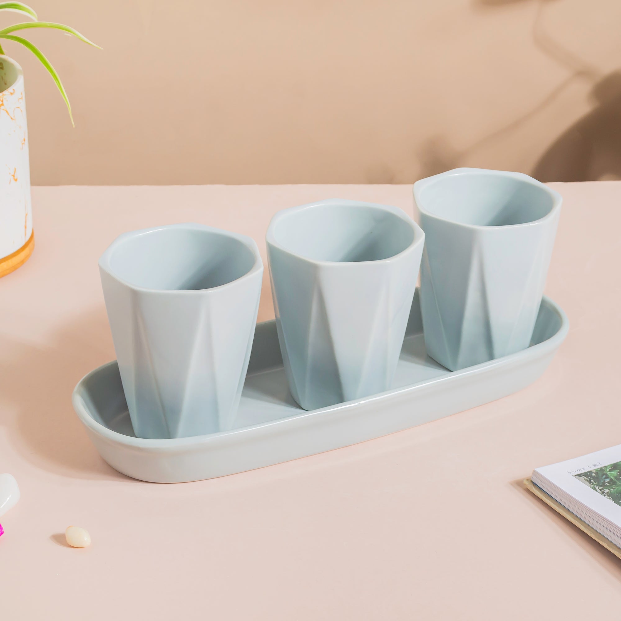 The planter set of 3 in sleek blue tinted grey colour is the ideal combination of functionality and sophistication for any house. The set includes three conical textured pots as well as a long tray with a raised rim. Place faux succulents in the planters, or herbs like mint and tulsi to help one with cooking.