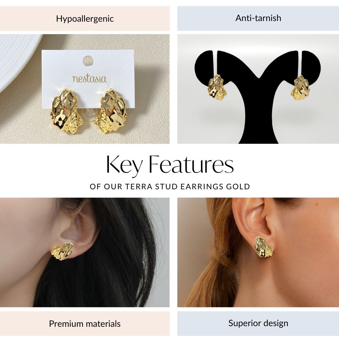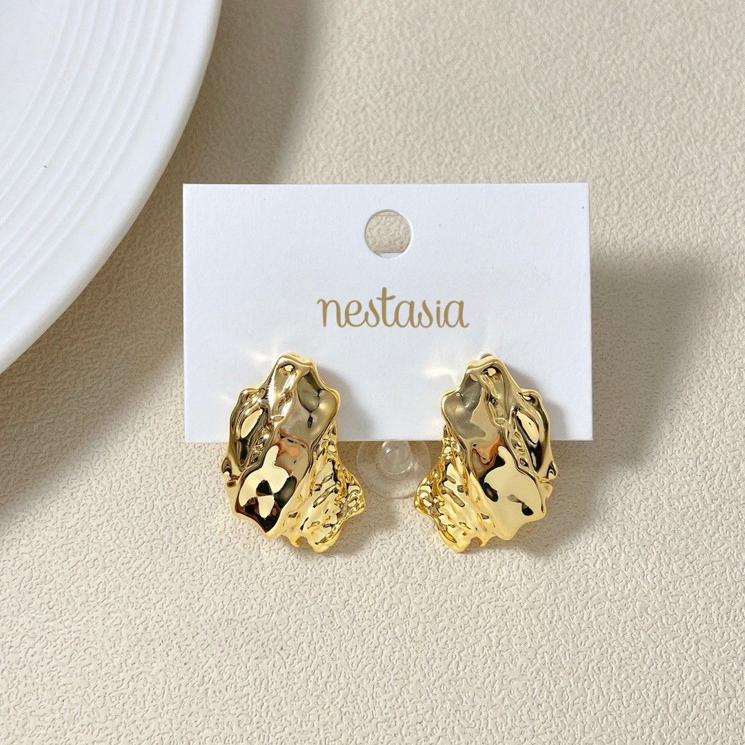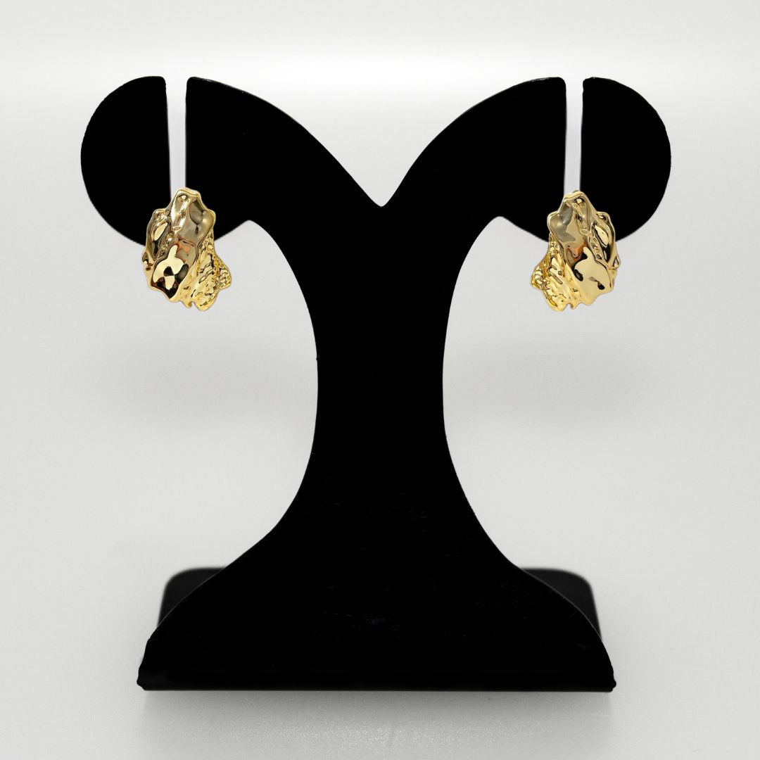 A delicate dance between unrefined forms and refined craftsmanship, these stunning stud earrings celebrate the beauty of raw textures. Inspired by the textures of sculptures in their rawest form, this design embraces the beauty of imperfection, capturing the allure of stone in its most organic form. The rich gold finish enhances the rugged, broken-slab design, adding warmth and sophistication to their bold silhouette. Effortlessly elegant, these earrings are a tribute to nature’s artistry.