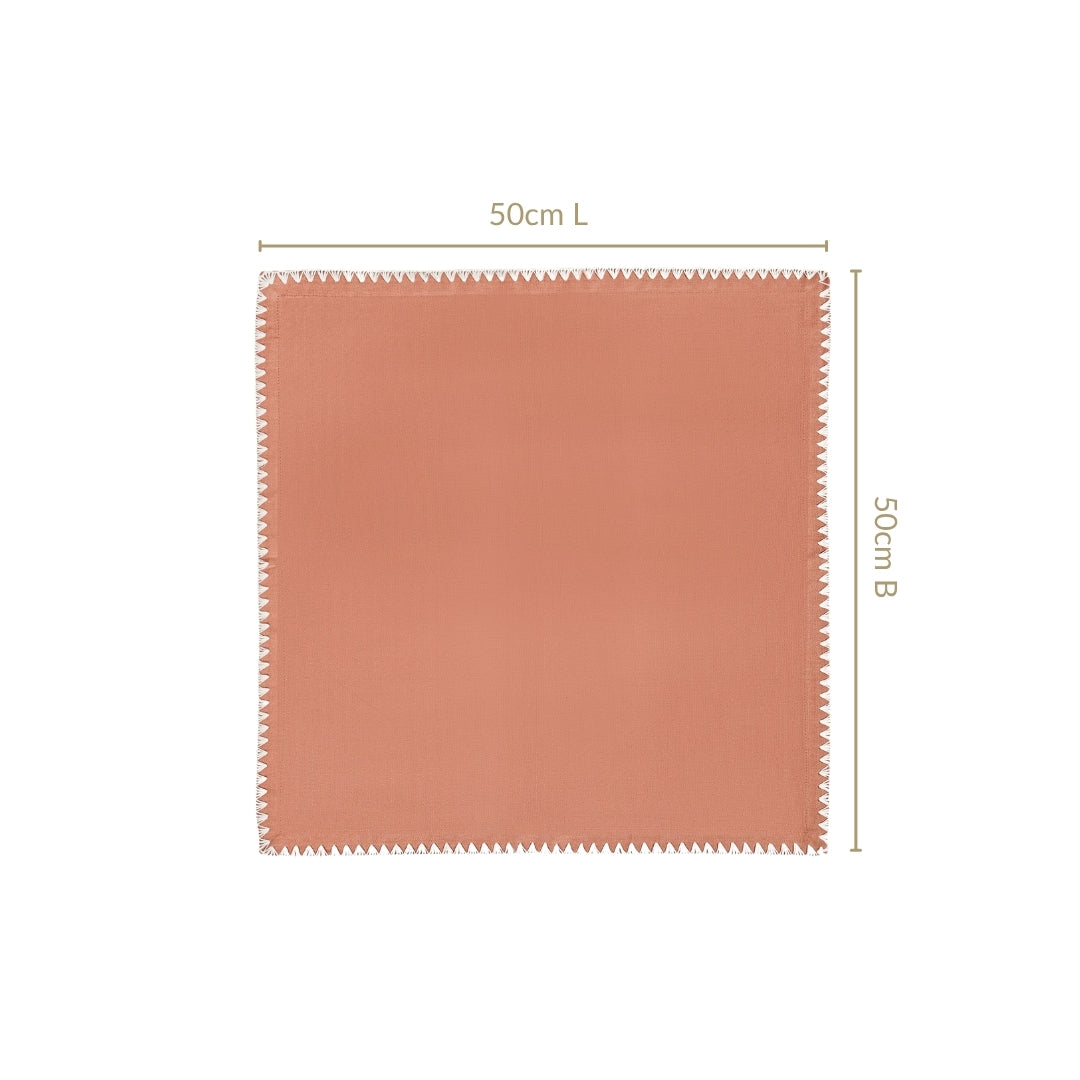 Design: Designed for modern homes that value artisanal charm and practicality, this set of six terracotta table napkins brings a touch of curated elegance to any tablescape. The rich, earthy hue provides a versatile foundation, effortlessly enhancing both formal dinners and casual brunches. The design is centered on its warm terracotta colour, a timeless neutral, which is elegantly framed by a contrasting embroidered edge. This intricate stitching adds a beautiful textural detail and a structured finish, creating a perfect blend of rustic earthiness and refined, modern style.