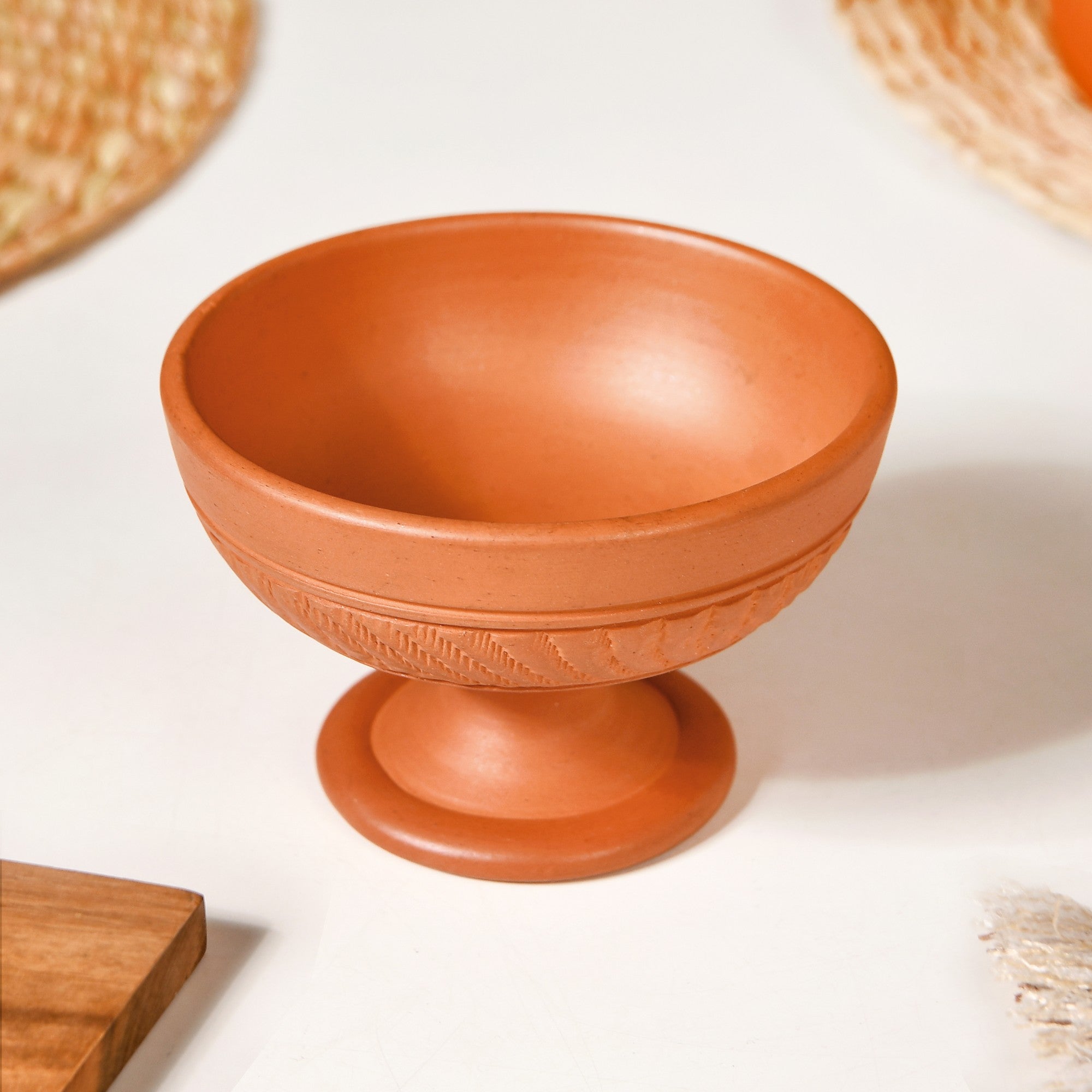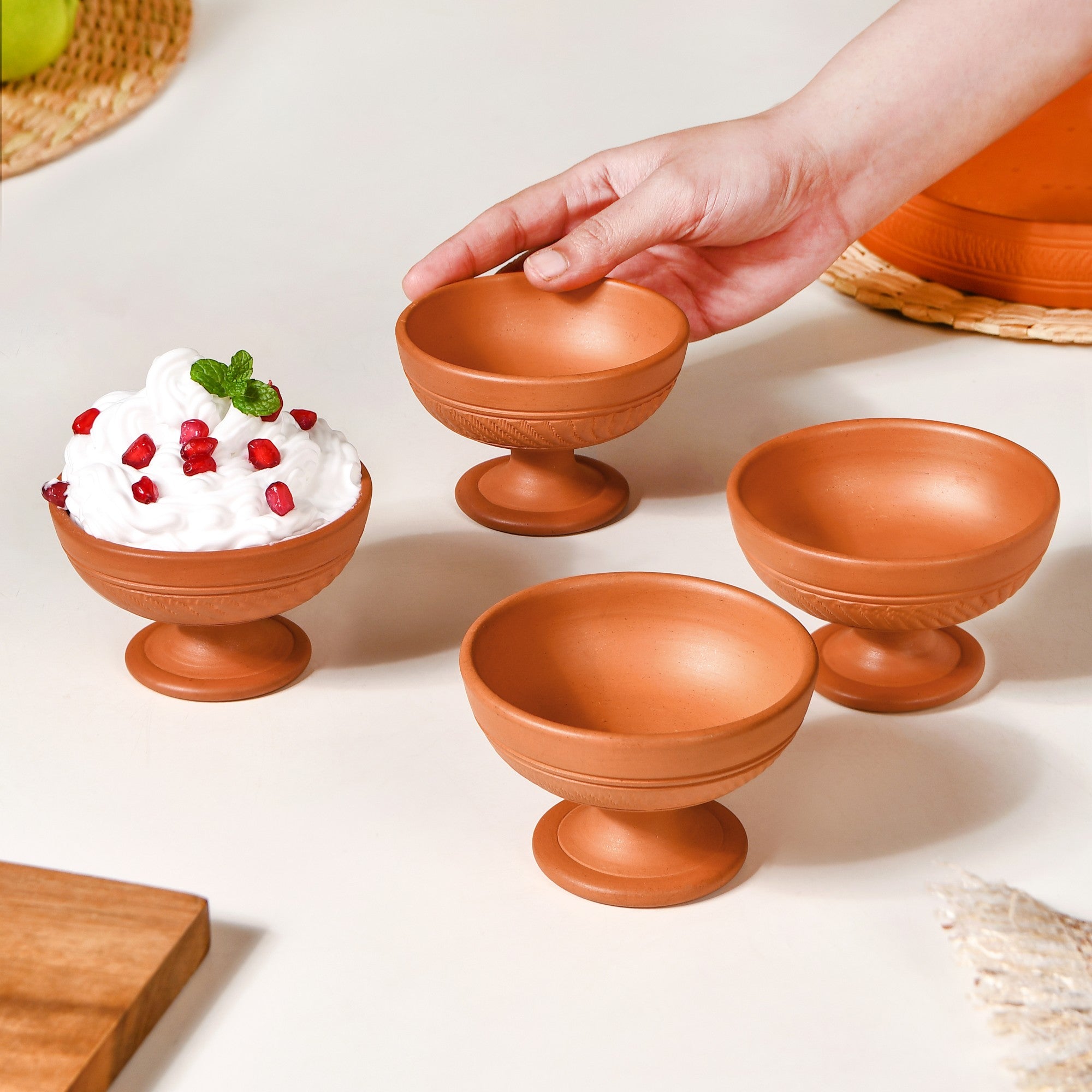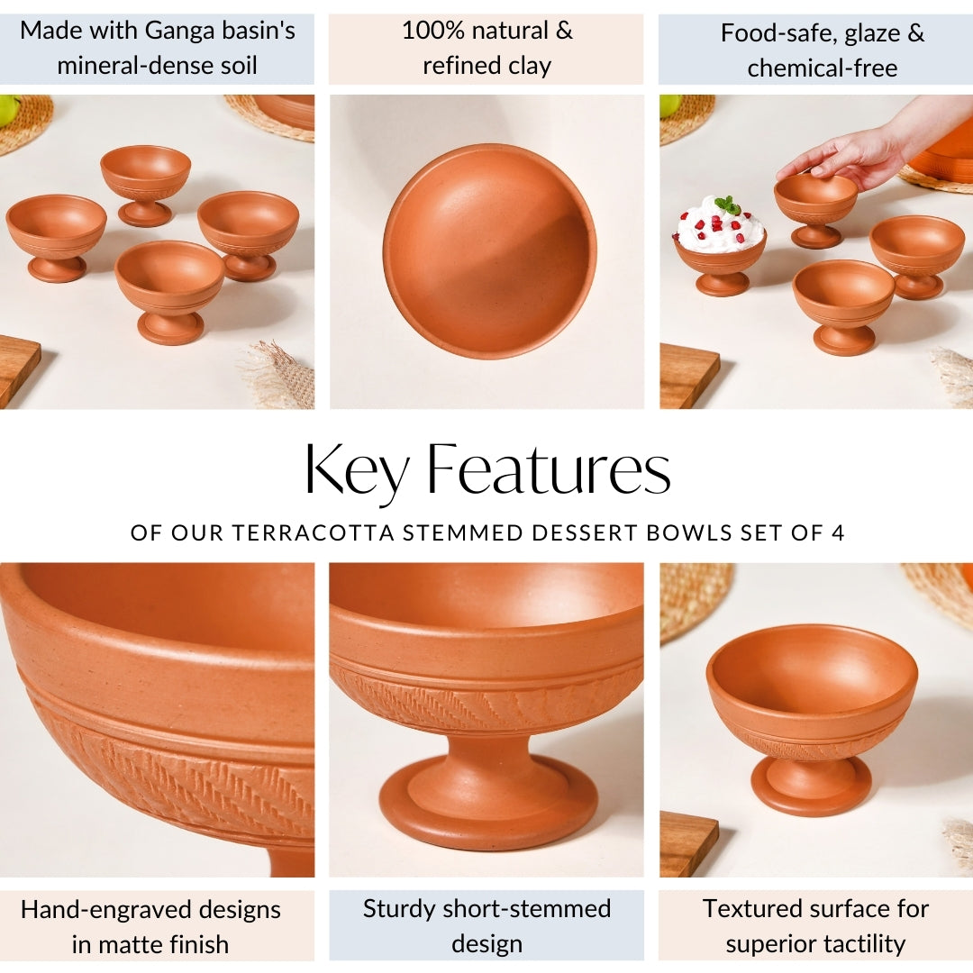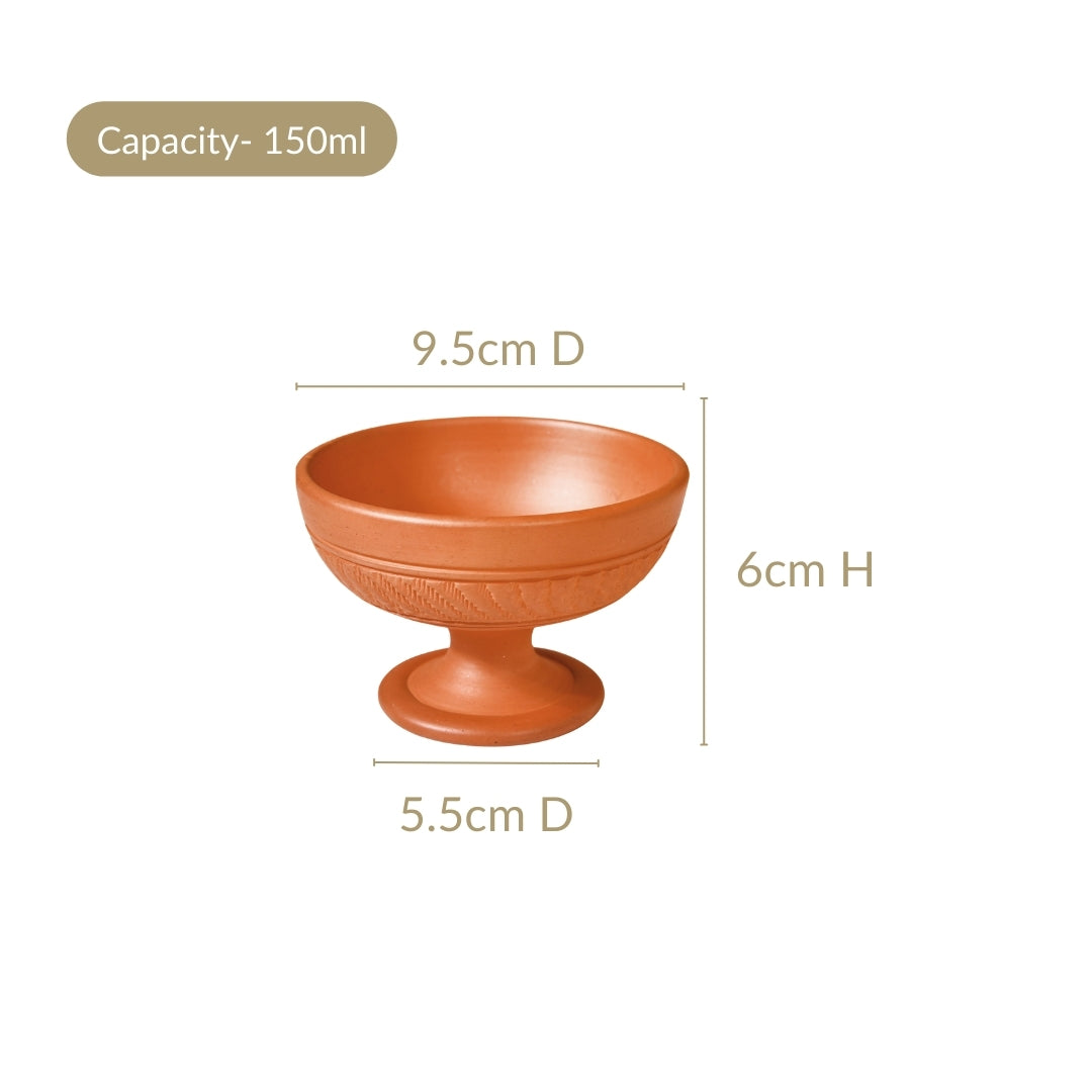 Benefits: Expertly handcrafted from the mineral-rich soil of the Ganga basin, these terracotta dessert bowls are made using 100% natural and refined clay, free from glazes and harmful chemicals. The porous nature of terracotta allows for natural cooling, keeping food fresh while enhancing its aroma and taste. Rich in essential minerals, terracotta is known to balance pH levels, reducing acidity in food and aiding digestion. Being completely non-toxic, it ensures a healthier alternative to plastic or glazed ceramic. Additionally, its heat-resistant properties make it safe for microwaving, while its durability ensures long-lasting use without leaching any harmful substances into food.