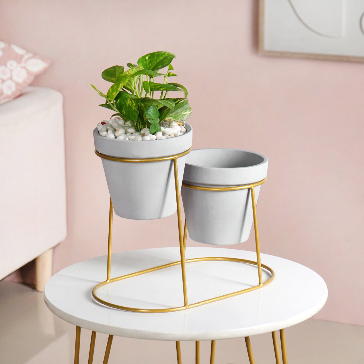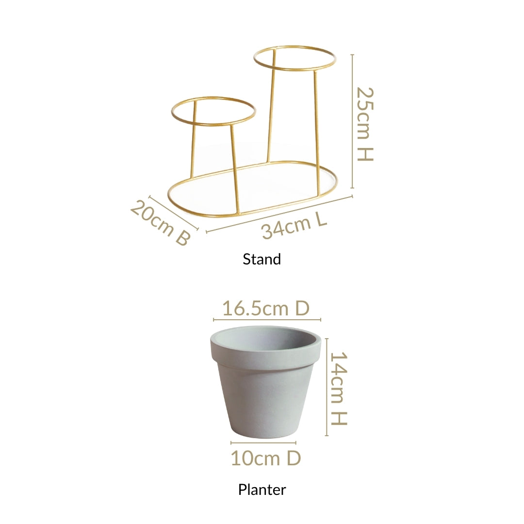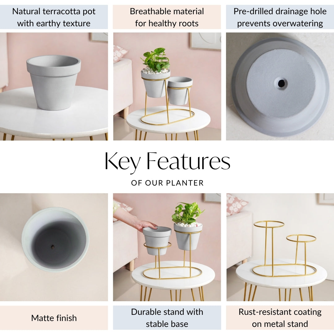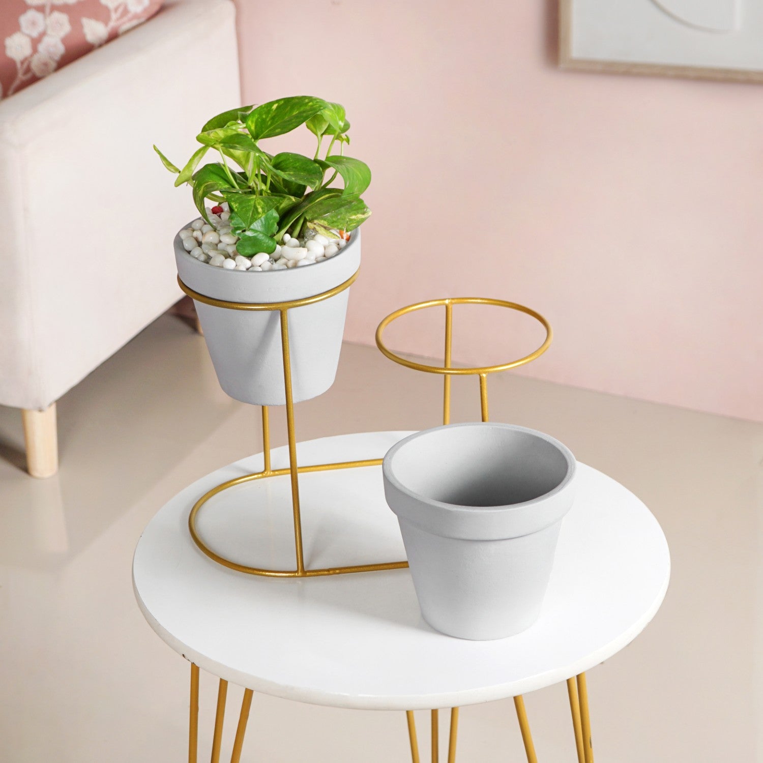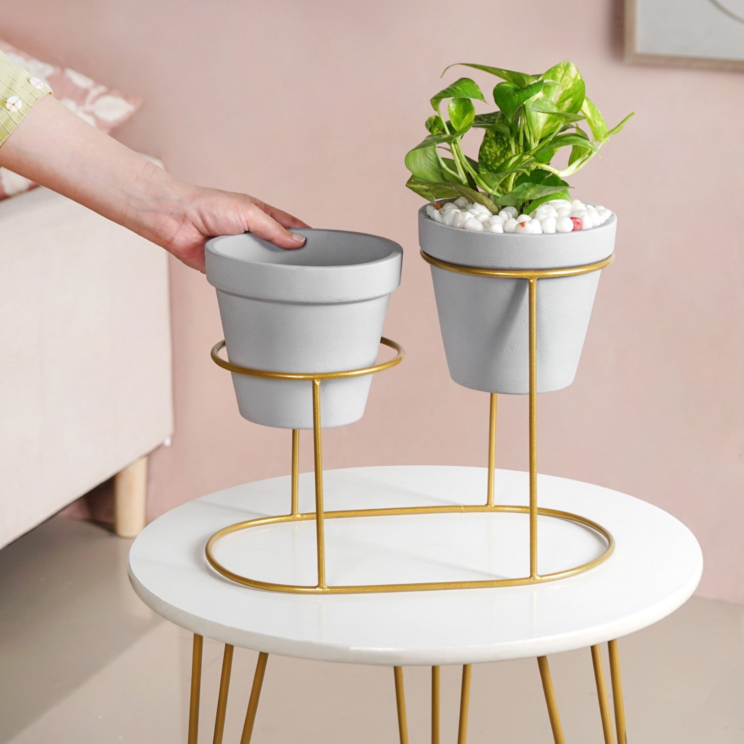 Design: Featuring two elegant grey terracotta pots paired with a luxe gold metal stand, this set blends modern sophistication with practical beauty. The stand is built with a sleek oval base and twin vertical frames that rise to perfectly rounded ring holders. Each pot has a slender, circular silhouette with a thick rim that fits securely into the holders. The soft grey and gleaming gold combination adds a refined, eye-catching accent to any décor.