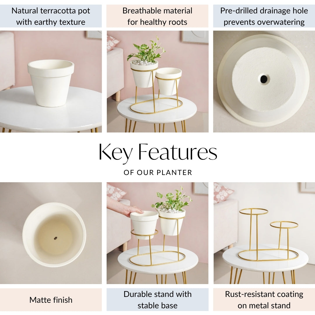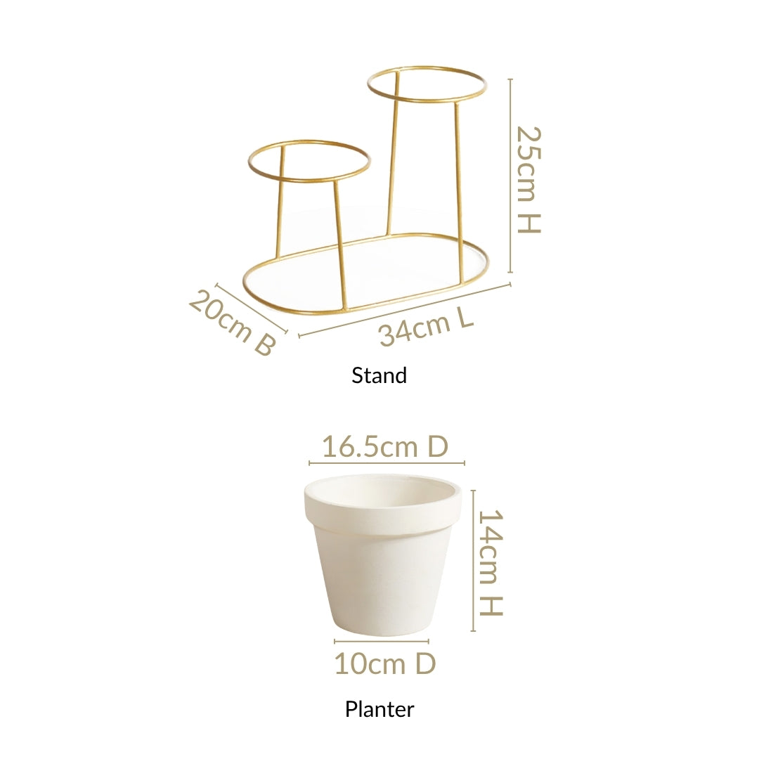 Design: This isn’t just a planter set, it’s a style statement. The glossy gold metal stand features an elegant oval base with two upright frames topped with circular holders that snugly nestle each pot. The off-white terracotta pots have a sleek, tapered base and a thick rim that sits perfectly in the stand, creating a balanced silhouette. The contrast between soft matte ceramic and radiant gold makes this duo pop in any setting, blending minimalism with modern luxe.