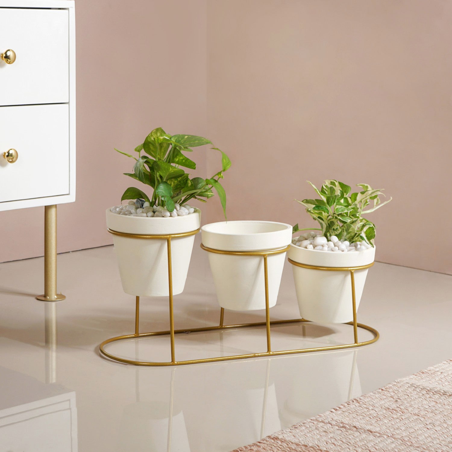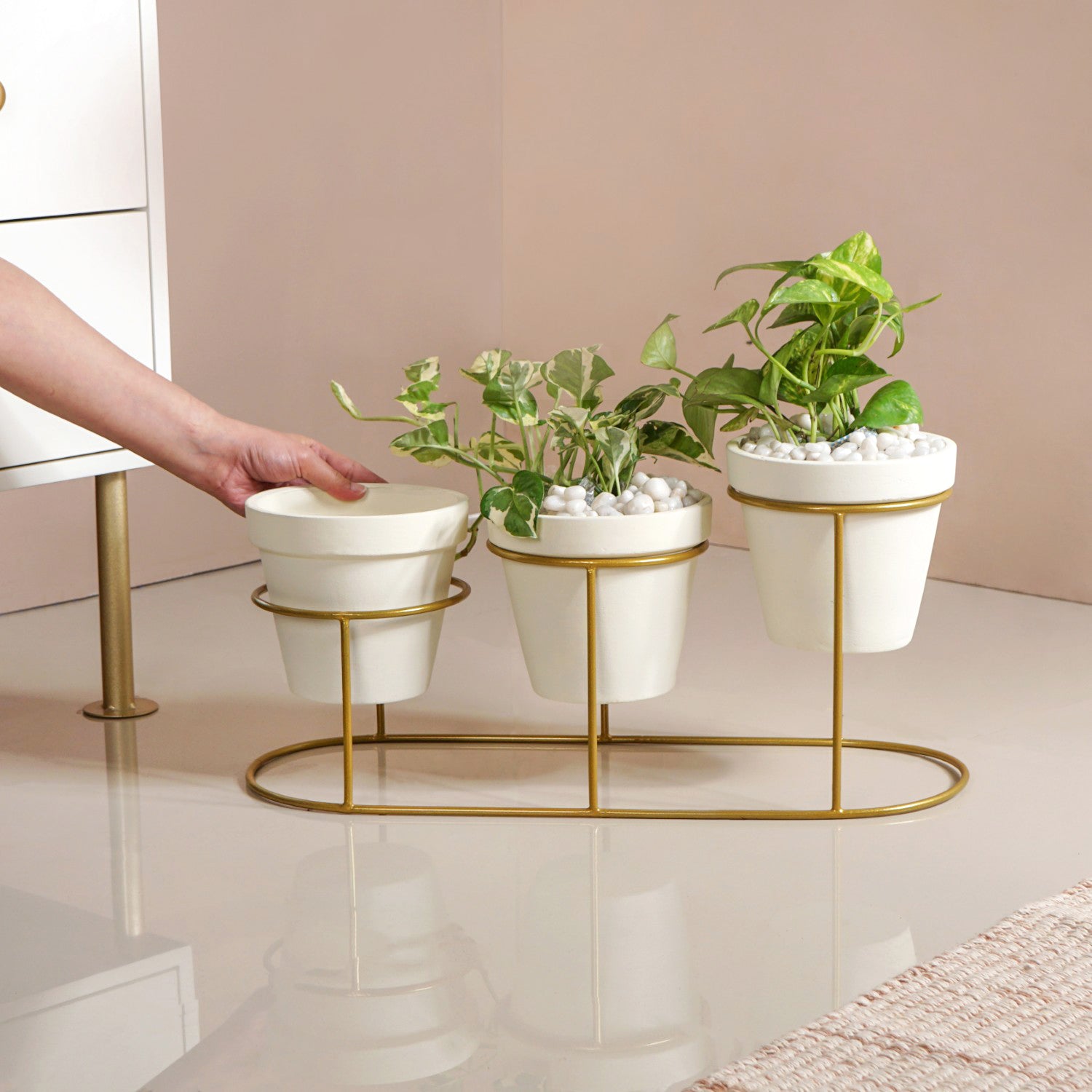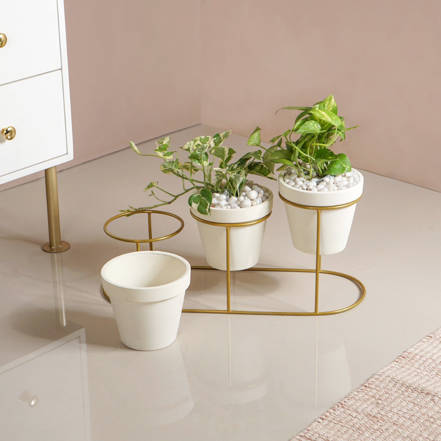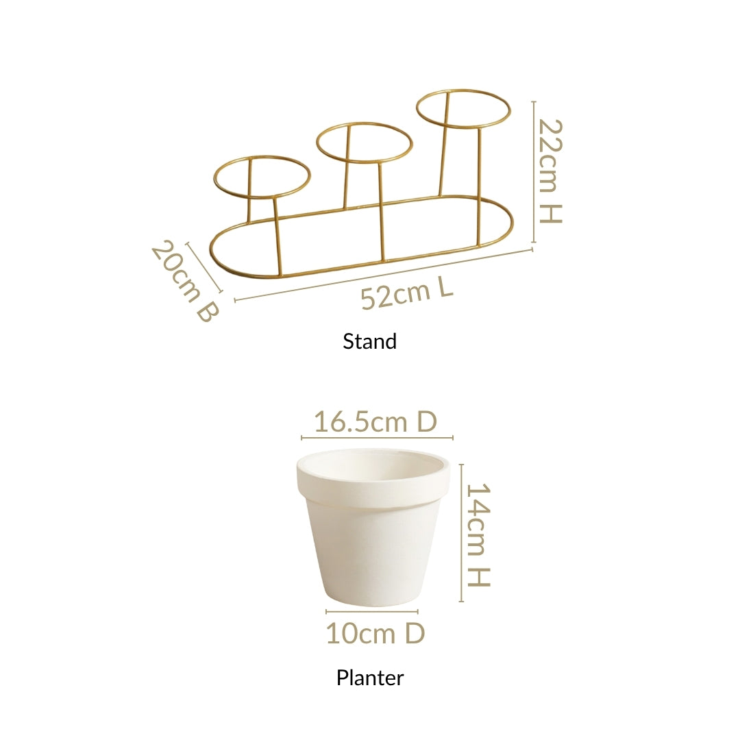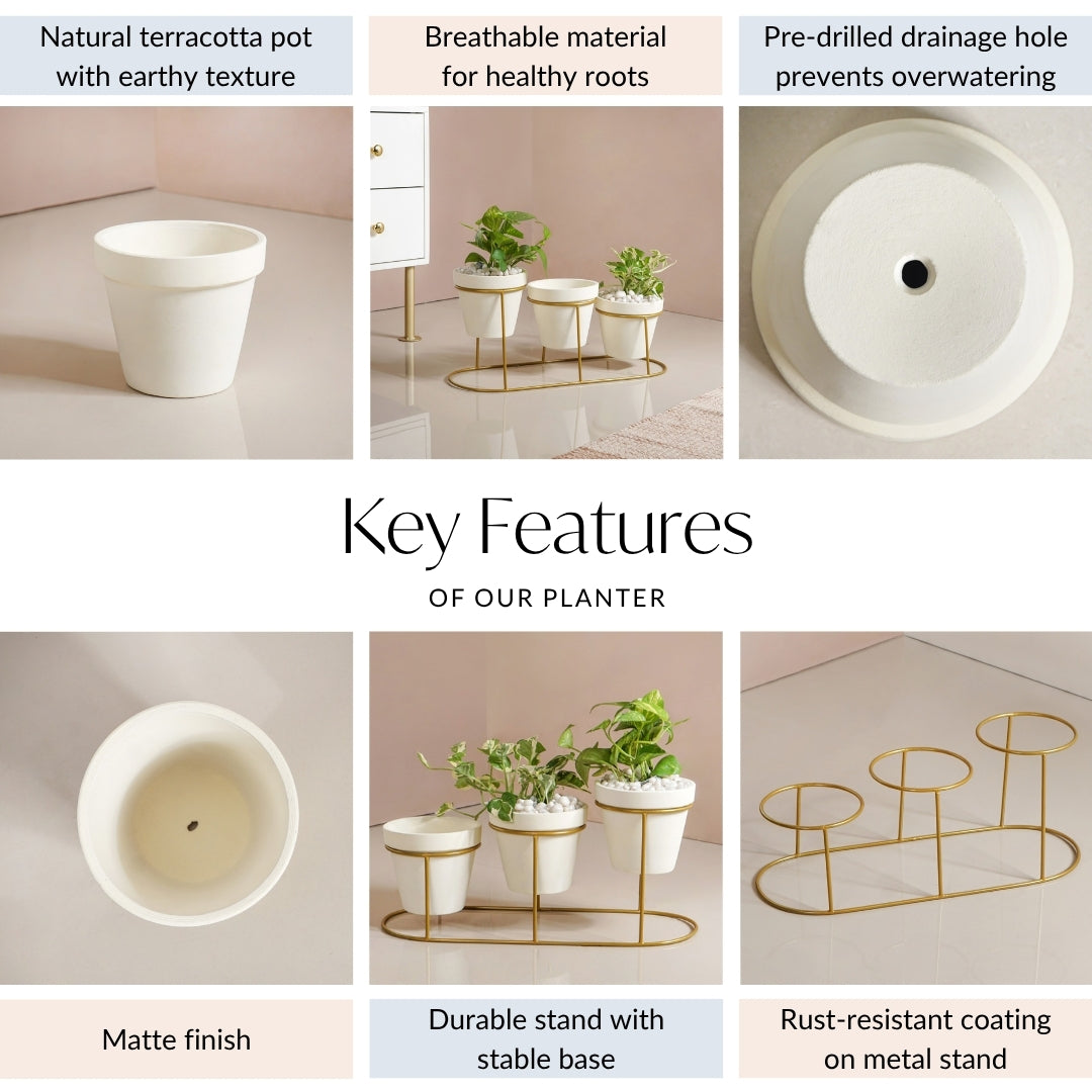 Design: It features three off-white terracotta pots with a smooth matte finish and a gentle, tapered silhouette that widens gracefully at the top. Each pot is crowned with a bold, thick rim designed to fit the stand’s rounded holders. The stand is crafted from sleek metal in a radiant gold finish, featuring an elongated oval base and three vertical rods that lead up to circular holders. It is designed in such a way that, when the pots are placed, it is a sync of ascending order. The contrast between soft cream and lustrous gold creates a clean, curated display that draws the eye. Whether placed on a console, tabletop, or shelf, this piece brings refined style and botanical charm to any setting.