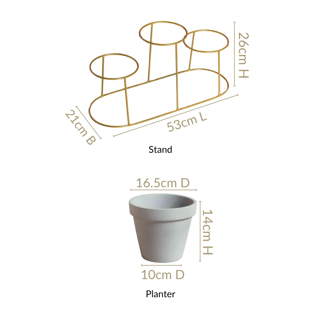 Design: This three-piece planter set showcases a sophisticated combination of grey terracotta pots and a radiant gold metal stand, offering a sleek, modern aesthetic. Each pot features a smooth matte finish, a gently tapered silhouette towards the bottom, and a thick rim that fits perfectly into the stand’s circular holders. The oval base anchors three vertical rods, two of equal height on either side and a taller one in the centre, creating a tiered arrangement that adds visual depth and allows each plant to shine. Whether styled on shelves, tabletops, or windowsills, this set brings refined charm and contemporary flair to any space.