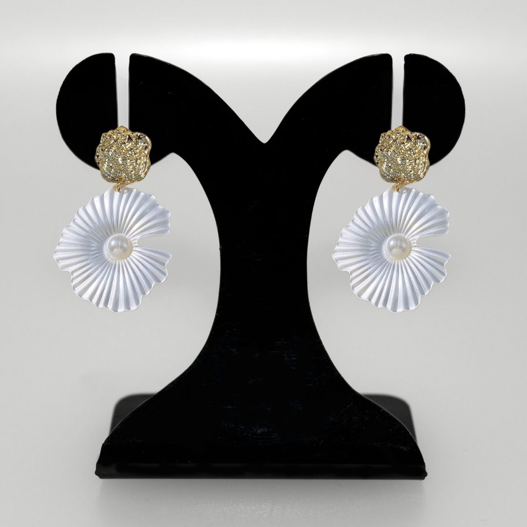 Refined elegance meets artistic craftsmanship with these exquisite dangling earrings. Drawing inspiration from the many textures of nature, the design beautifully captures organic forms and delicate finishes. The interplay of textured gold and soft iridescent tones adds a sophisticated charm, making these drop earrings a graceful fashion accessory for any occasion.
