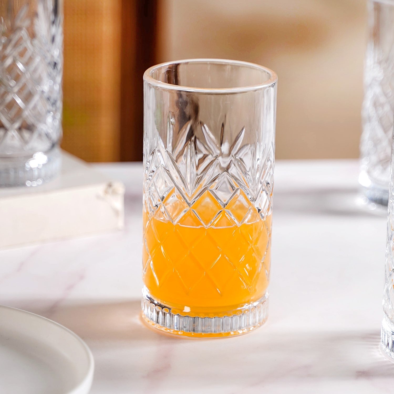 Design: These crystal glasses feature a sturdy base and a tall design that enhances their visual appeal. The crystal-clear cut-glass textures of these tall tumblers create a sophisticated look, allowing your beverages to shine while adding a touch of elegance to your table setting.