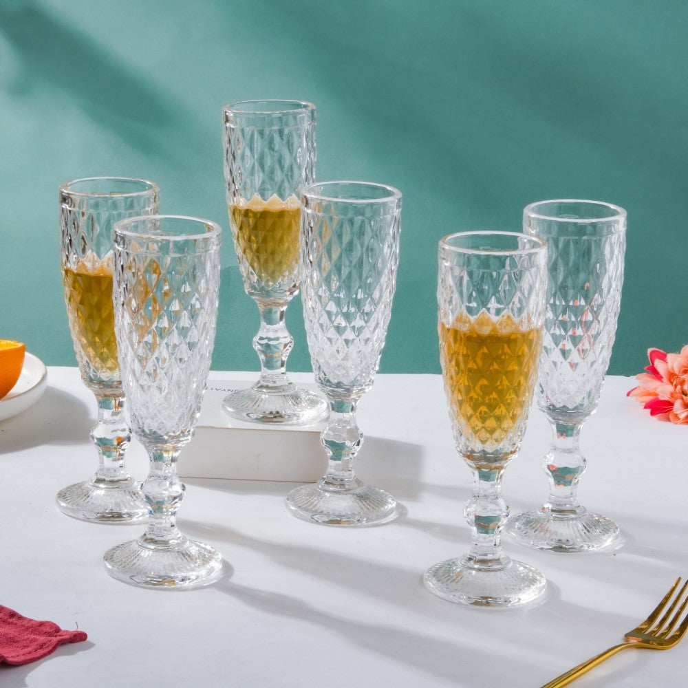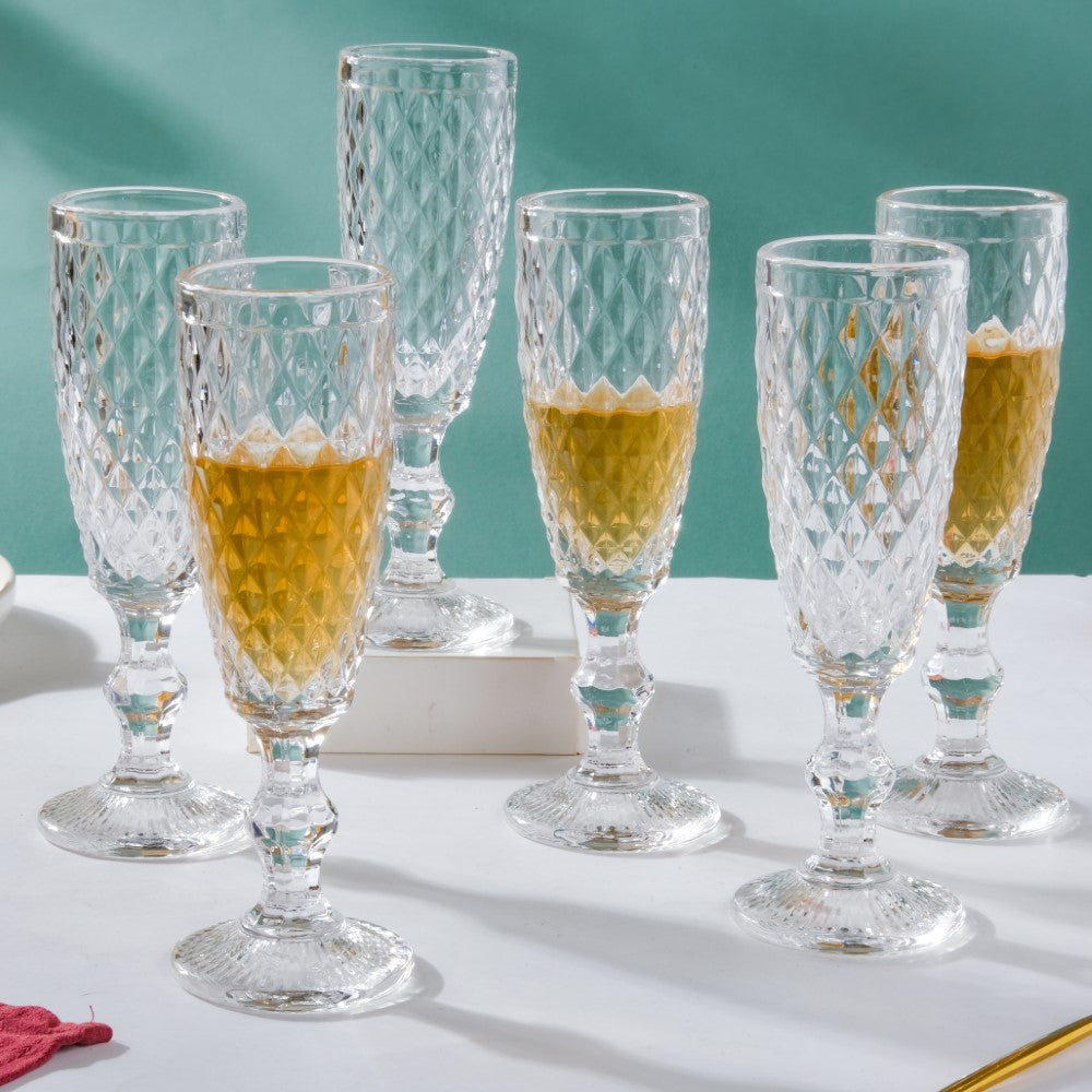 The slender stemmed glassware set of 6 possesses an unparalleled vintage charm that adds a touch of sophistication when presented on the dinner table. Inspired by a true vintage aesthetic, the glass set is sure to capture one's imagination and allure one's senses, making the taste of the beverage more delicious. The glassware set is crafted from sturdy, chip-resistant, food-safe material, making it perfect for everyday use. The translucent drinkware features a diamond-textured surface and an elegantly shaped stem that is easy to hold. The gorgeous drinkware set is perfect for champagne and mimosa.