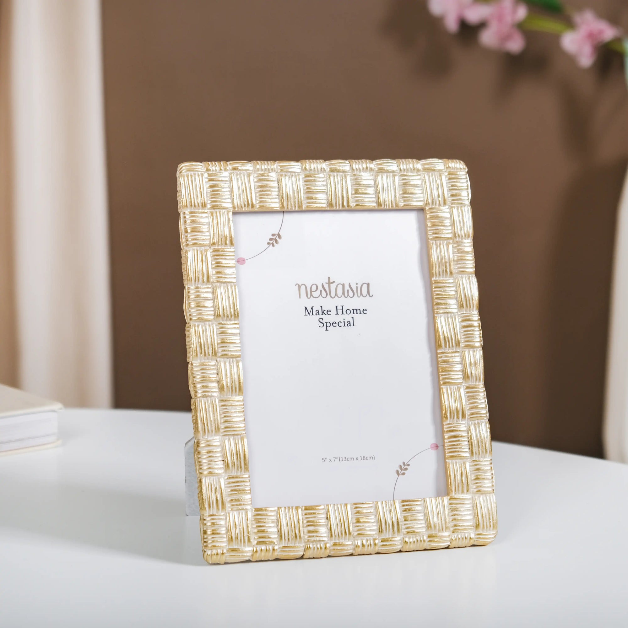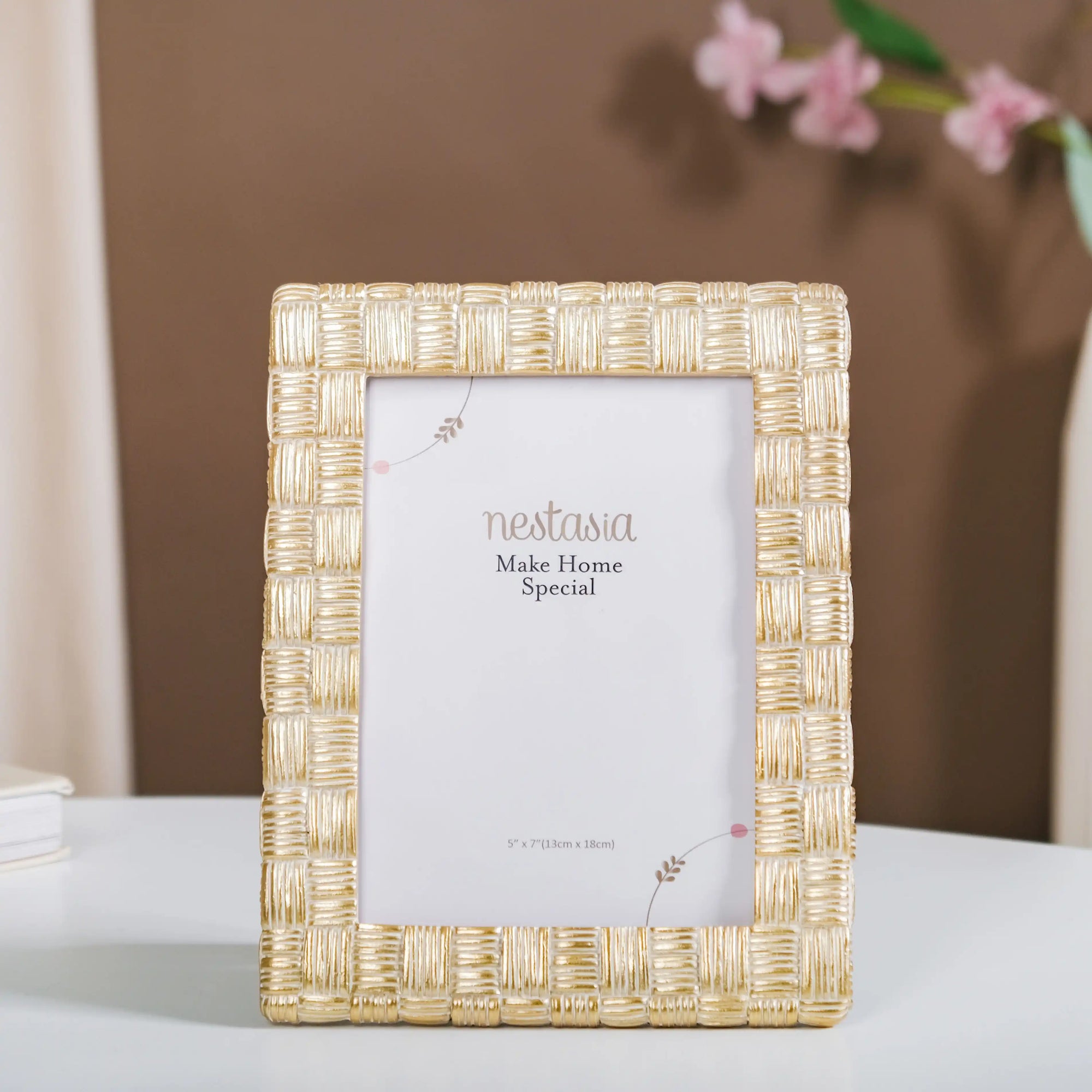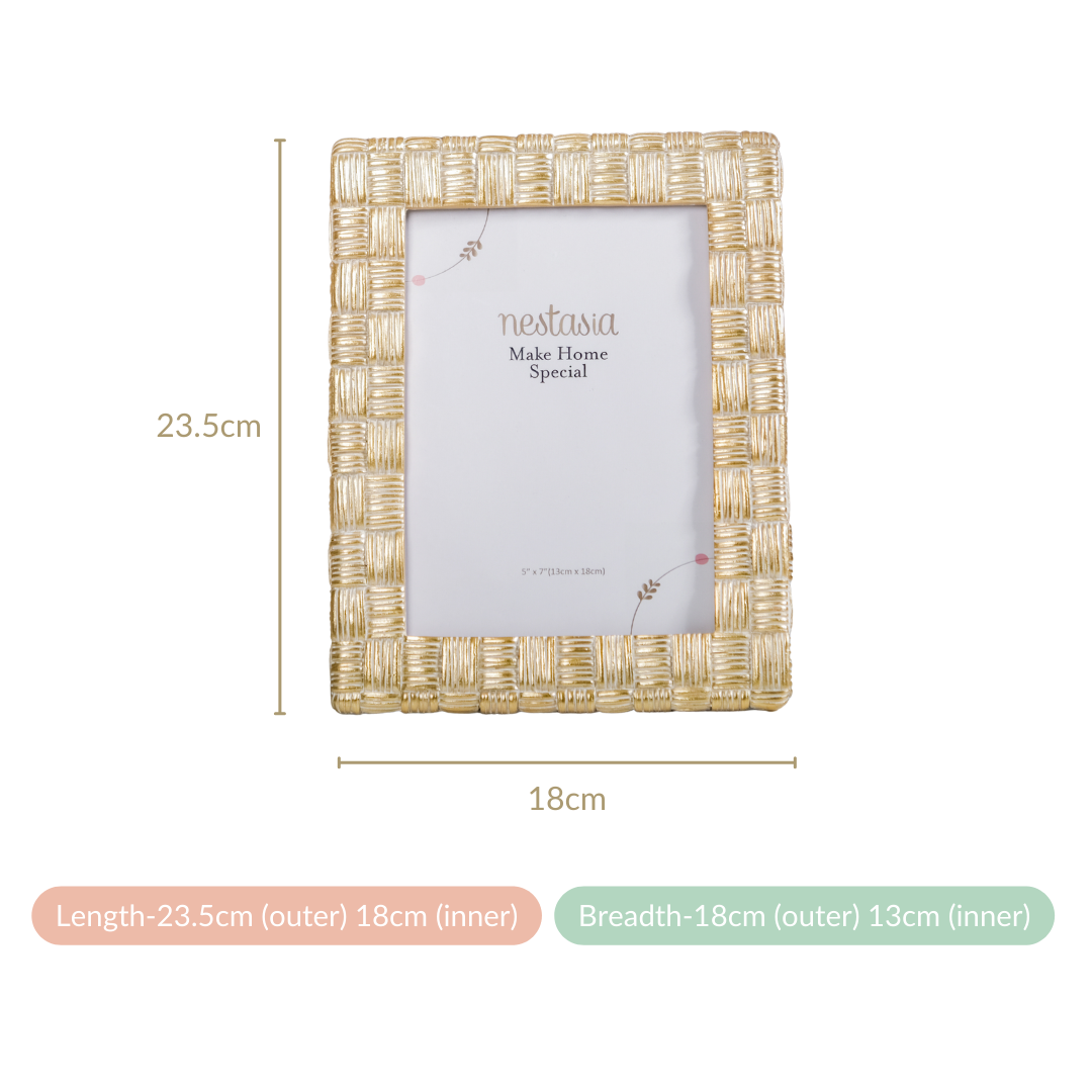 Experience opulence with our large golden photo frame. Meticulously crafted from high-quality resin, this rectangular masterpiece radiates elegance and sophistication. The intricate woven straw-like texture adds depth, casting a mesmerizing spell upon your photographs. As a bold statement piece, it captures attention as a captivating centrepiece in any room. The radiant golden finish imparts opulence, while the rustic charm of the woven texture complements diverse interior styles.