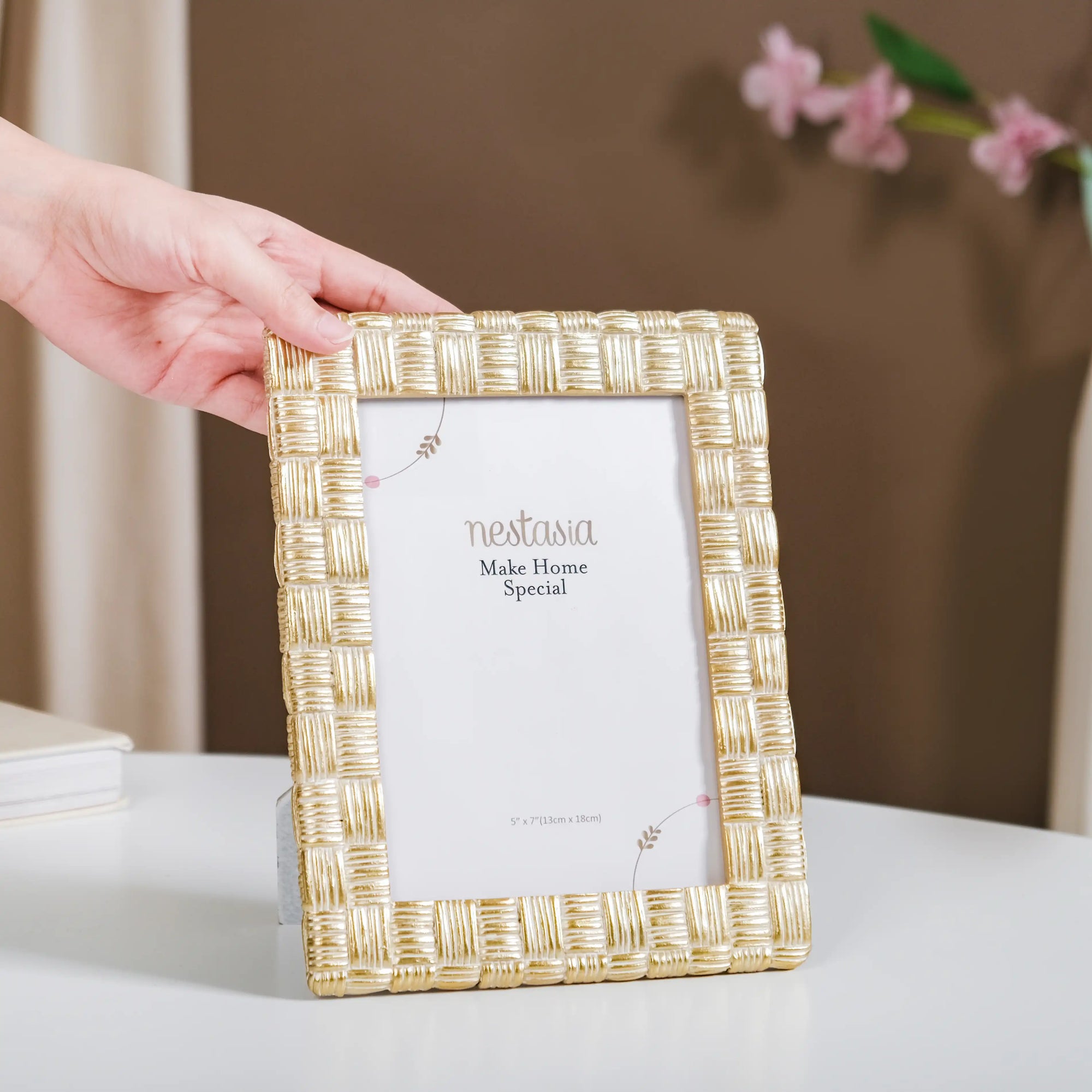 The large golden photo frame is a stunning embodiment of opulence. Expertly crafted from high-quality resin, this rectangular frame boasts a radiant golden finish that exudes elegance and sophistication. Its standout feature lies in the exquisite woven straw-like texture that adds depth and visual interest to your photographs, creating a mesmerizing display. Designed to make a bold statement, this large frame becomes a captivating centrepiece, commanding attention in any room. The golden hue infuses a touch of opulence, while the intricate woven texture adds a rustic charm that beautifully complements various interior styles.