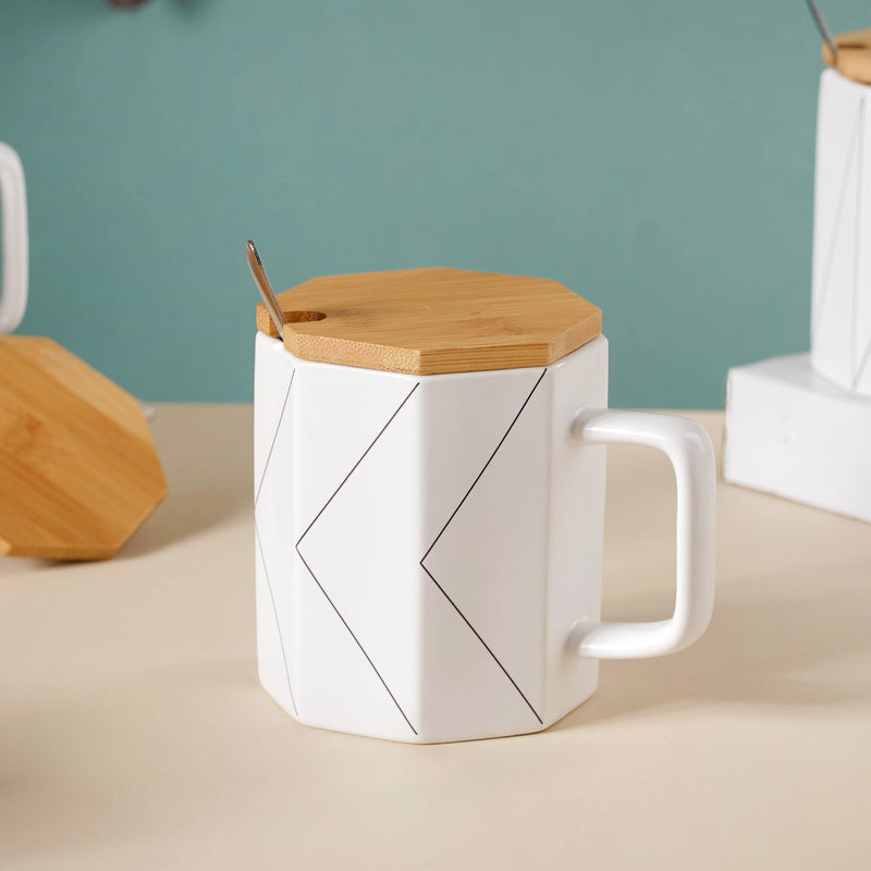 The octagonal mug in four formal patterns- kites, diamonds, arrows, and zigzag, comes with a rectangular handle that adds to the geometricity of the mug with lid and spoon. The mug is perfect for formal as well as casual settings and is easy to pair with other colorful pieces from the collection. The mug is also perfect to gift to colleagues or other close friends. Made of non-porous ceramic clay, the mug is easy to clean using mild soap and water and can be used on a daily basis to serve all kinds of tea, coffee, and beverages. Place the mug without the lid in the microwave oven and dishwasher. Nestip: The four variants paired together would add a classy touch to a formal setup. Size: Cup- 7.5cm D x 9.5cm H (with lid) Length of cup with handle- 11cm Length of spoon- 14cmCapacity- 300ml Color: White, black, and natural Material: Ceramic and wood Products included: 1 mug with lid and spoon Style: Kite- HCB53S73 Diamond- HCB53S221 Arrow- HCB53S222 Zigzag- HCB53S223