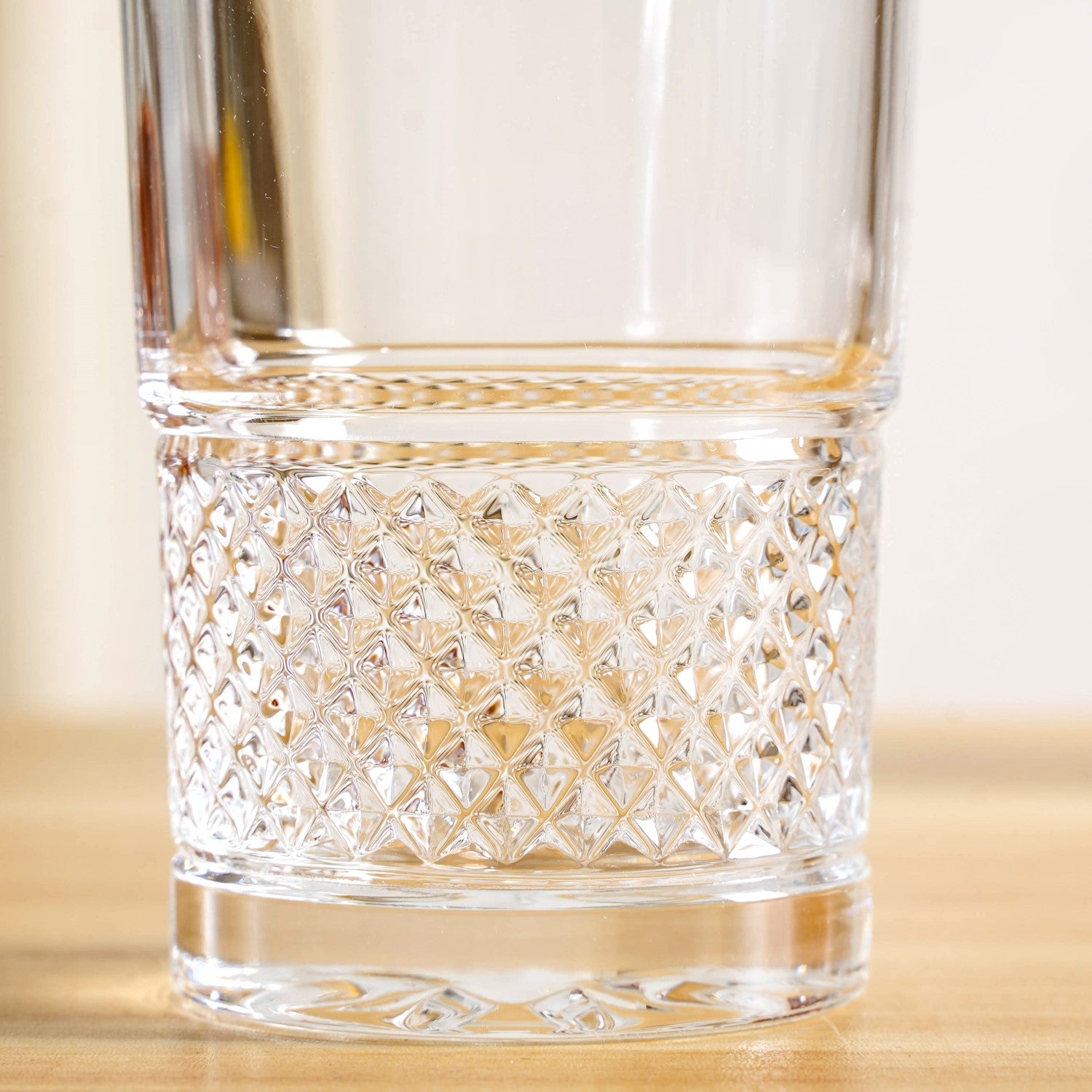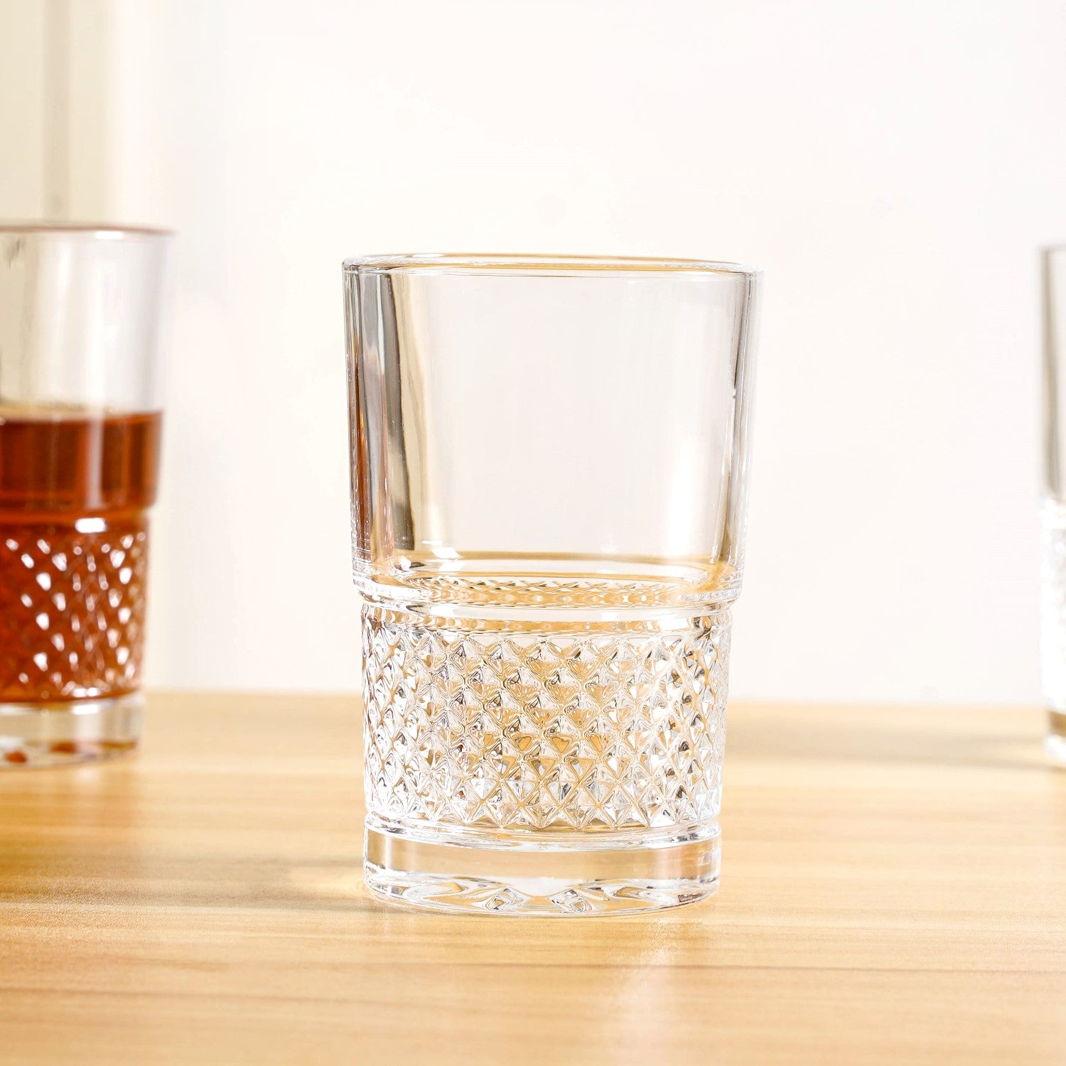 Design: The design features an intricate embossed diamond-like geometric pattern that wraps around the glass, creating a tactile experience that enhances grip and adds visual depth. The classic transparent finish allows the rich amber of your tea or the dark roast of your coffee to become part of the aesthetic, while the crystal-clear glass ensures a classic look that complements any décor.