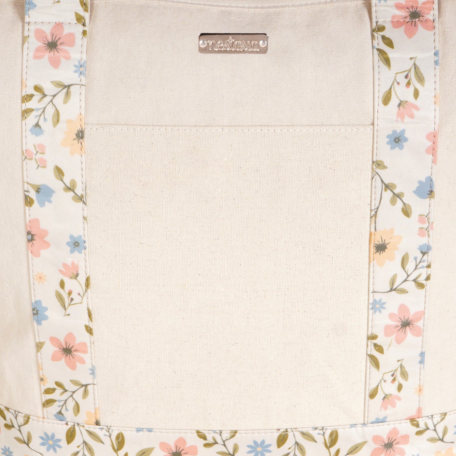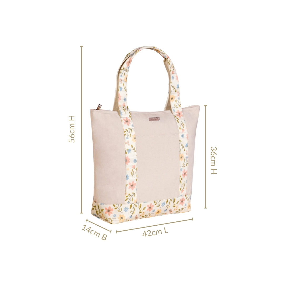Design: This tote bag is crafted from a durable canvas body built to last, with a light-coloured natural fabric that allows for a versatile style and complements many outfits. The appealing colourful floral pattern brightens the design, featuring on the nylon base for extra support and on the sturdy nylon straps which are comfortable to carry. Organisation is effortless with one convenient outside slip pocket and one secure inside zipper pocket. It also features a flat structured bottom and a small metal logo plate at the top centre to complete the look.