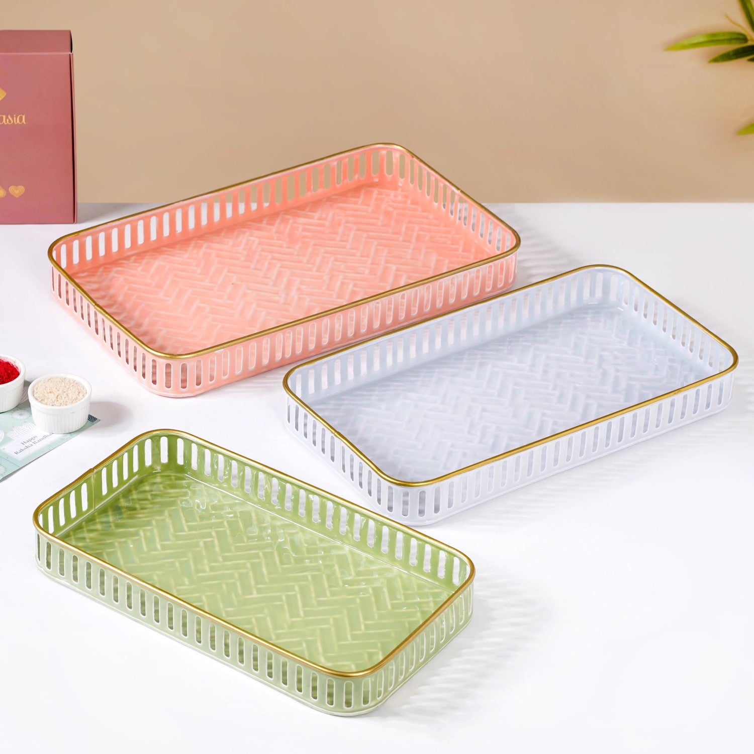Pastel Herringbone Pattern Metal Tray Set Of 3 |