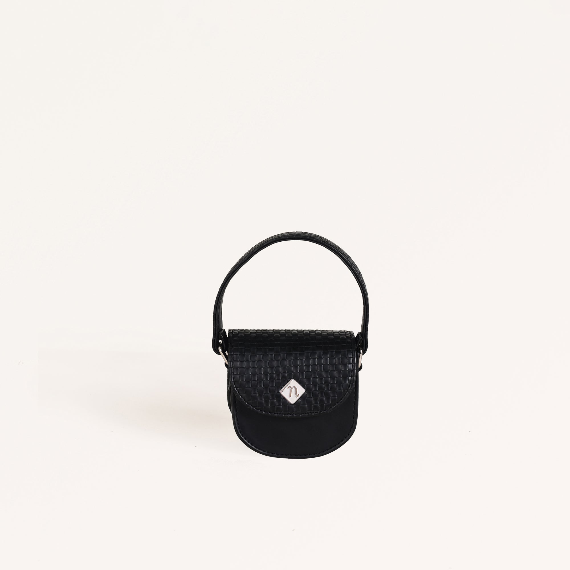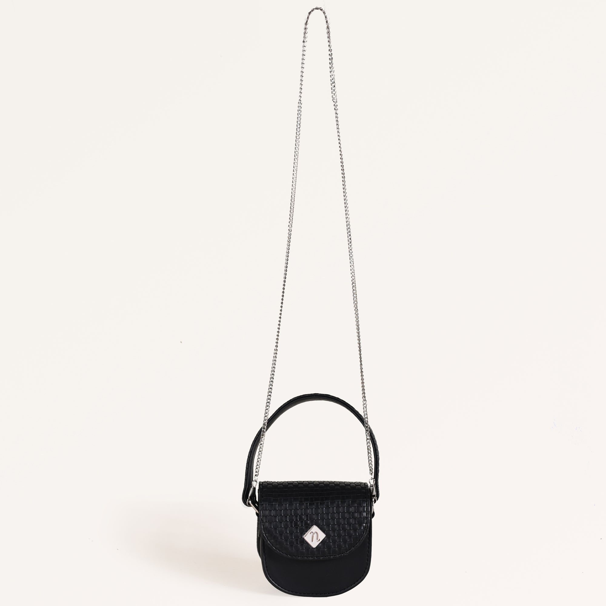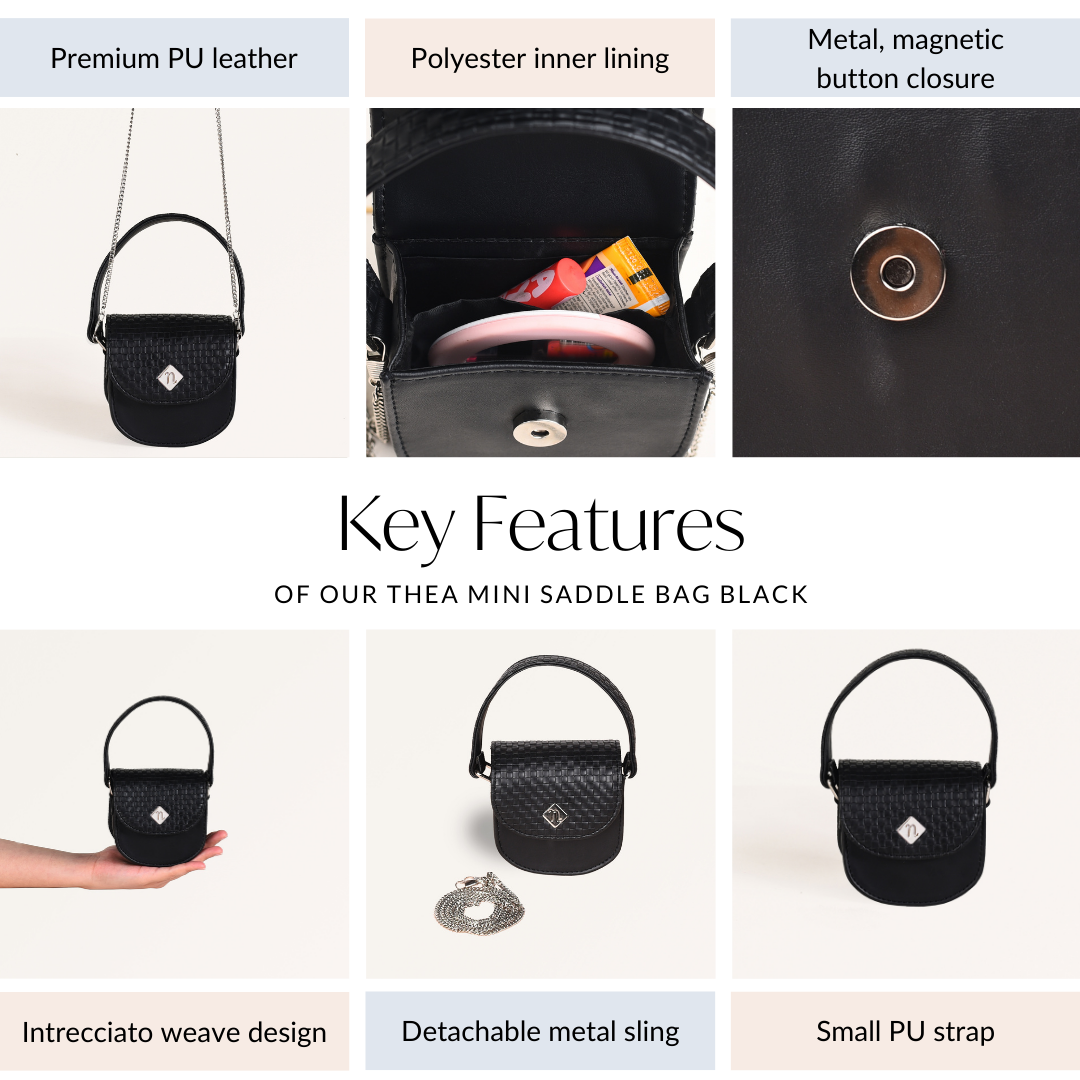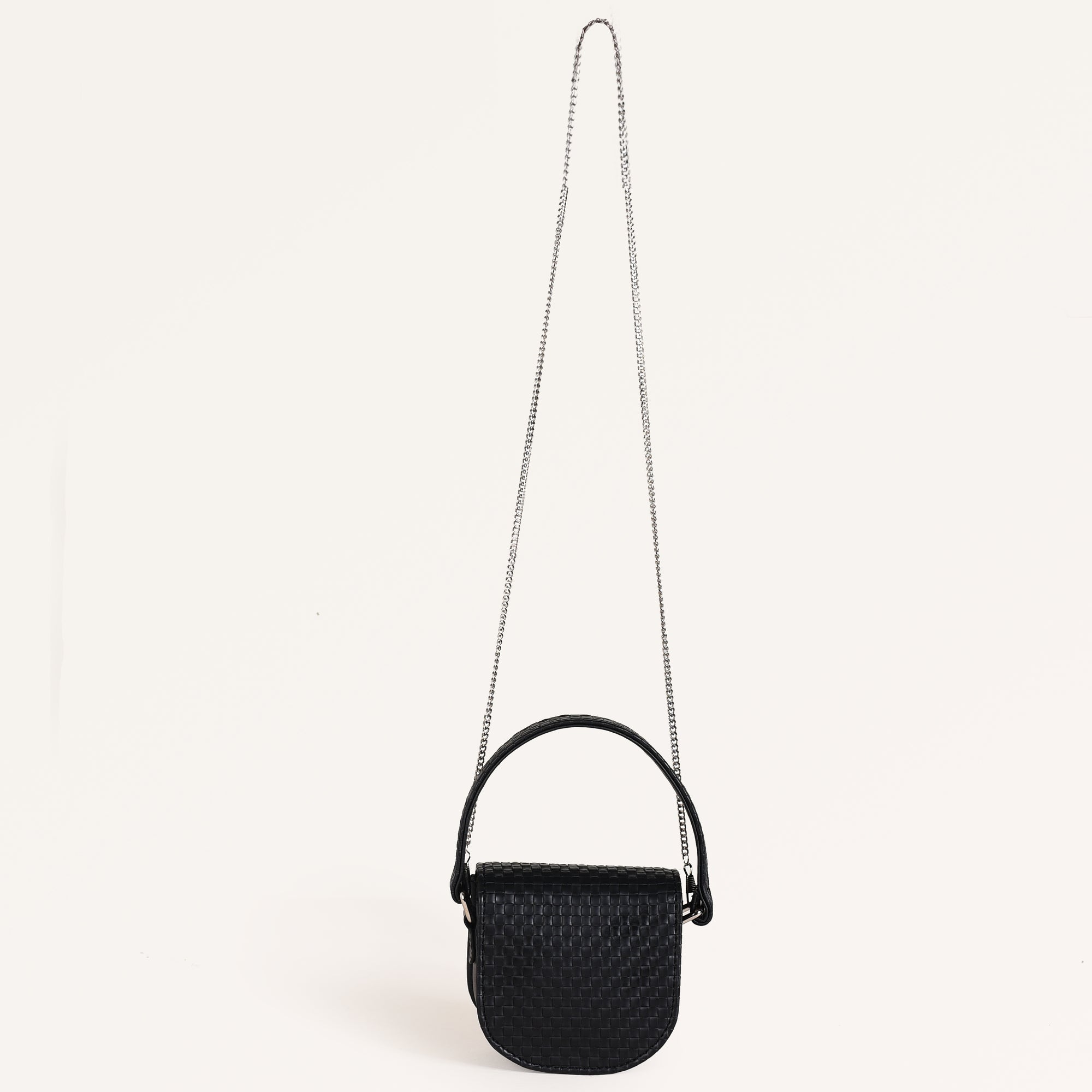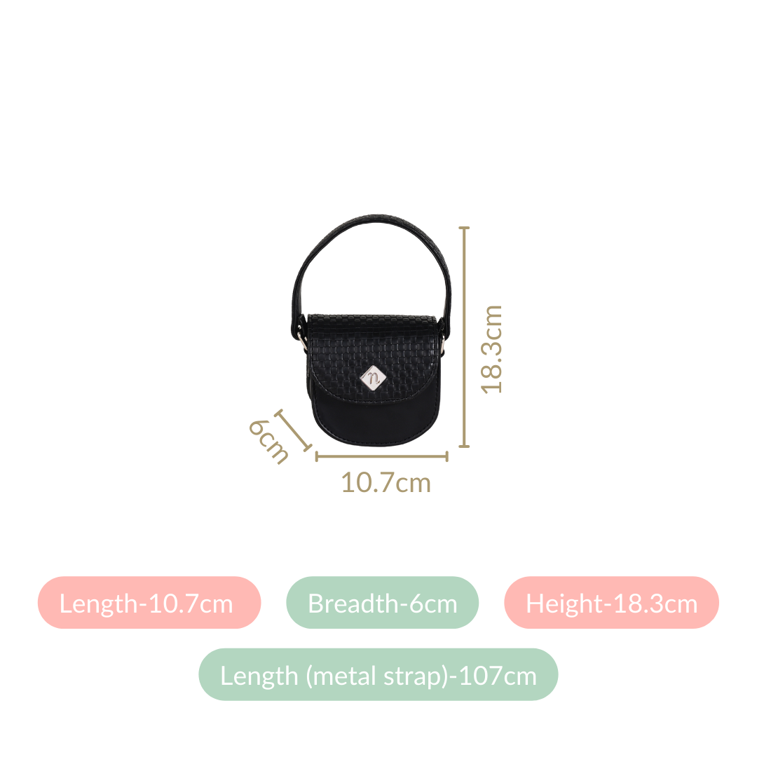 Design: Crafted from premium black PU leather, the Mini Saddle Bag is a statement piece that exudes luxury. The intricate Intrecciato weave design, adds a touch of sophistication to this compact accessory. Inside, the bag is lined with soft polyester, ensuring your belongings remain protected while on the go. The design is both functional and stylish, featuring two main compartments and a side compartment to keep your essentials organized. The metal, magnetic button closure offers secure access, while the detachable metal sling and small PU strap provide versatile carrying options. Whether you wear it as a mini sling bag for a day out or a sleek flap bag for an evening affair, this bag is the epitome of understated elegance.