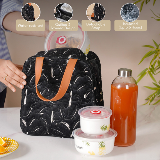 Our thermal-insulated, lavish black velvet lunch bag is the epitome of style and utility. Improve your lunch game with the chic lunch bag that combines the elegance of velvet with the practicality of thermal insulation. It is expertly made and keeps your meals at the perfect temperature while displaying your sense of flair. Thanks to two sturdy handles and an adjustable sling strap, carrying your daily meals has never been easier. Our velvet lunch bag is your trusted companion for work, school, or picnics.