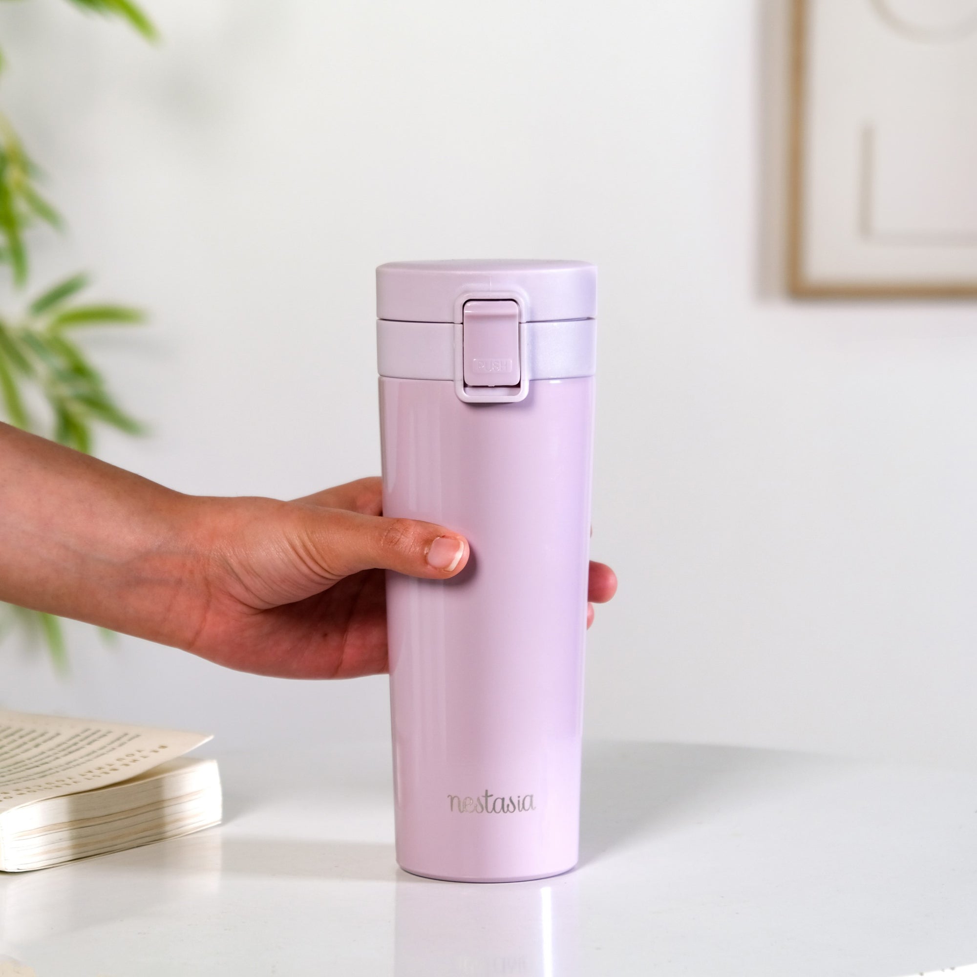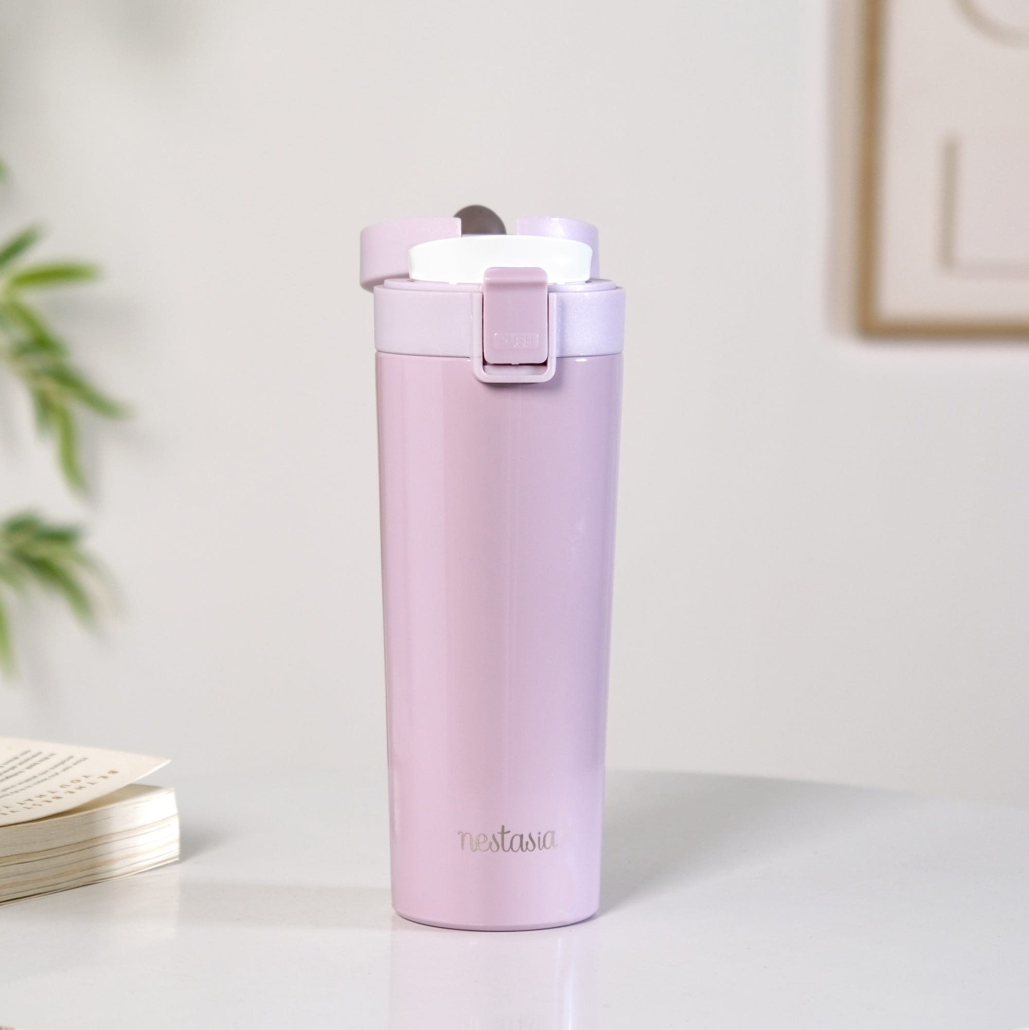 Design: With its smooth, glossy lavender finish, this insulated water bottle adds a pop of colour while maintaining a modern, minimalistic look. The wide-mouth design makes it easy to pour and clean, while the airtight, leakproof flip-open lid features a secure safety lock and a built-in 304 stainless steel mesh strainer, perfect for filtering tea leaves or fruit infusions. A foam-padded anti-skid base ensures stability on any surface.
