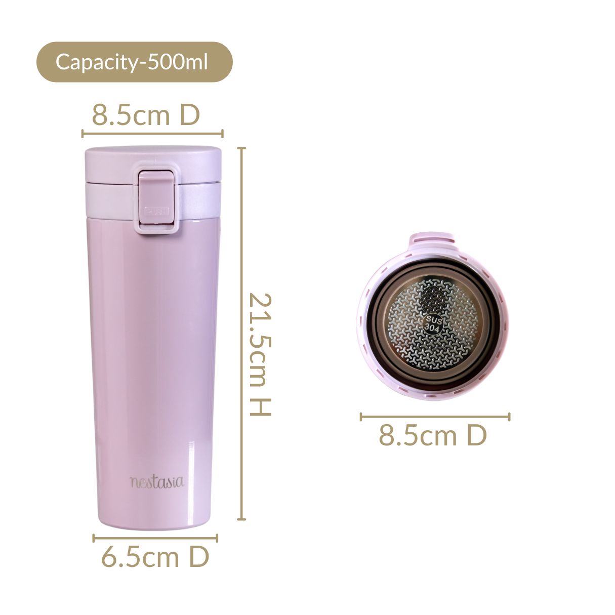 Size: Bottle- 8.5cm D (top) x 6.5cm D (base) x 21.5cm H, Capacity- 500ml Lid- 8.5cm D x 4.5cm H Colour: Lilac Mist Material: 304-grade stainless steel, 201-grade stainless steel, polypropylene (PP), silicone