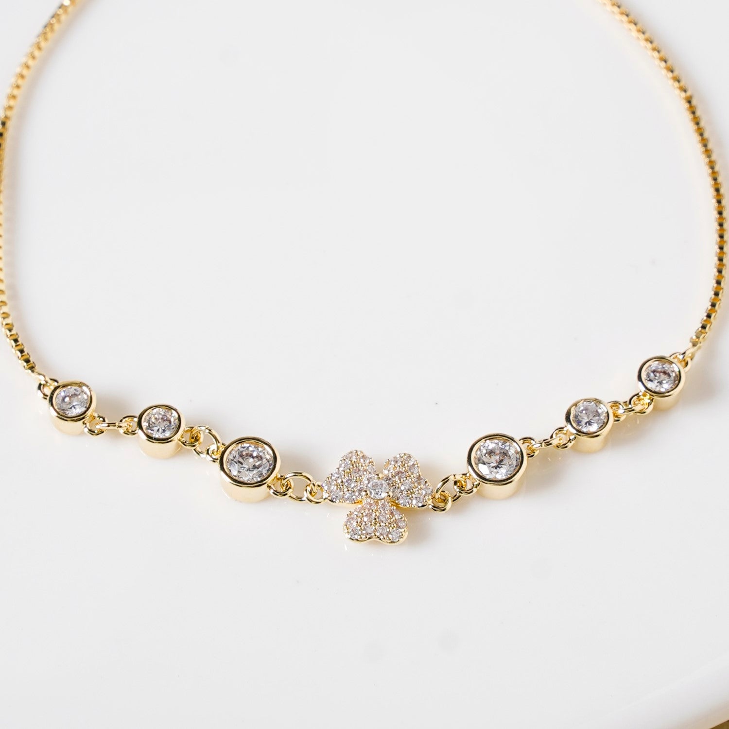 Gleaming with elegance, this gold-toned metal chain bracelet showcases a captivating three-leaf clover charm at the centre, adorned with sparkling stones. Each leaf is meticulously embellished, bringing a touch of sophistication to the design. Surrounding the charm, round stone-studded accents further elevate its beauty, creating a harmonious and chic look. Ideal for both casual and formal outfits, this chain bracelet adds a refined sparkle to any ensemble. With its secure fit and stylish charm, it’s a must-have accessory for those who appreciate timeless elegance.