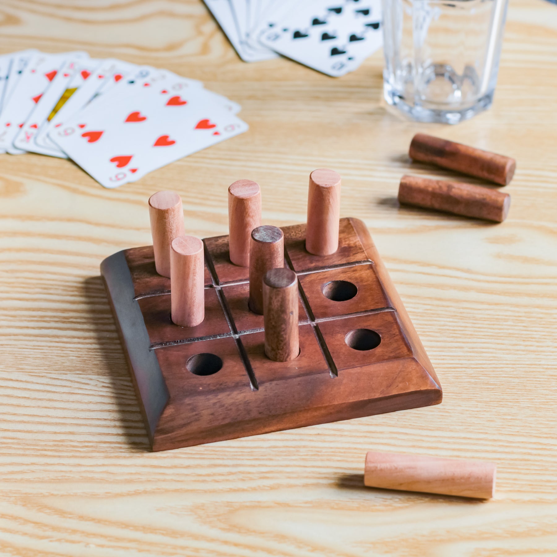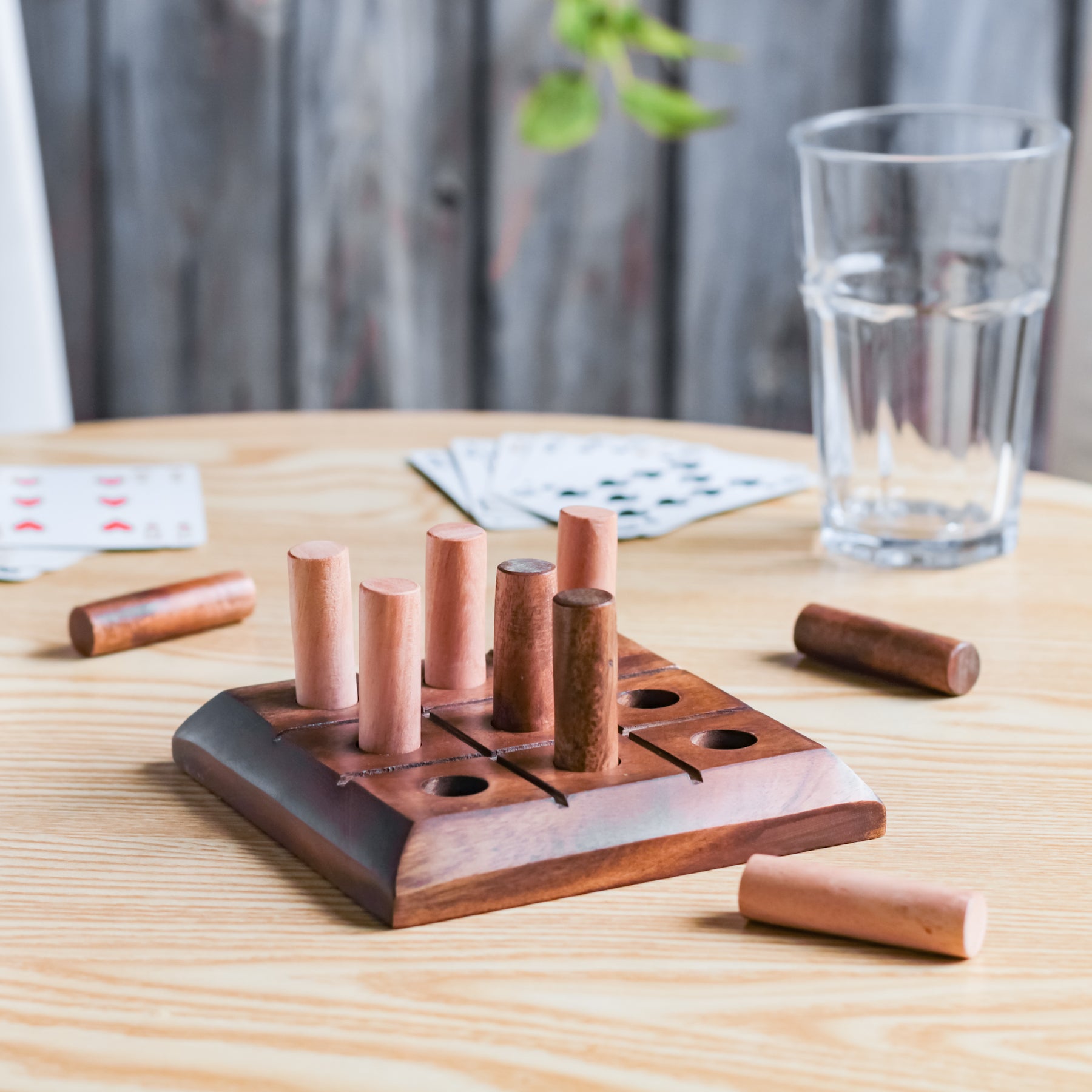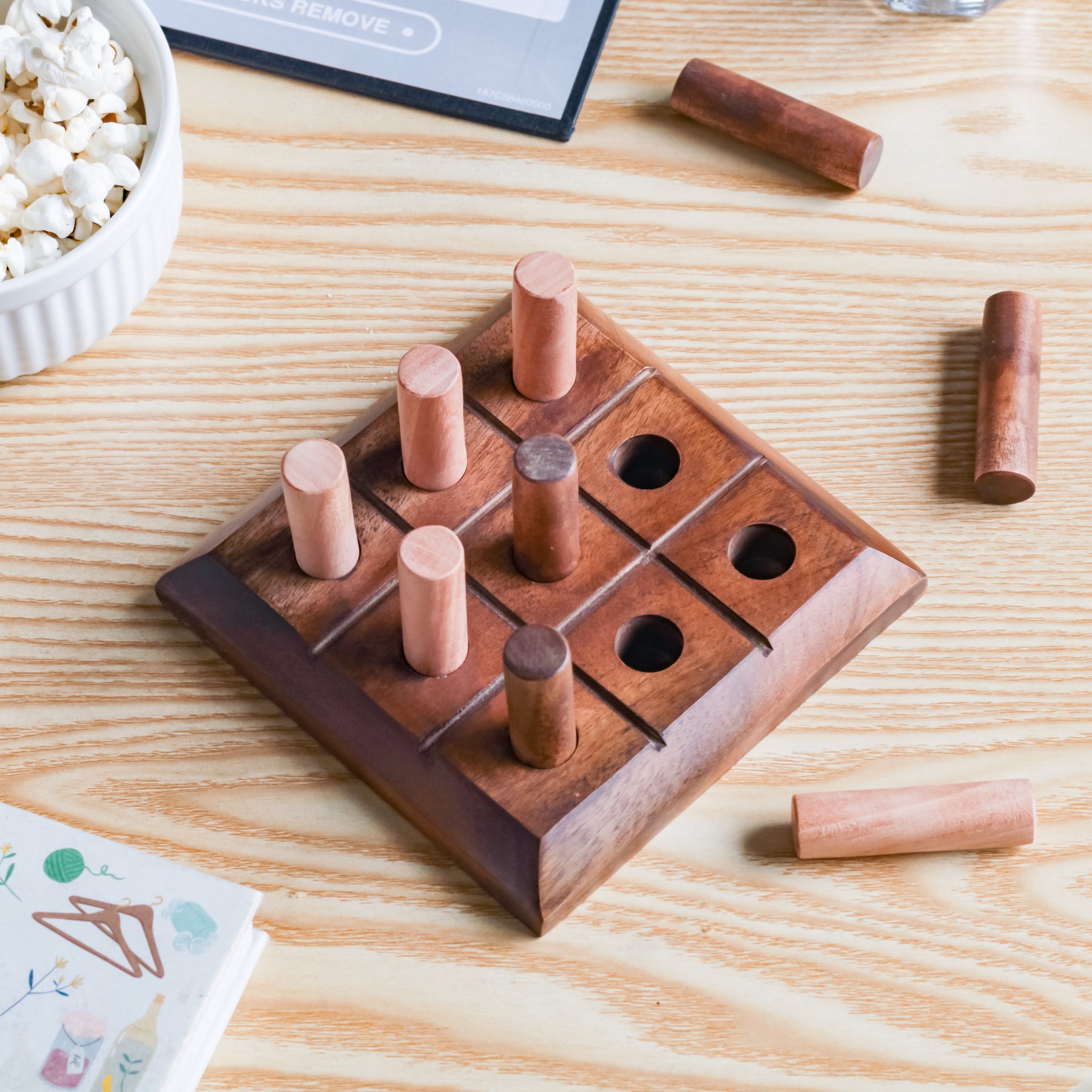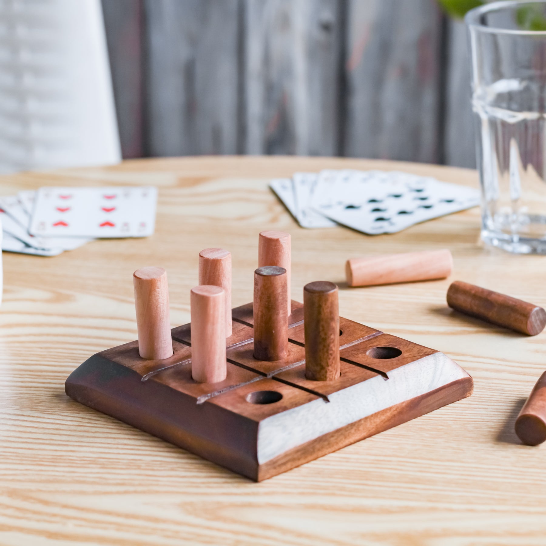 Board games just got a lot more interesting with the wooden noughts and crosses game. Crafted out of quality wood, the tic tac toe game is sure to bring back fond childhood memories. The set contains a wooden board with 9 small smooth cylindrical game pieces. The 4 dark colour wood and 5 light colour wood, separate the game set into noughts and crosses.