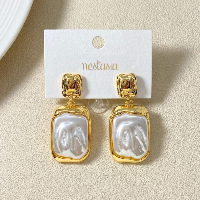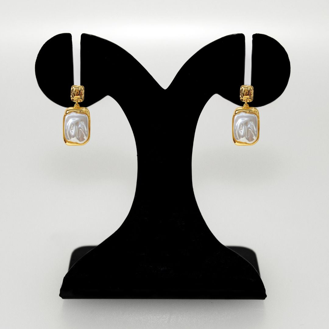 A vivacious interplay of texture and sheen brings together two of the most classic paired materials in the jewellery world. Inspired by the enigmatic beauty of the ocean, these dangle earrings capture the essence of its ever-changing textures and luminous depths. From the textured gold surfaces, reminiscent of sunlit ripples, to the lustrous faux pearl, every detail on these earrings is nothing short of captivating.