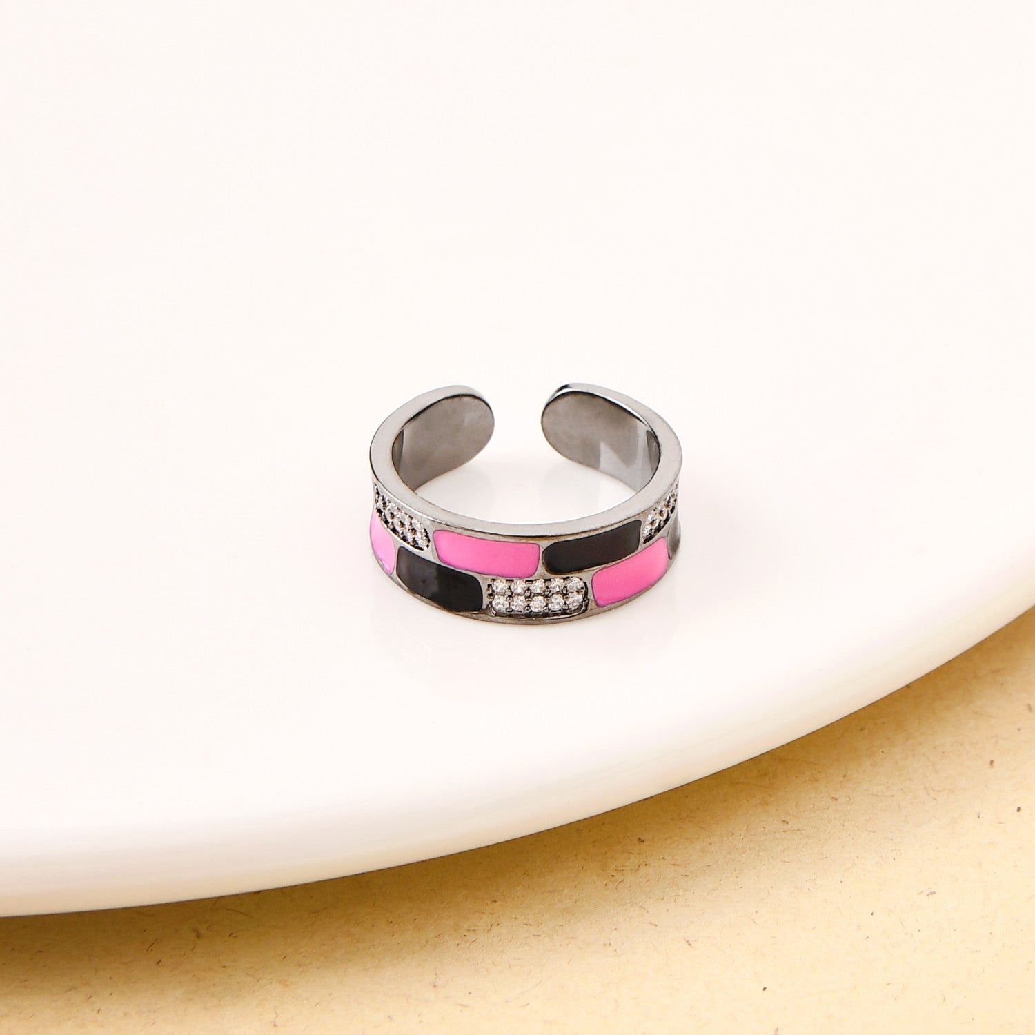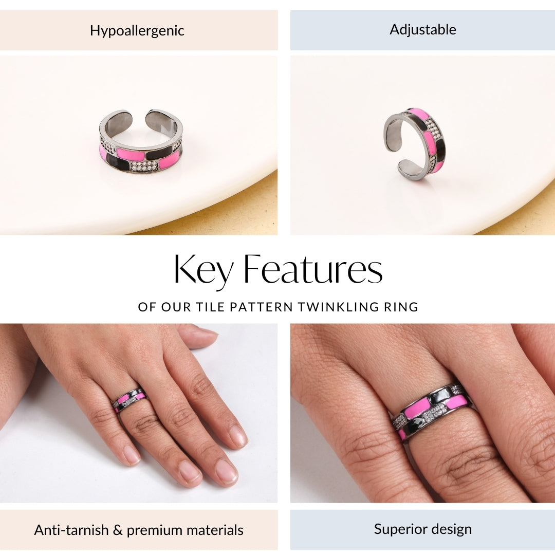 Perfectly imperfect, just like all great things in life! This oxidised silver ring turns a simple band into a canvas of colour and texture. Etched with a tile-like pattern, it plays with contrasts—sleek black, hot pink, and twinkling stone-studded tiles, all placed in a rhythmic dance. The mix of matte, shine, and shimmer gives it an effortless charm, making it a go-to piece for those who love jewellery with personality. Wear it solo for a bold statement or stack it up for a touch of playful elegance.