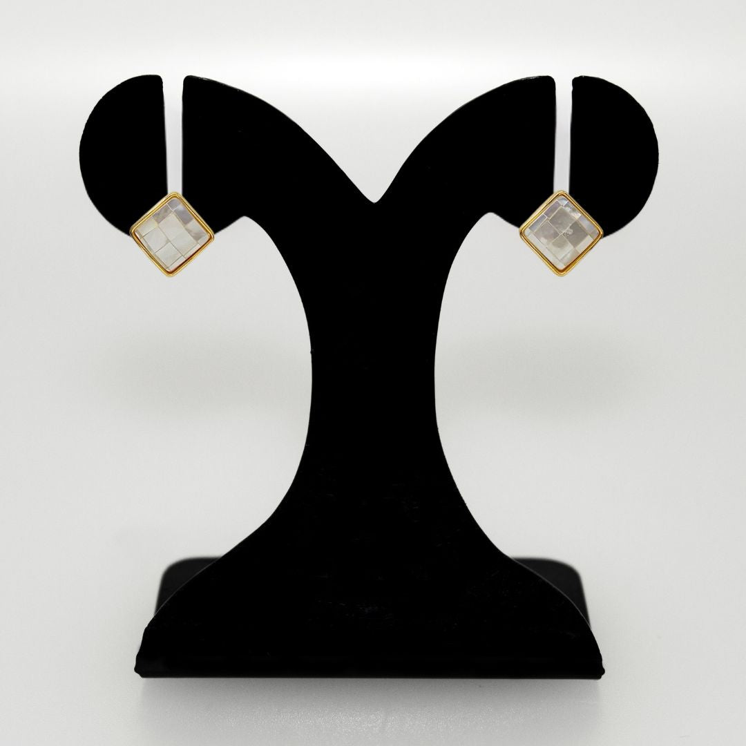 Capturing one of the most classic pairings in the jewelry world, these square studs exude effortless elegance. A constant source of inspiration, the mysterious depths of the ocean, are reflected in their timeless design. The sleek gold frame delicately surrounds a tiled faux pearl center, creating a refined yet captivating piece. Perfect for adding a touch of grace to any occasion.