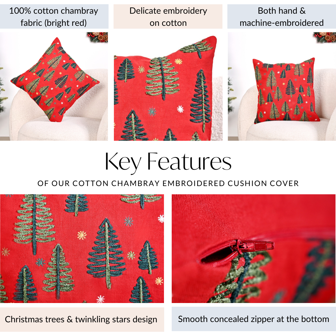 Design: With delicately embroidered Christmas trees and twinkling stars, this sofa cushion cover brings the spirit of the festive season to life. The blend of hand and machine embroidery adds dimension to the cotton chambray fabric, giving it a charming, artisanal feel. A smooth, concealed bottom zipper keeps the look seamless, making it easy to refresh your Christmas decorations.