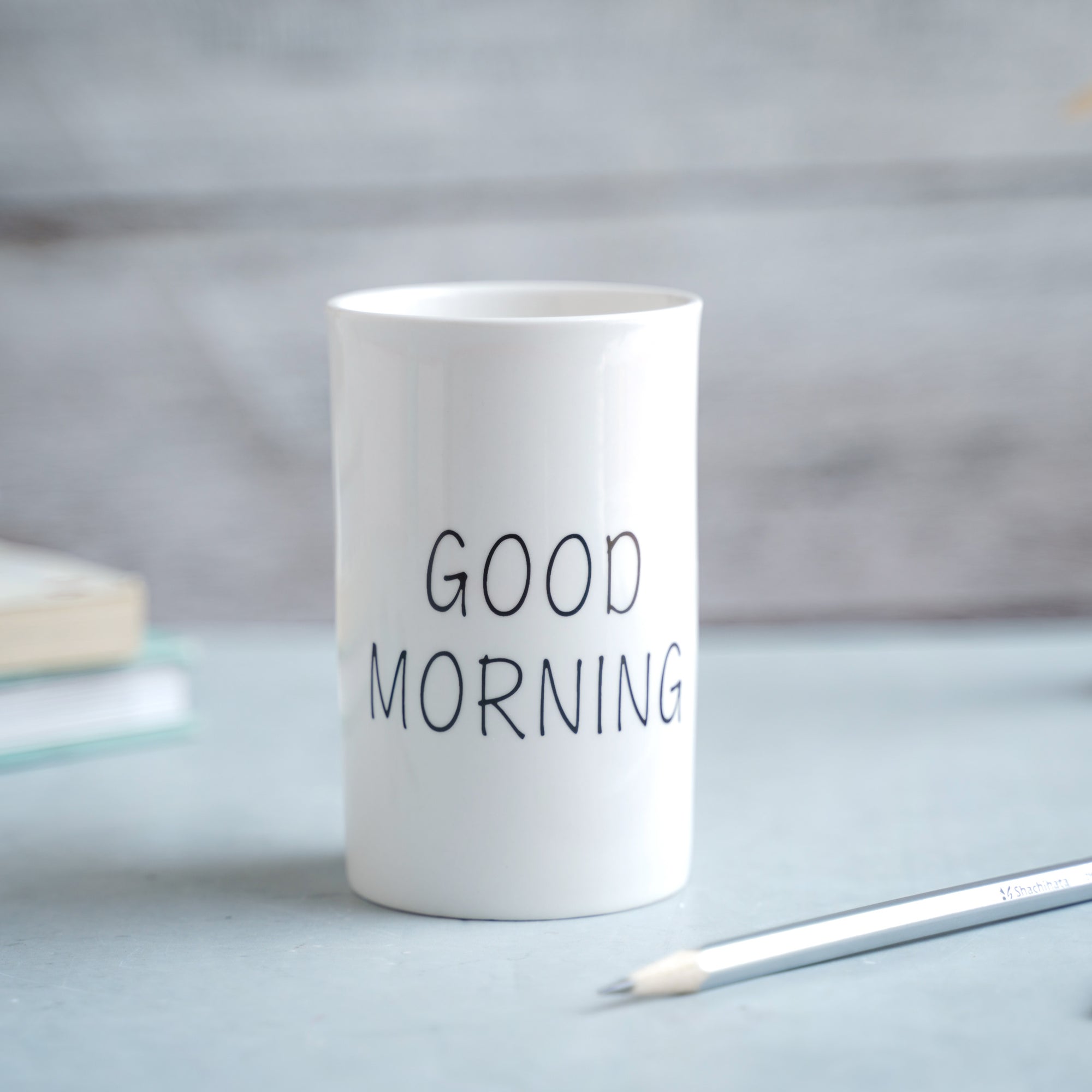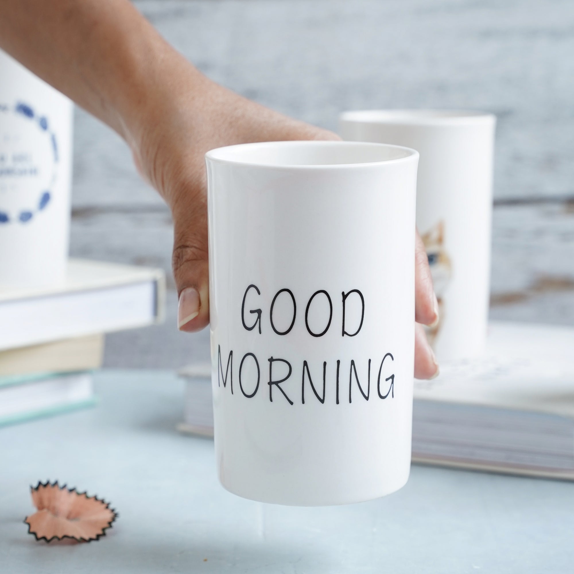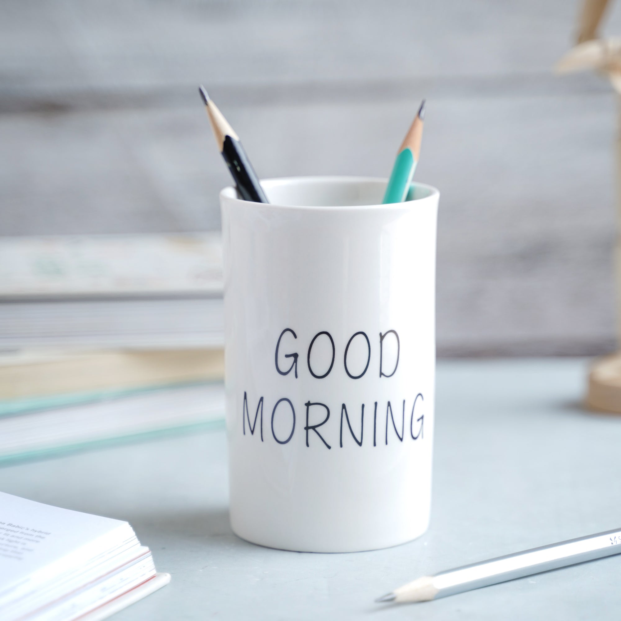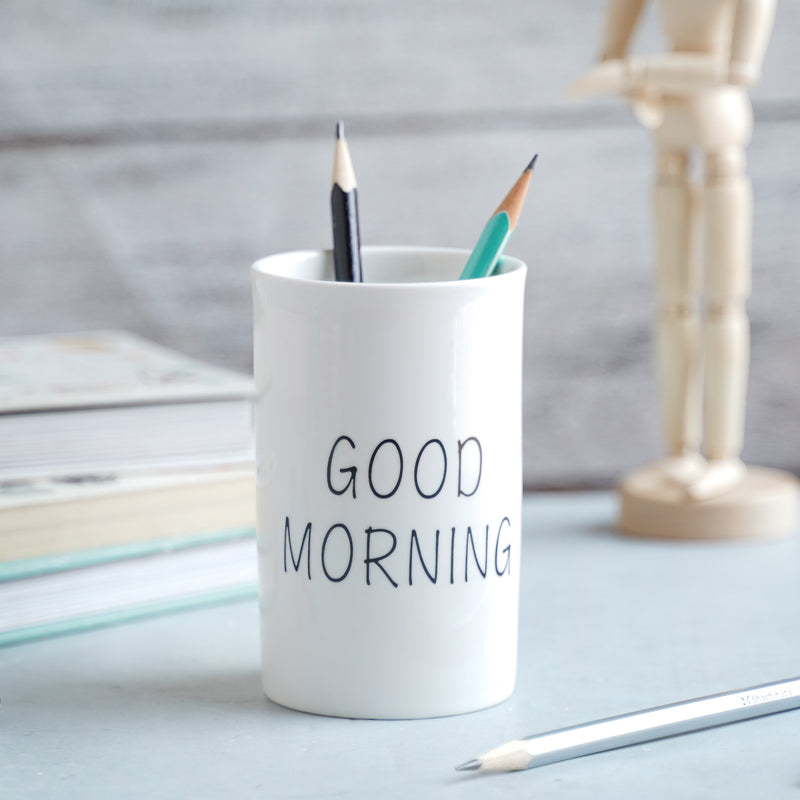 A nice way to start the day is with the white toothbrush holder wishing a Good Morning. The holder cup is made entirely of ceramic and has a polished white finish. It can be additionally kept on the bedside table and used to keep retainers.